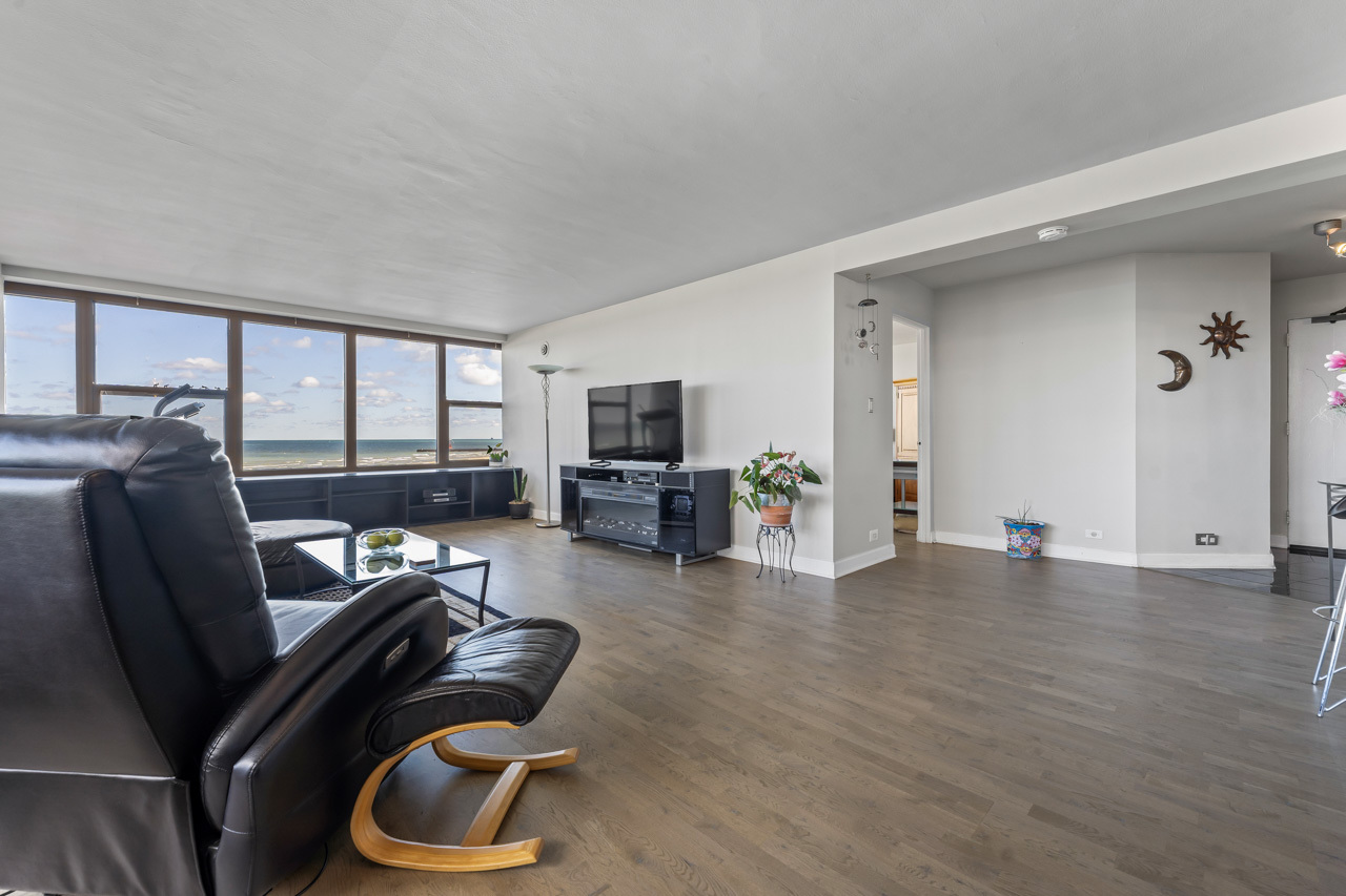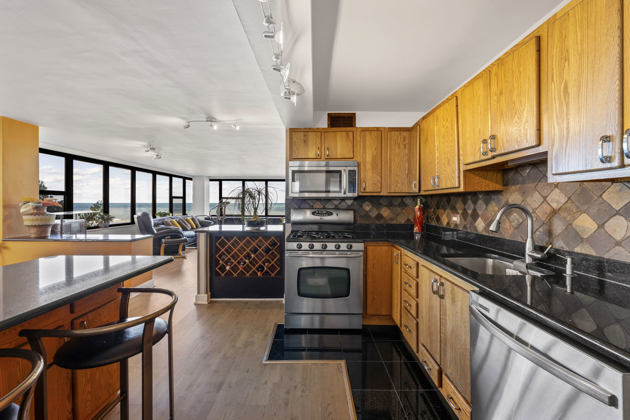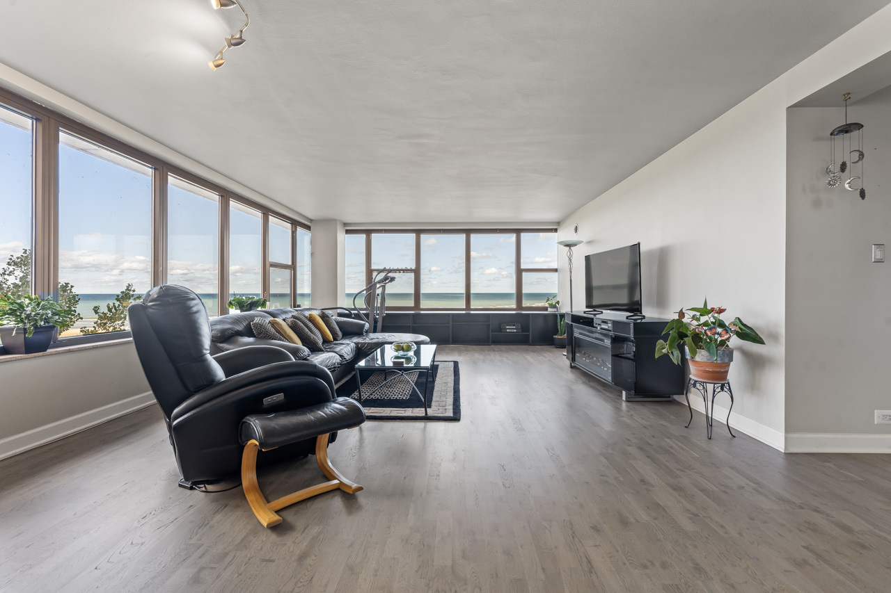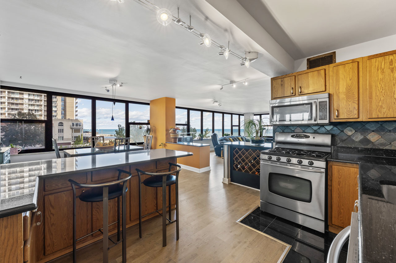 Wake up every morning to stunning lake views from this spacious 2-bedroom, 2-bath residence at 5801 N Sheridan Rd – one of the largest layouts in the building, offering approximately 1,600 square feet of comfortable living space. Enjoy the rare combination of a serene East Lake exposure and an unbeatable location where the beach truly feels like your front yard. The expansive living room is filled with natural light, perfect for relaxing or entertaining, while the updated kitchen showcases granite countertops, stainless steel appliances, and a separate dining area ideal for gatherings. Both bedrooms are generously sized with beautifully finished vinyl floors, and the porcelain-tiled foyer adds a sleek touch upon entry. Residents appreciate convenient building amenities including a welcoming outdoor patio with grilling area, a private party room, and on-site laundry. Garage parking with valet service is also available. Step outside and explore everything Edgewater has to offer – from direct access to the lakefront paths perfect for biking, running, or evening strolls, to the easy walk to nearby shops, cafes, and CTA Red Line stops. A front door pickup for express bus service to downtown makes commuting simple and stress-free. This east-facing unit combines the comfort of city living with the tranquility of lakeside life – truly a rare find in one of Chicago’s most desirable north-side communities.