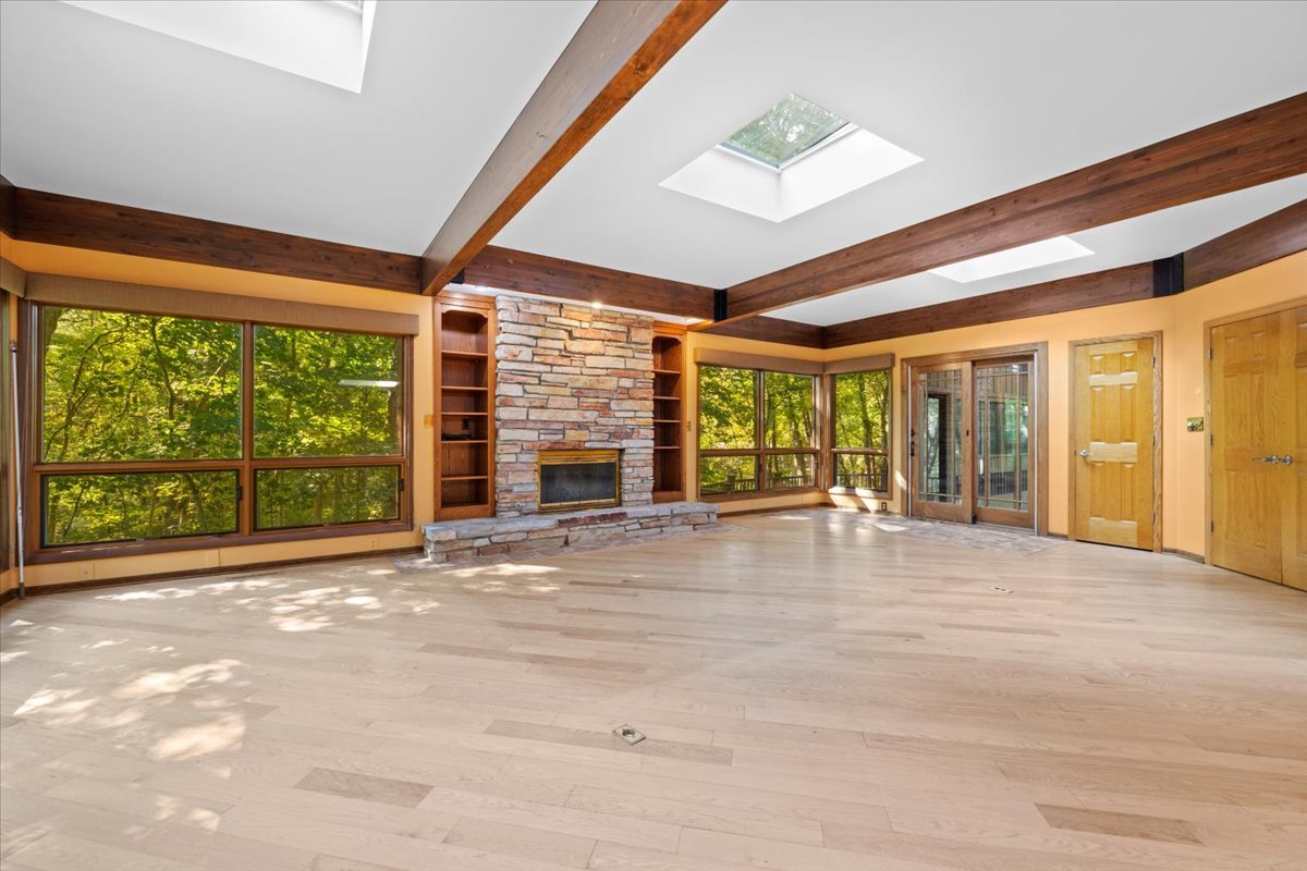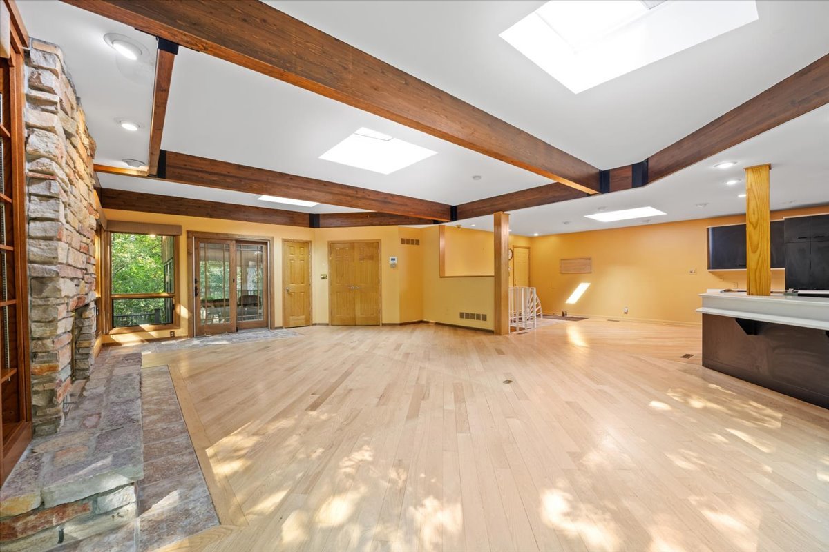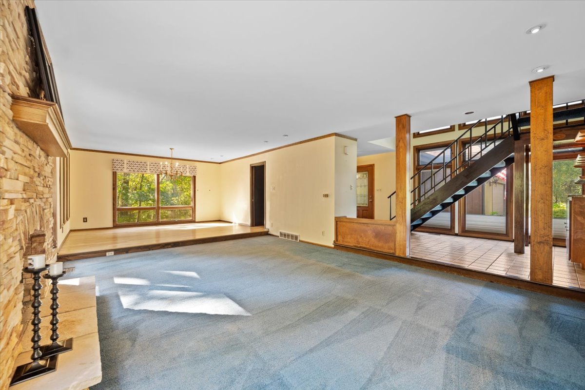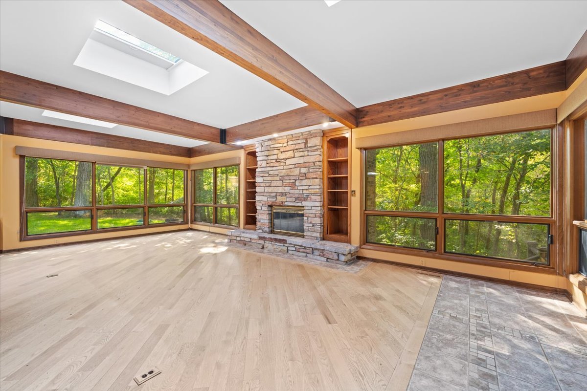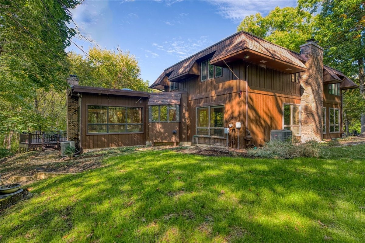 Nestled on a beautiful 1.6 acre wooded lot, this spacious home offers a balance of peaceful tranquility and comfortable living and is perfect for entertaining. The flexible floor plan provides a wonderful flow from the large family room that opens to the screened-in porch to the inviting living room with a second fireplace that connects seamlessly to the main living areas. A private first-floor den and an additional office nook off the family room offer two ideal work-from-home options, or versatile spaces to suit your lifestyle needs. The newer kitchen features solid surface countertops and opens to the expansive family room, creating the heart of the home. The newer remodeled primary bath is beautifully designed with heated floors and is handicap accessible. Step into the private screened-in porch and out to the Trex deck, perfectly nestled among the trees – a serene retreat for morning coffee or evening gatherings. The basement provides a blank canvas, ready for your personal touch and future possibilities. While this is an ESTATE SALE BEING OFFERED IN AS IS CONDITION, the sellers have provided valuable updates and information: dual HVAC systems, new sump pump (2020), new water heater (2025), new septic (2025), new retaining wall (2025), and most windows have been replaced. Experience your own private oasis – a property that feels worlds away, yet close to everything you need.