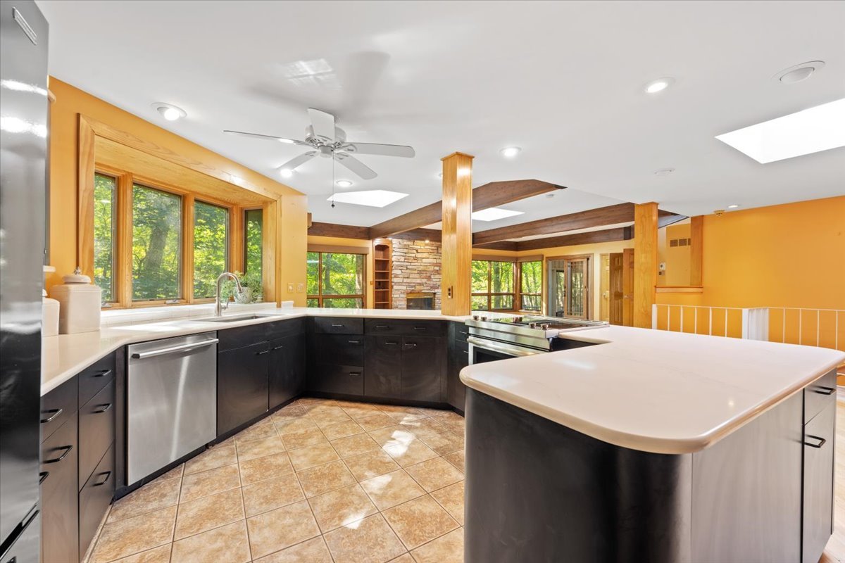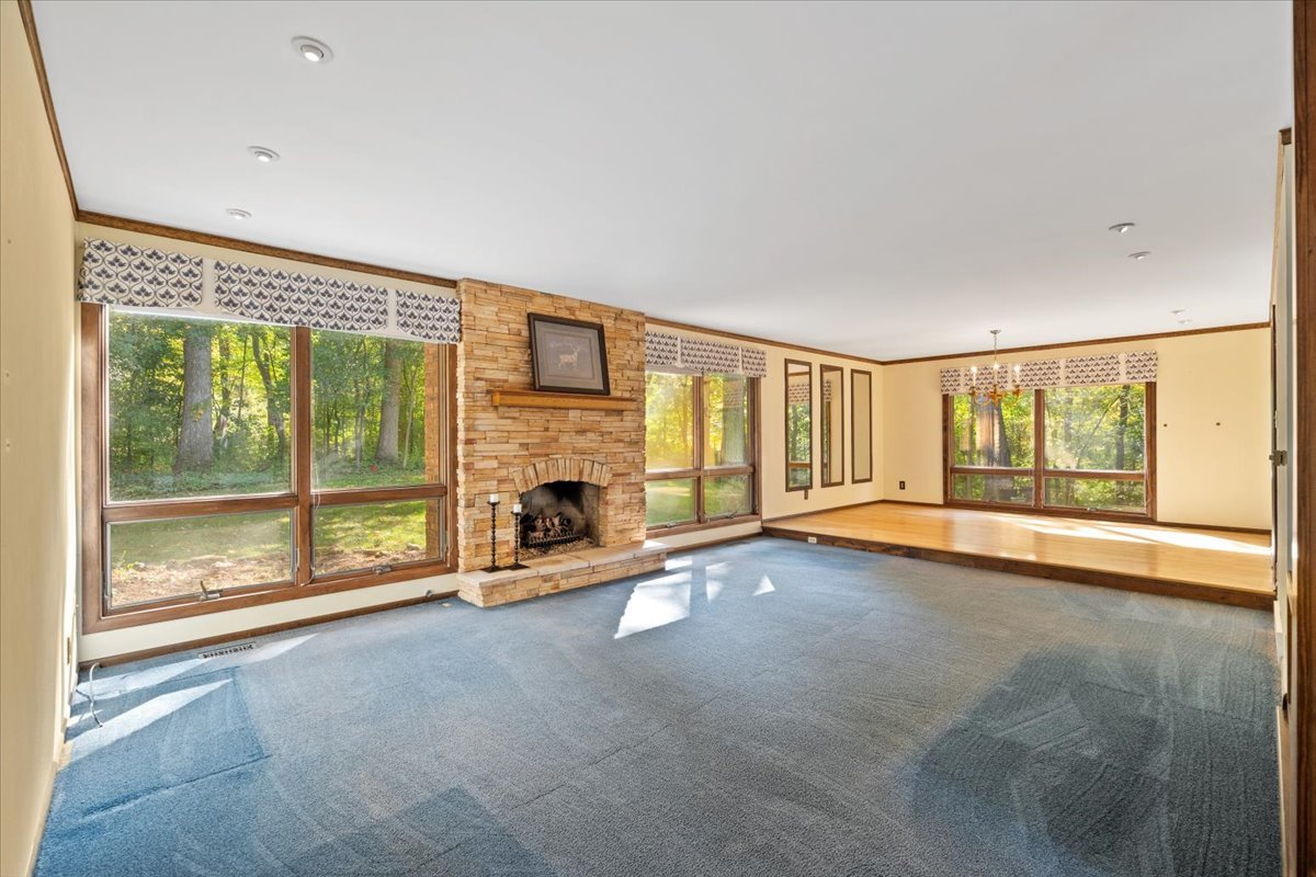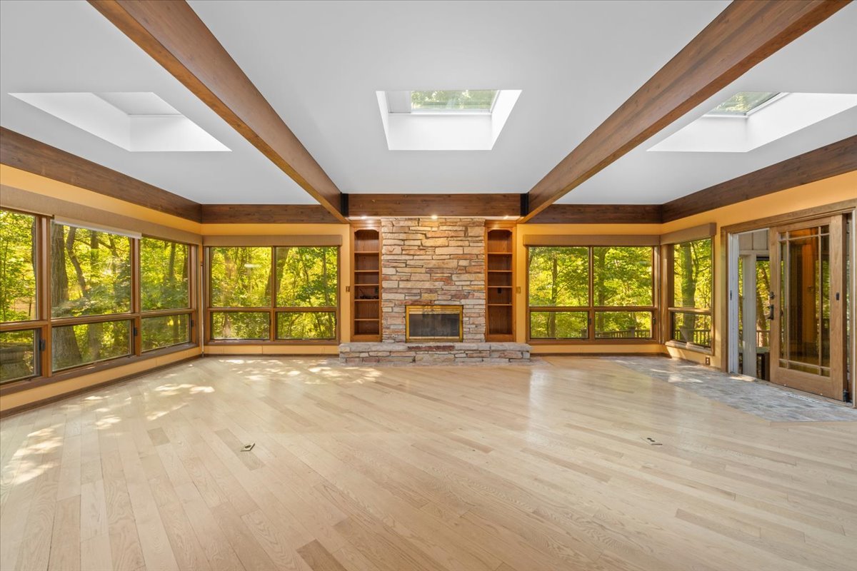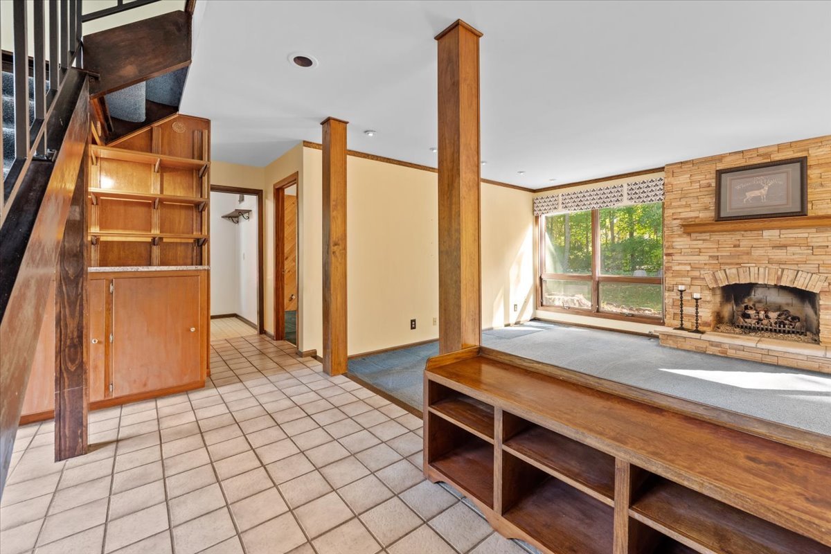 Nestled on a beautiful 1.6 acre wooded lot, this spacious home offers a balance of peaceful tranquility and comfortable living and is perfect for entertaining. The flexible floor plan provides a wonderful flow from the large family room that opens to the screened-in porch to the inviting living room with a second fireplace that connects seamlessly to the main living areas. A private first-floor den and an additional office nook off the family room offer two ideal work-from-home options, or versatile spaces to suit your lifestyle needs. The newer kitchen features solid surface countertops and opens to the expansive family room, creating the heart of the home. The newer remodeled primary bath is beautifully designed with heated floors and is handicap accessible. Step into the private screened-in porch and out to the Trex deck, perfectly nestled among the trees – a serene retreat for morning coffee or evening gatherings. The basement provides a blank canvas, ready for your personal touch and future possibilities. While this is an ESTATE SALE BEING OFFERED IN AS IS CONDITION, the sellers have provided valuable updates and information: dual HVAC systems, new sump pump (2020), new water heater (2025), new septic (2025), new retaining wall (2025), and most windows have been replaced. Experience your own private oasis – a property that feels worlds away, yet close to everything you need.