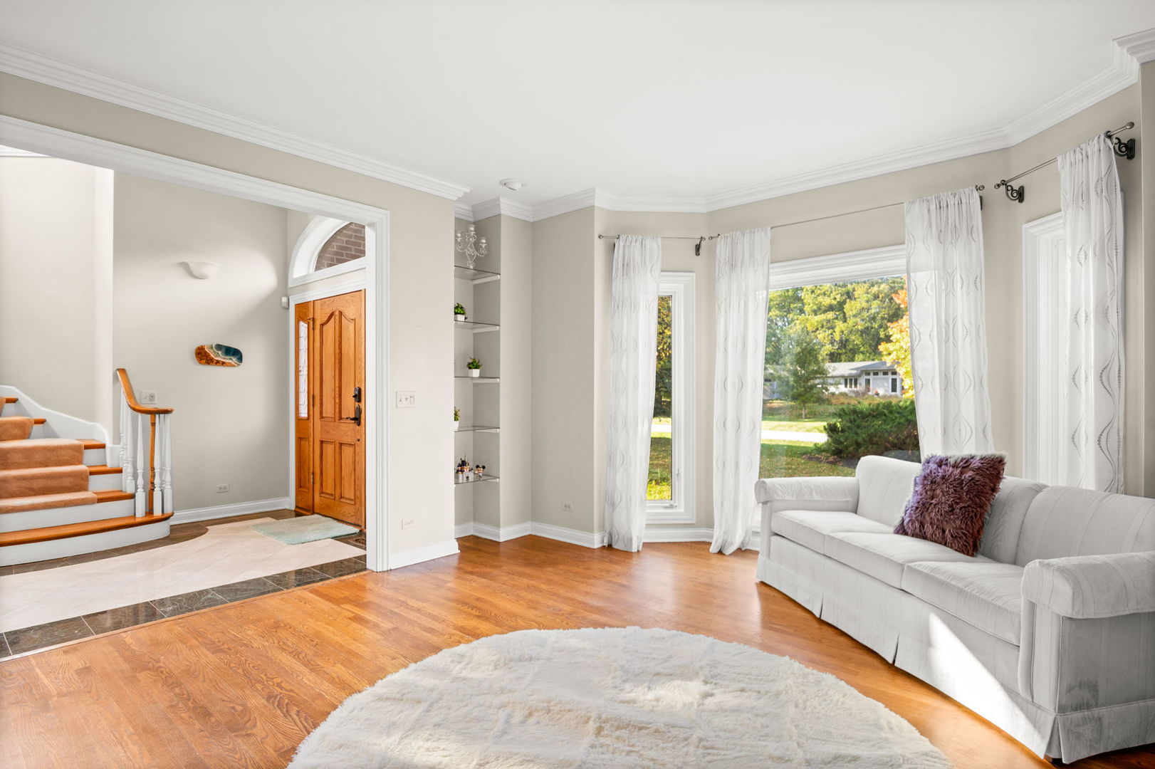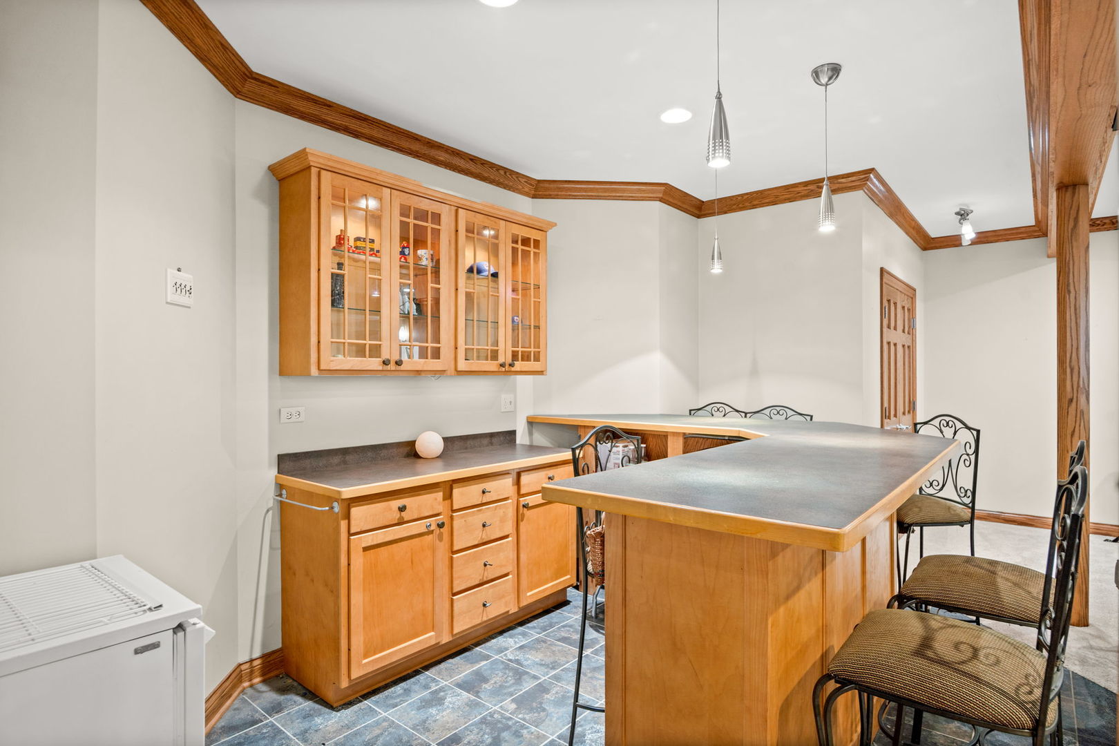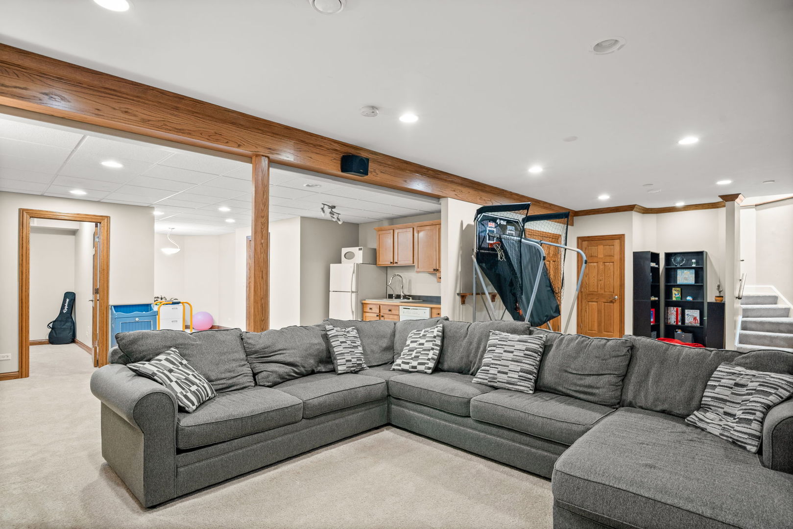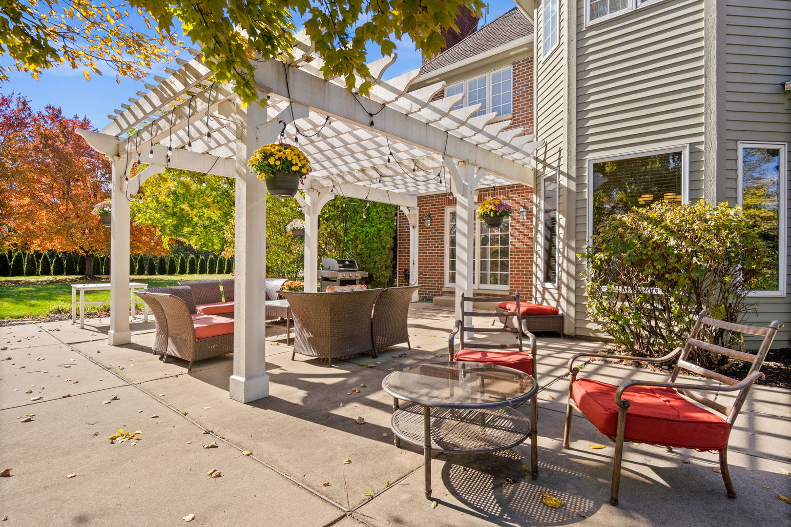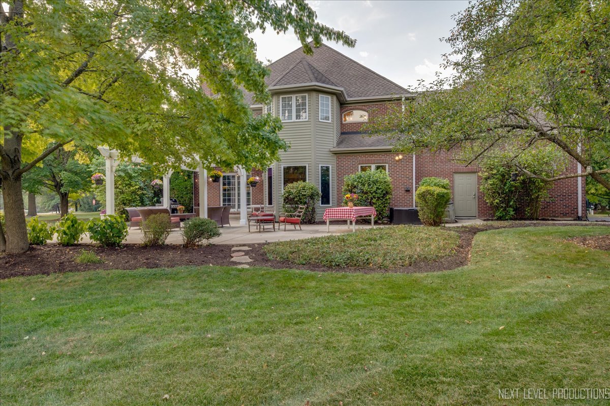 Set on a picturesque over one-acre lot in the established Baker Acres neighborhood of St. Charles, this brick and cedar two-story offers over 4,600 square feet of beautifully updated living space. Private backyard enclosed by arborvitae trees and lush landscaping. Mature trees, a spacious patio with pergola, and a three-car side-load garage enhance its curb appeal, while inside, hardwood flooring and detailed trim flow throughout the main level. The layout includes a bayed living room, formal dining room, and an eat-in kitchen with recessed lighting, tile backsplash, under-cabinet lights, and a island with new countertop and high-end stainless steel appliances. The family room features a gas log fireplace with remote start and wet bar, creating an inviting space to gather. Upstairs, four bedrooms (all with walk-in closets) include a luxurious primary suite with a tray ceiling, luxury vinyl plank flooring, 2nd fireplace, and a spa-like bath with whirlpool tub and updated shower, while two additional bedrooms also feature new vinyl plank floors. Expansive 4th bedroom! The finished basement expands the living area with a fifth bedroom, full bath, rec room, kitchenette, and bar. Modern updates include all upgraded mechanicals, a 2024 HVAC system, smart thermostat, EV charger, Pella windows, new reverse osmosis water filtration system, buried sump pump line and new well, all just minutes from the best of St. Charles living.