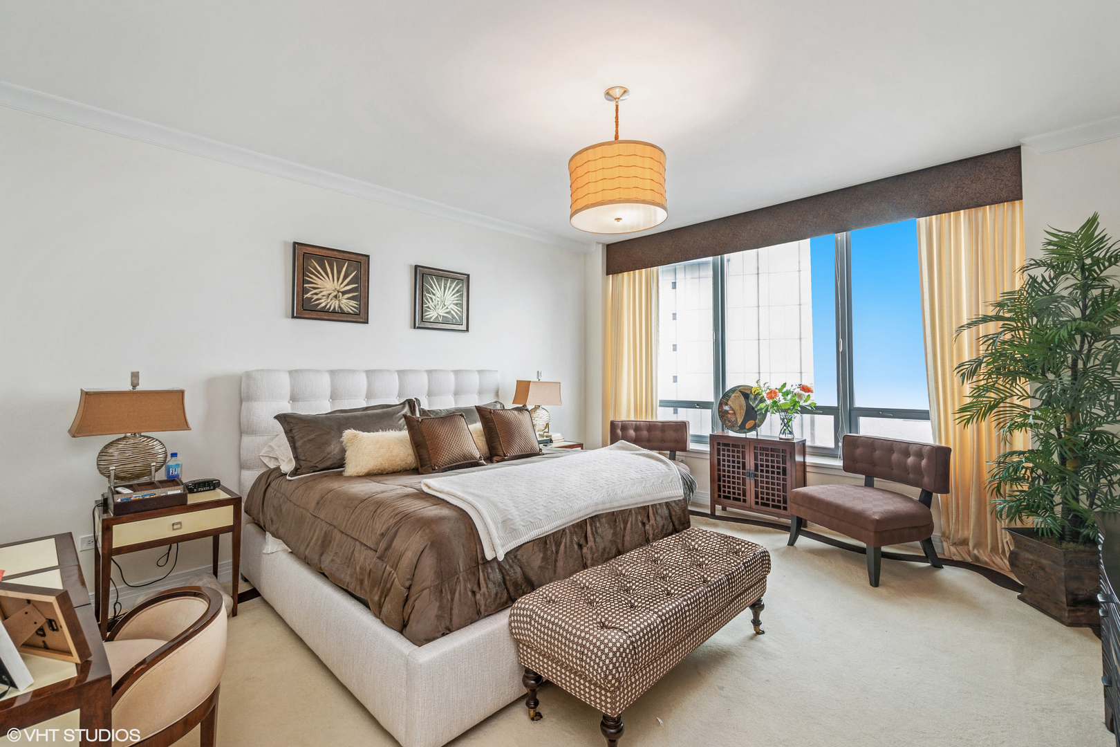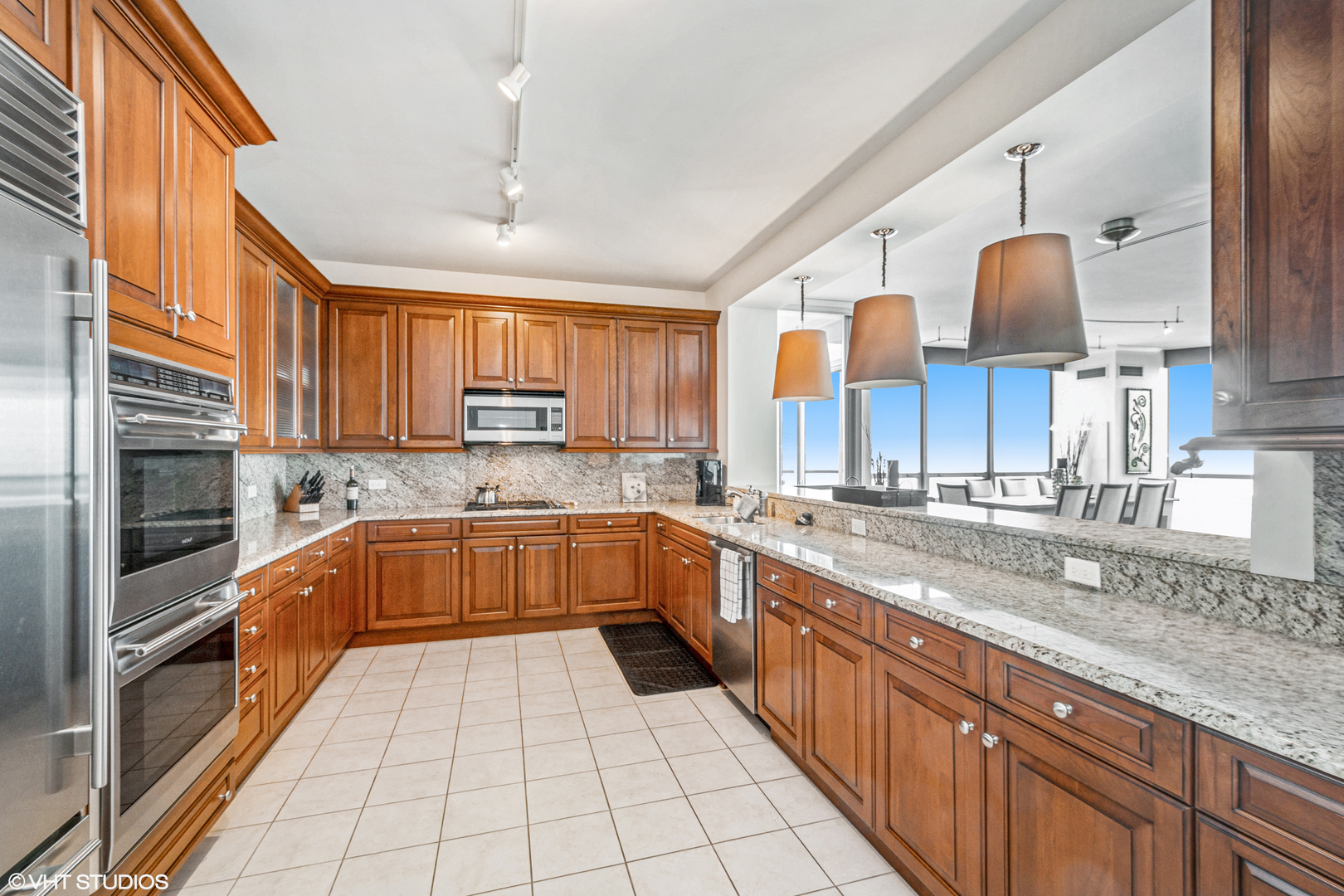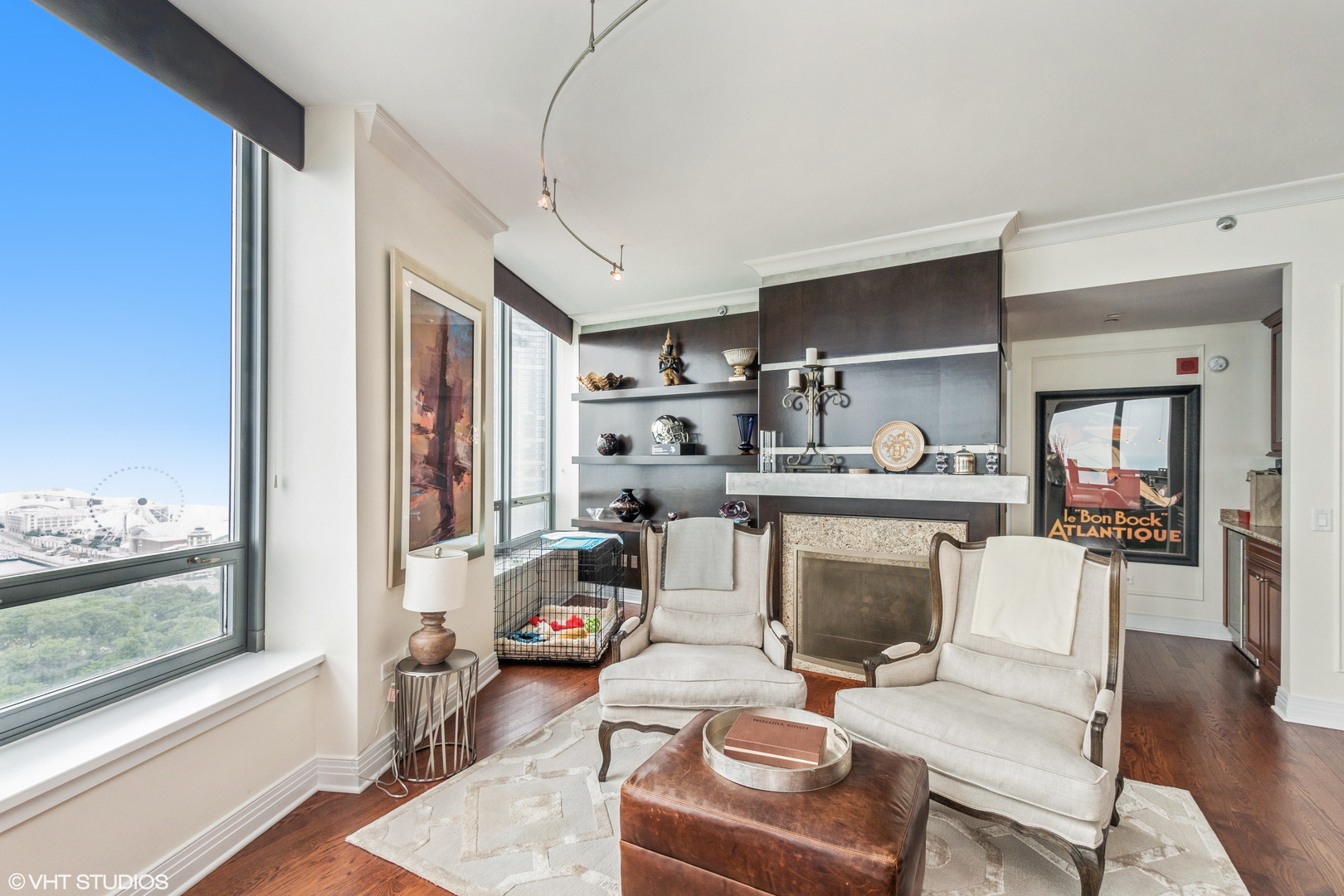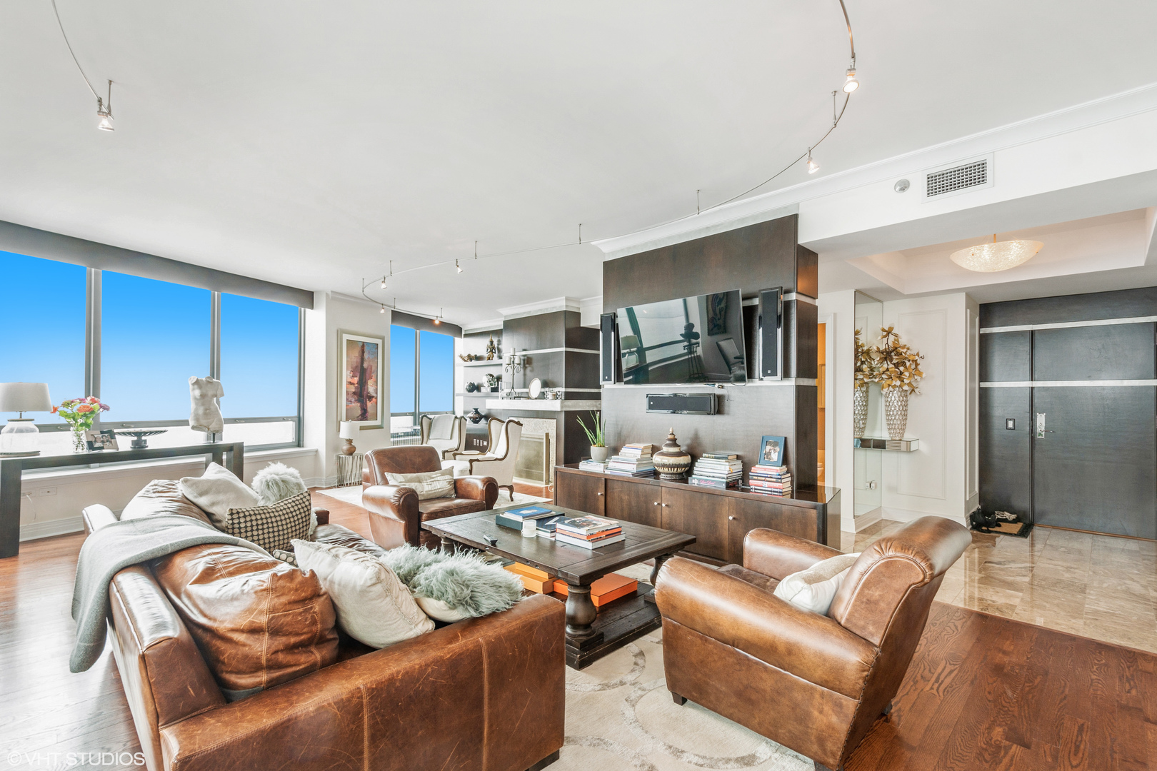 This rarely available large 3 bed 3.5 bath northeast corner residence features sprawling lake views along with Ohio St beach, Olive Park, and Navy Pier. Luxury living awaits, with spectacular northeast water views, custom flooring, crown molding and interior wall trim throughout, premium chef’s kitchen, and its desirable split bed floor plan with abundant space, this condo is a destination property in the north tower at 600 Lake Shore Drive! With the open living/dining/kitchen floor plan, entertain with ease. An elegant overhead light fixture greets you upon entering, with custom marble flooring extending from the foyer into the hallway, leading to rich hardwood flooring in the living/dining area. The spacious living/dining area features crown molding along with overhead track lighting looping throughout the entire seating area with a custom floor-to-ceiling entertainment cabinet as a dramatic focal point in the room. This living/dining area also flows into an ideal seating area for enjoying a book by the custom gas fireplace with attached custom shelving and sweeping lake views. A conveniently located bar including built-in cabinets with custom glass doors and a wine fridge for yours and guests’ enjoyment allowing a nightcap to end the day. Enjoy your morning coffee, or the evening nightcap on the north-facing private balcony with its calming lake views. Create culinary magic for guests in the enormous kitchen, boasting premium appliances including SubZero refrigerator, Bosch dishwasher, Wolf double oven, and Dacor microwave. You’ll love the custom track lighting, custom backsplash, granite countertops, and rich cherry cabinetry featuring custom glass fronts. The oversized breakfast bar easily accommodates 4 full size seats and offers custom overhead lighting. The lavish master suite also offers lake views, custom carpet, crown molding, overhead custom light fixture, in-wall speakers, and features two large custom-built walk-in closets. The ensuite private master bath includes soaking tub with custom faucets, glass-surround walk-in shower with floor-to-ceiling marble, and dual vanity with custom faucets and all marble surrounds. The second bedroom also features custom carpet, north views, along with a custom walk-in closet and private balcony access. The second bath features marble flooring, along with a walk-in shower. The third bedroom, which can also serve as a den/home office, features lake and Navy Pier views and includes custom carpet, overhead custom light fixture, along with an ensuite bath featuring custom marble walk-in shower. The powder room is conveniently located off the foyer for guests which features a custom pedestal sink and designer mirror. The laundry room is off of the kitchen and accommodates a full-size side-by-side washer and dryer. This magnificent residence which exudes style and is loaded with upgrades could be yours! Prime low floor parking spots 459 is included in the price!