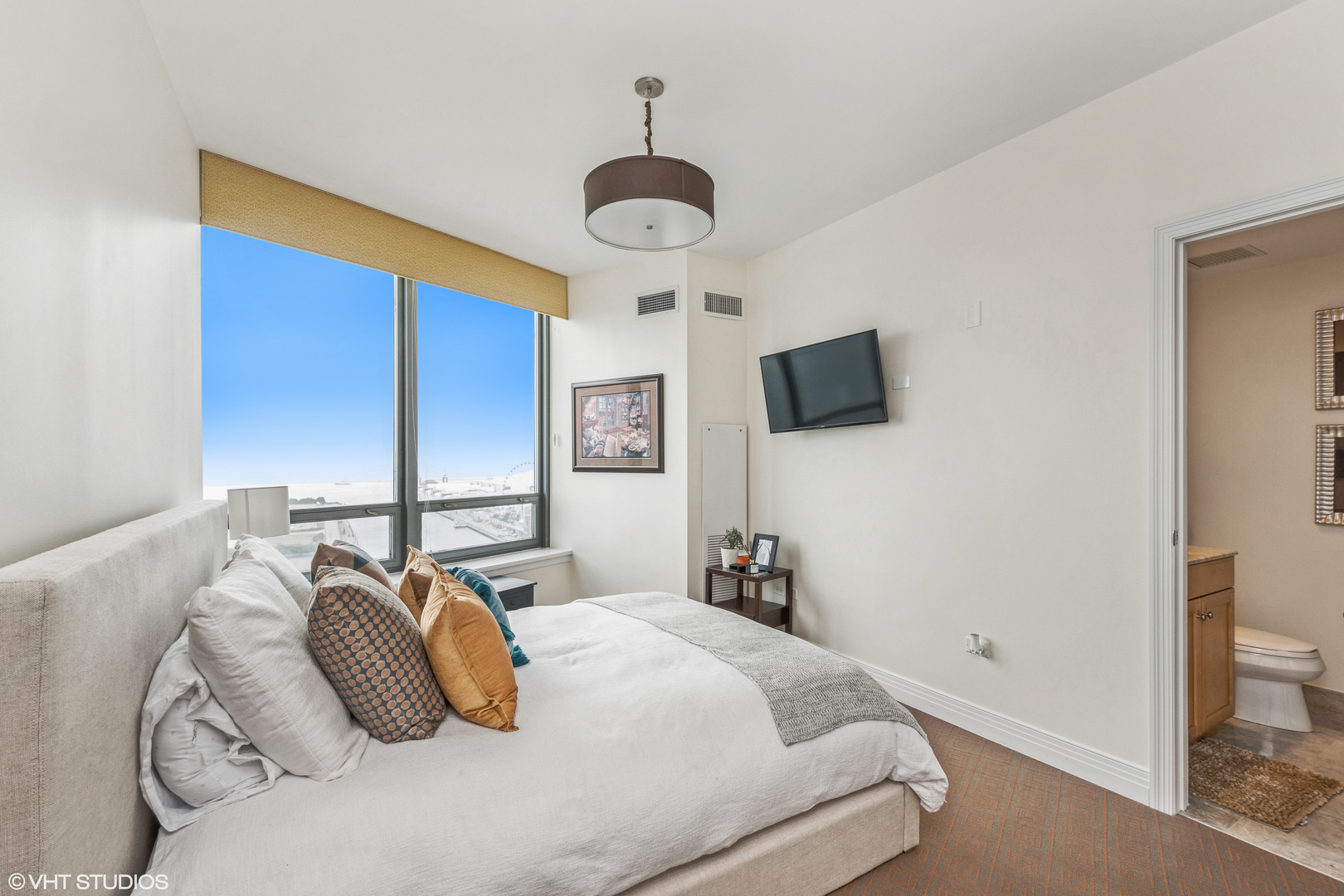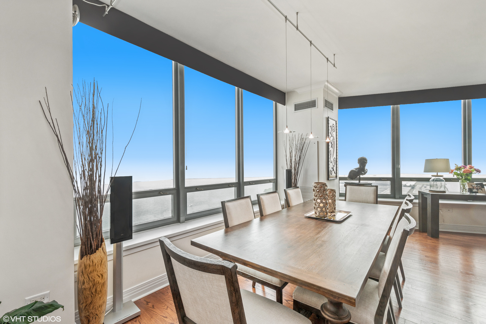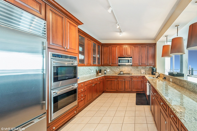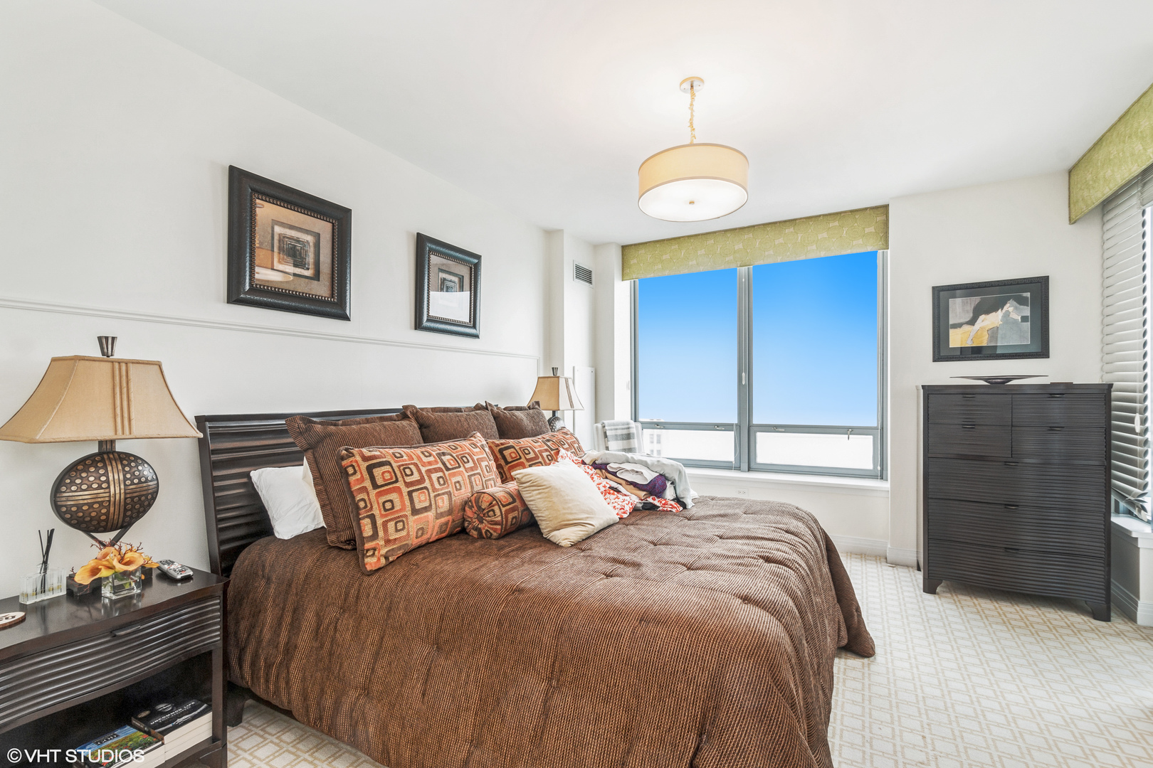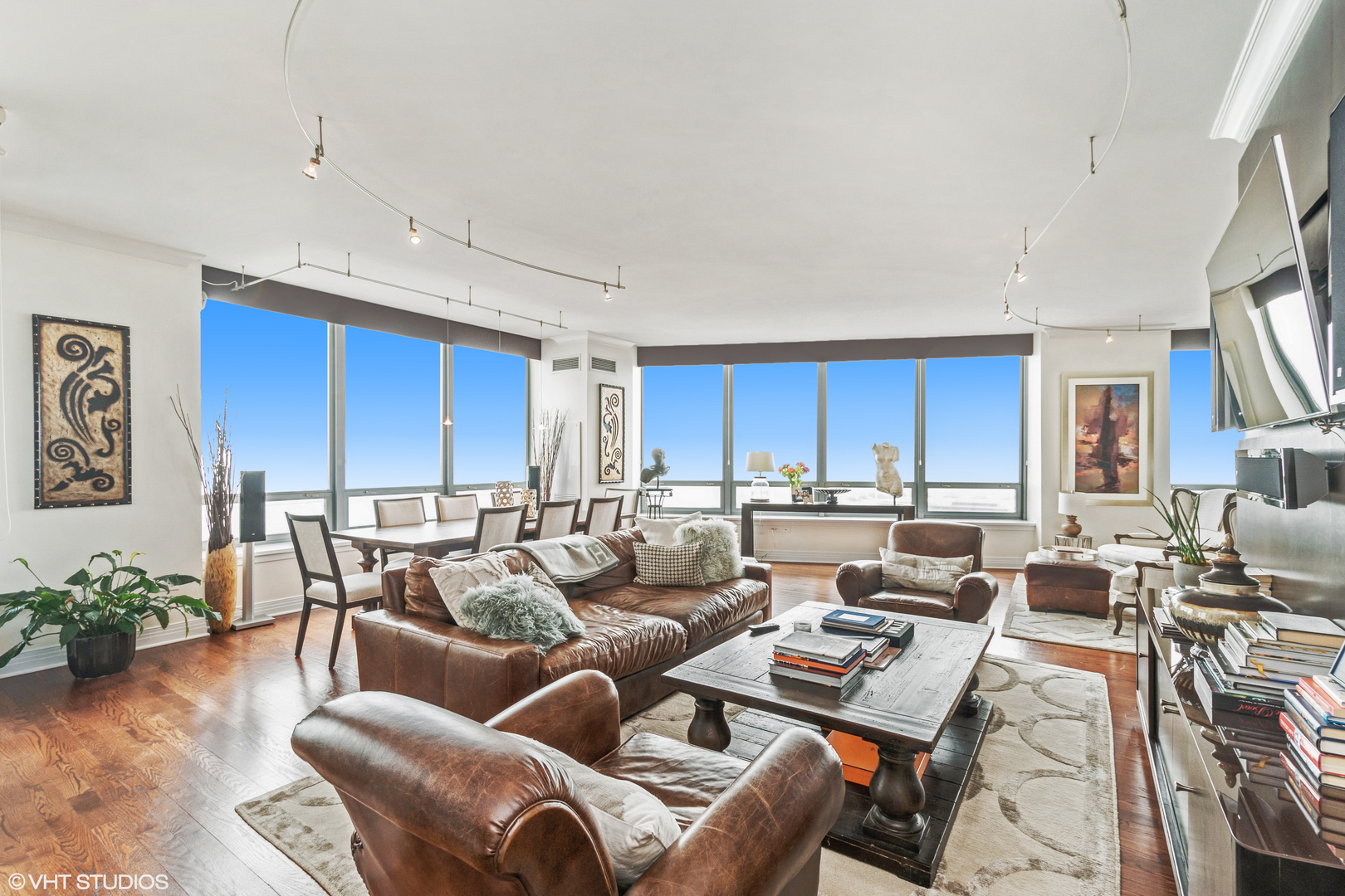 This rarely available large 3 bed 3.5 bath northeast corner residence features sprawling lake views along with Ohio St beach, Olive Park, and Navy Pier. Luxury living awaits, with spectacular northeast water views, custom flooring, crown molding and interior wall trim throughout, premium chef’s kitchen, and its desirable split bed floor plan with abundant space, this condo is a destination property in the north tower at 600 Lake Shore Drive! With the open living/dining/kitchen floor plan, entertain with ease. An elegant overhead light fixture greets you upon entering, with custom marble flooring extending from the foyer into the hallway, leading to rich hardwood flooring in the living/dining area. The spacious living/dining area features crown molding along with overhead track lighting looping throughout the entire seating area with a custom floor-to-ceiling entertainment cabinet as a dramatic focal point in the room. This living/dining area also flows into an ideal seating area for enjoying a book by the custom gas fireplace with attached custom shelving and sweeping lake views. A conveniently located bar including built-in cabinets with custom glass doors and a wine fridge for yours and guests’ enjoyment allowing a nightcap to end the day. Enjoy your morning coffee, or the evening nightcap on the north-facing private balcony with its calming lake views. Create culinary magic for guests in the enormous kitchen, boasting premium appliances including SubZero refrigerator, Bosch dishwasher, Wolf double oven, and Dacor microwave. You’ll love the custom track lighting, custom backsplash, granite countertops, and rich cherry cabinetry featuring custom glass fronts. The oversized breakfast bar easily accommodates 4 full size seats and offers custom overhead lighting. The lavish master suite also offers lake views, custom carpet, crown molding, overhead custom light fixture, in-wall speakers, and features two large custom-built walk-in closets. The ensuite private master bath includes soaking tub with custom faucets, glass-surround walk-in shower with floor-to-ceiling marble, and dual vanity with custom faucets and all marble surrounds. The second bedroom also features custom carpet, north views, along with a custom walk-in closet and private balcony access. The second bath features marble flooring, along with a walk-in shower. The third bedroom, which can also serve as a den/home office, features lake and Navy Pier views and includes custom carpet, overhead custom light fixture, along with an ensuite bath featuring custom marble walk-in shower. The powder room is conveniently located off the foyer for guests which features a custom pedestal sink and designer mirror. The laundry room is off of the kitchen and accommodates a full-size side-by-side washer and dryer. This magnificent residence which exudes style and is loaded with upgrades could be yours! Prime low floor parking spots 459 is included in the price!
