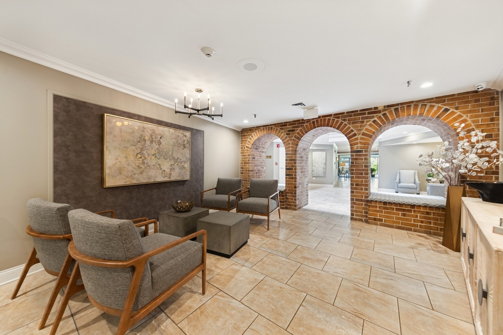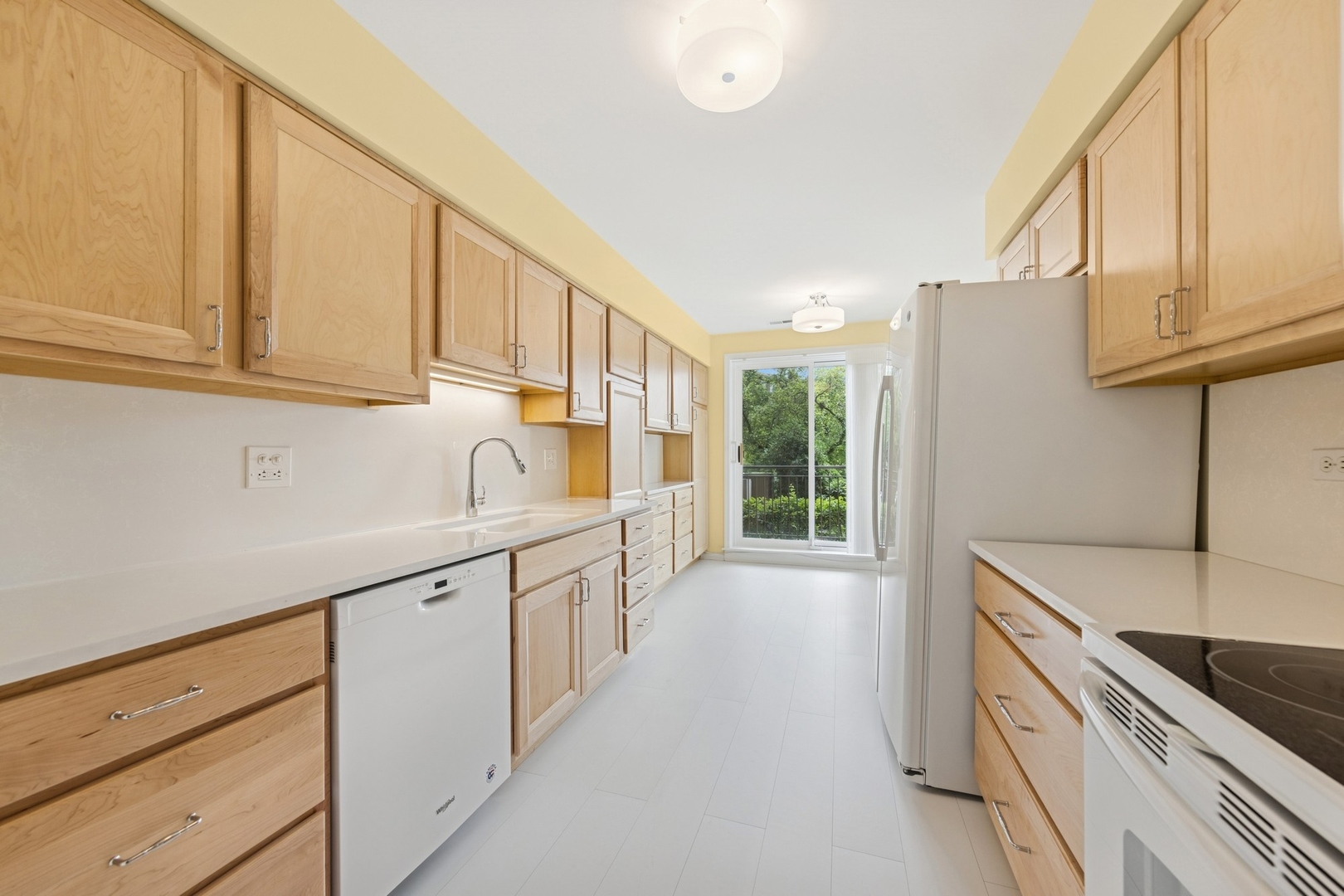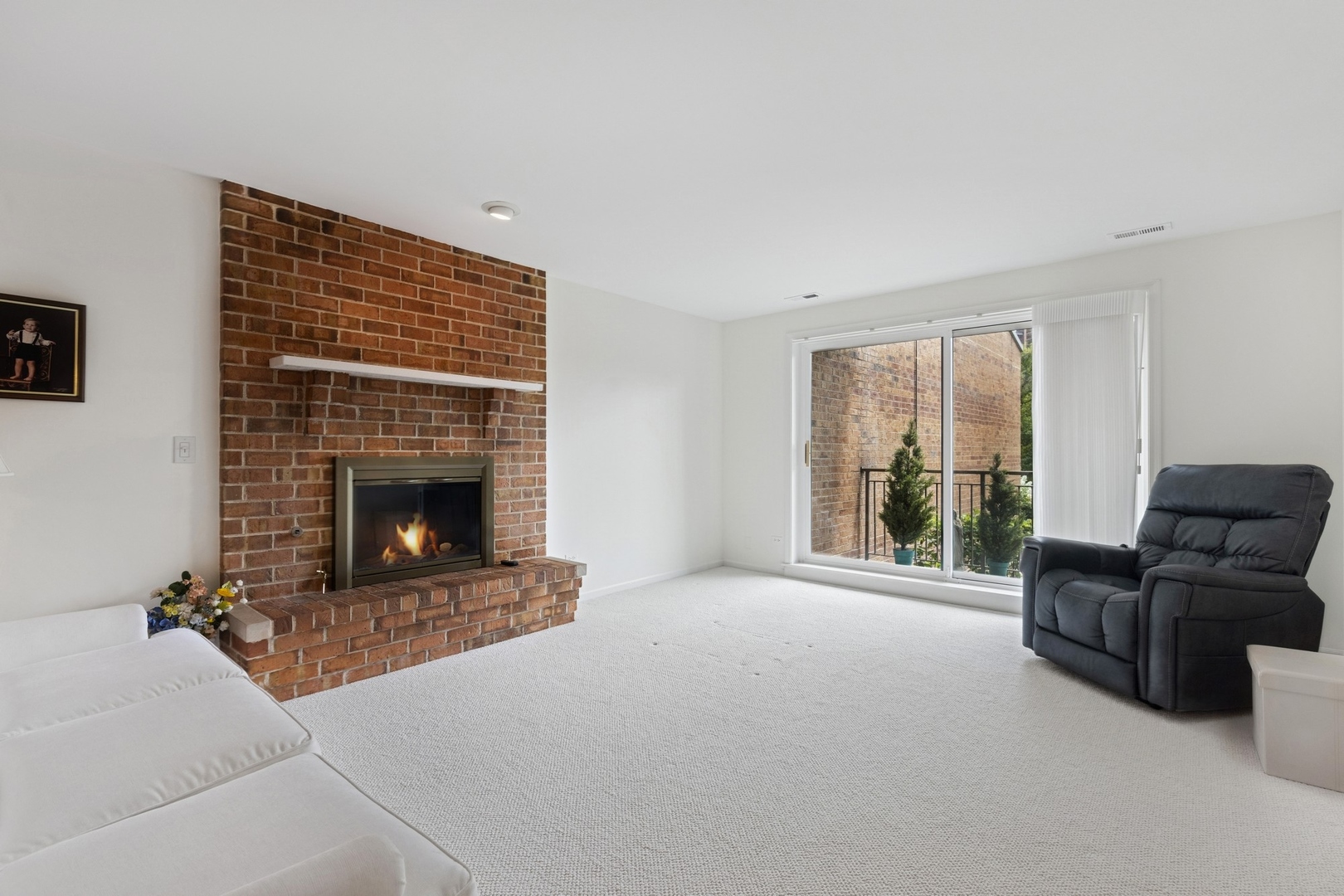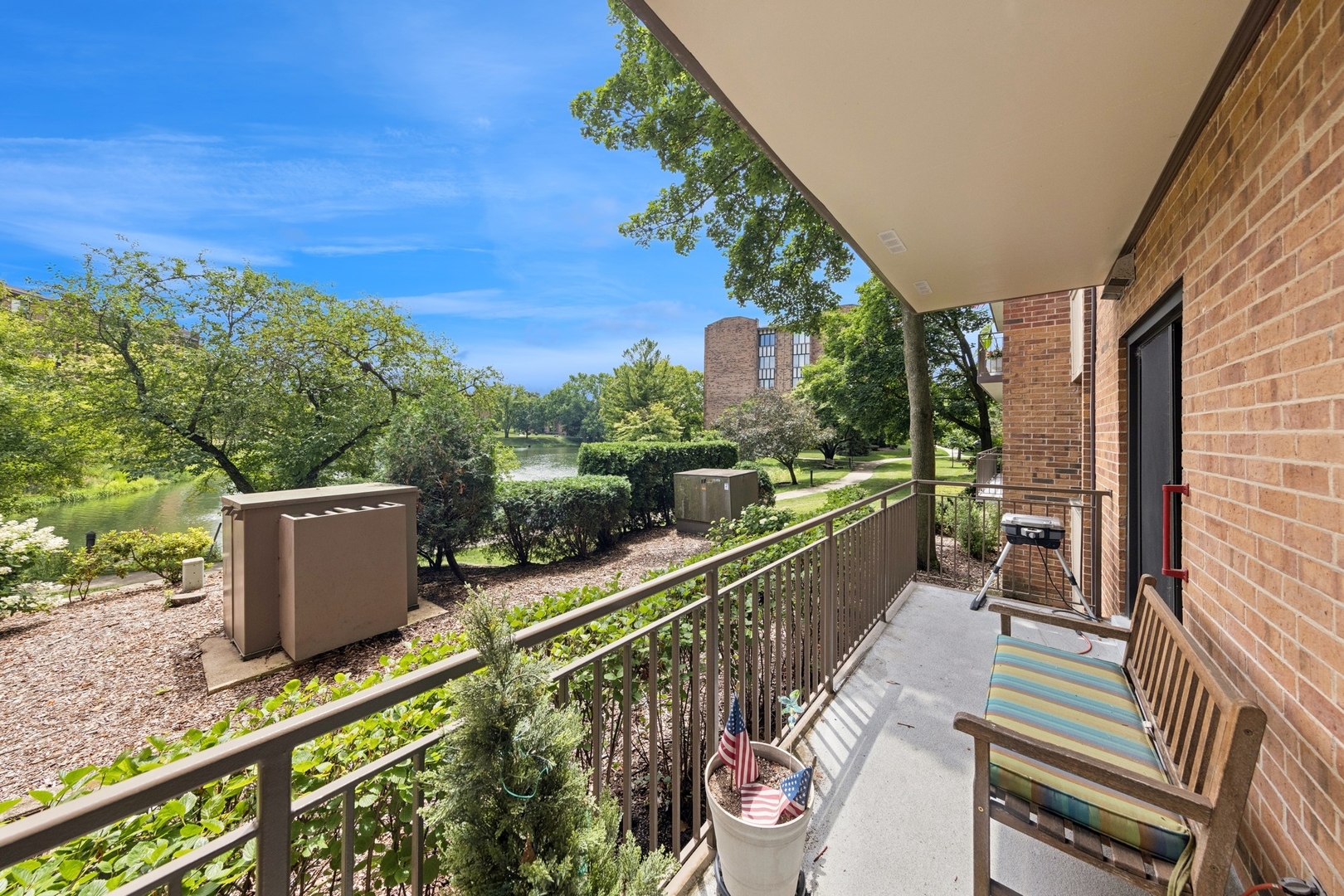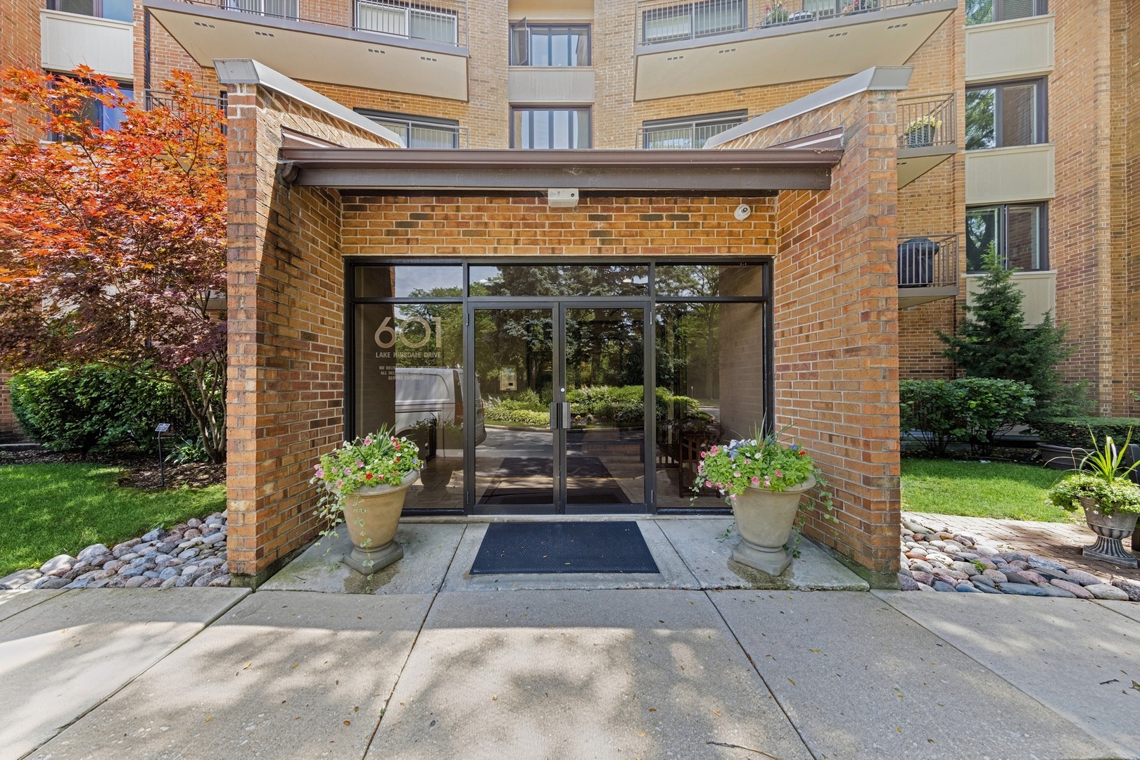 Beautifully maintained and freshly updated FIRST FLOOR, END UNIT with scenic LAKE VIEWS and convenient outdoor access. This 2-bedroom, 2-bath condo offers a comfortable and functional layout with fresh paint and brand new carpeting throughout. The recently redone (2023) kitchen features quartz countertops, a water view, and space for a breakfast table. The living area includes a gas fireplace with brick surround, and large sliders. The primary bedroom includes a full private bath and generous closet space. Gorgeous plantation shutters throughout. A separate laundry room with utility sink and an assigned garage parking space (#9) add to the practicality of the unit. Located just off the building foyer for easy entry, this condo also includes a new sliding glass door and private balcony to enjoy the outdoors. Community amenities include walking trails, pickleball and tennis courts, a park, playground, clubhouse and sundeck. The 601 building has an updated party room, and an exercise room overlooking the lake. A new swimming pool is scheduled for completion this summer. A great opportunity for no maintenance living in a desirable, active community with beautiful surroundings and easy access to shopping, dining, and recreation.