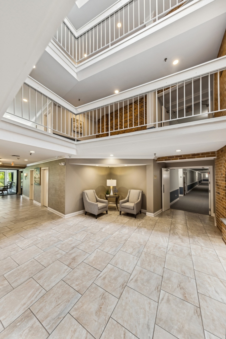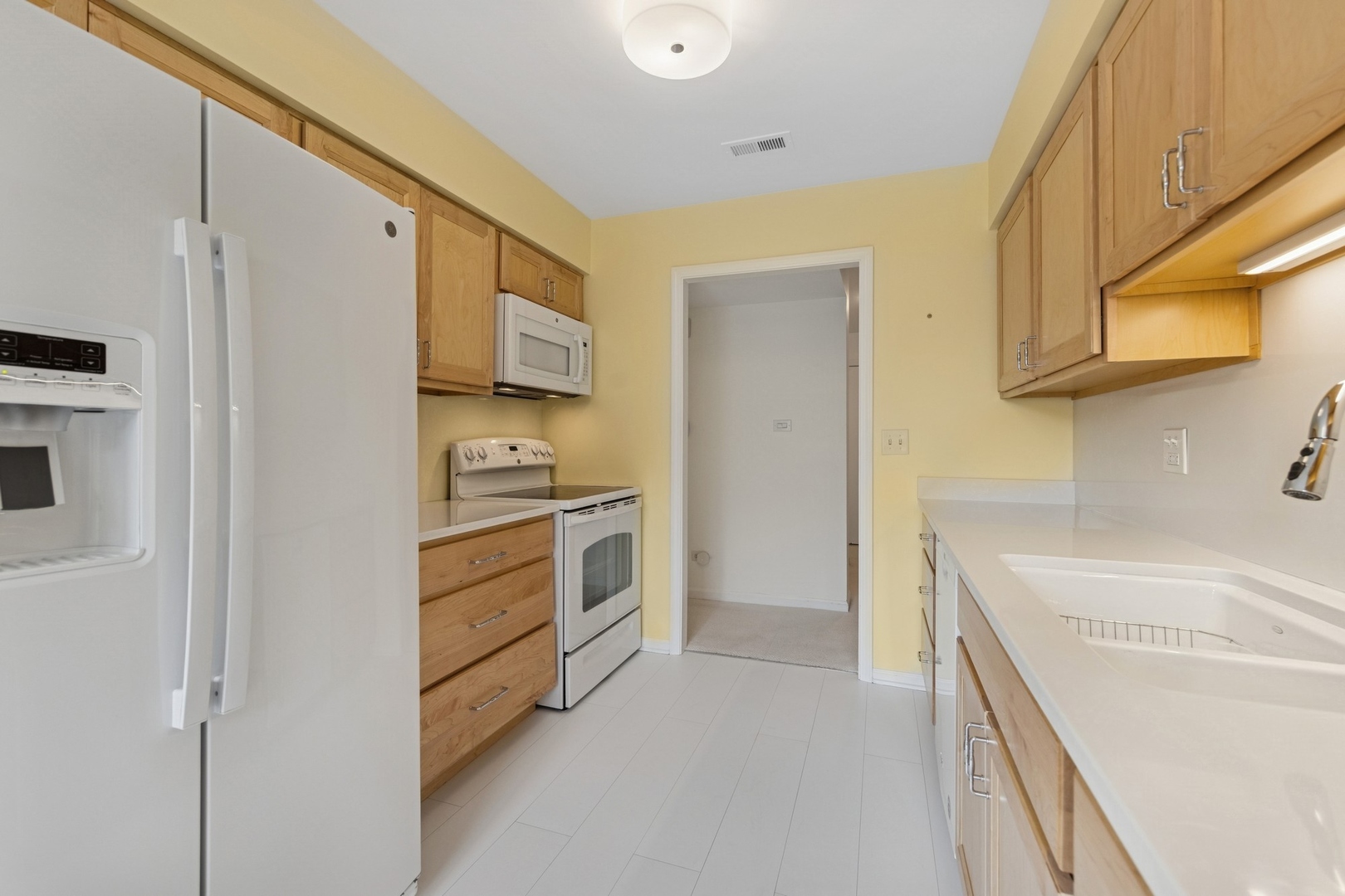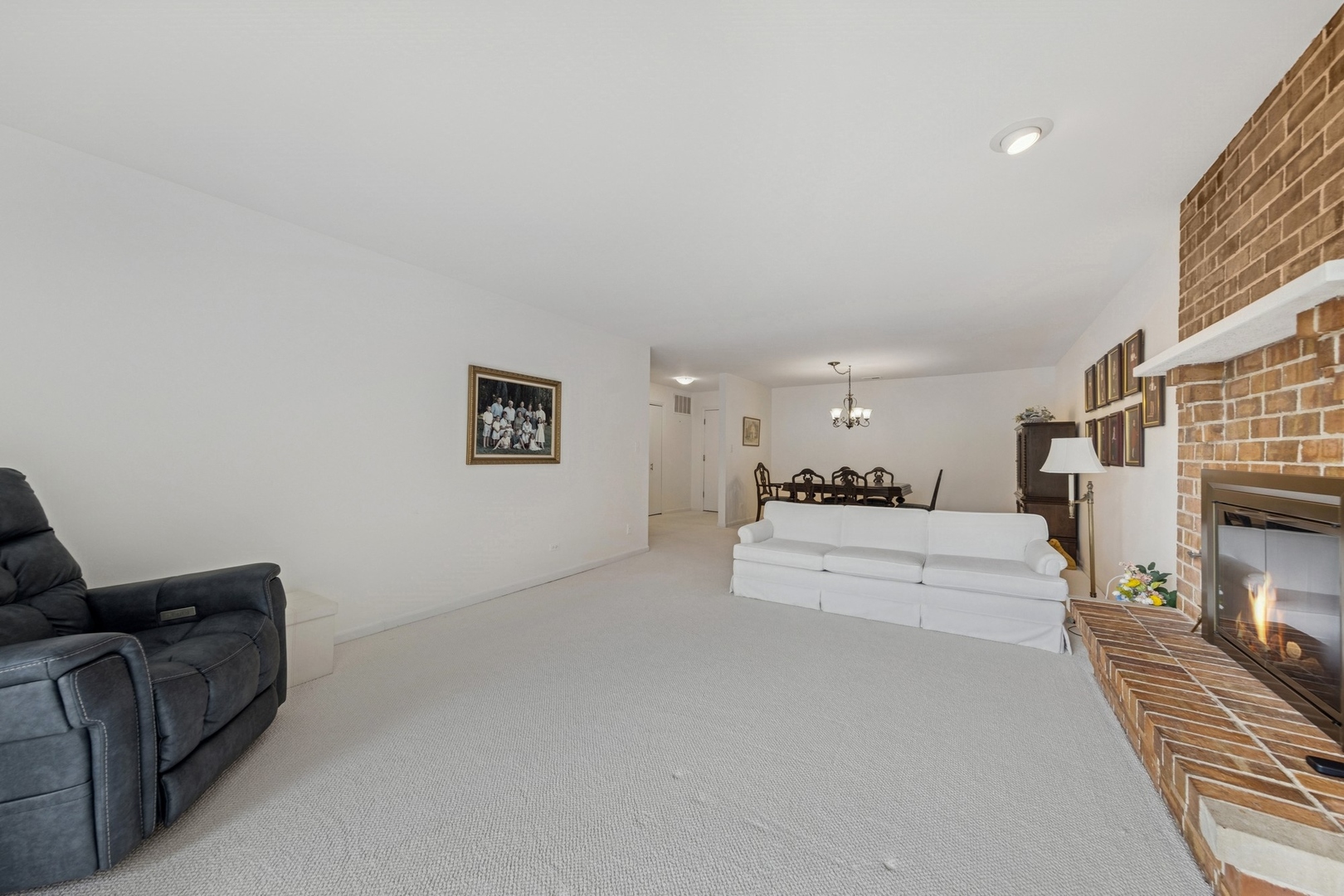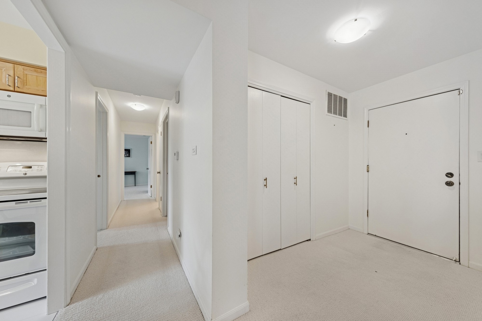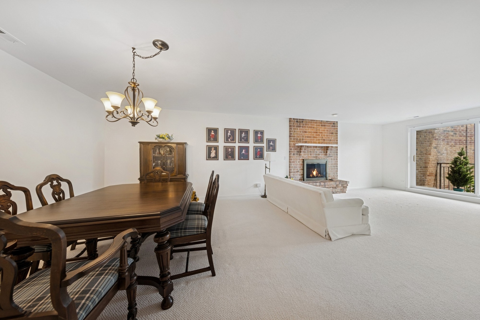 Beautifully maintained and freshly updated FIRST FLOOR, END UNIT with scenic LAKE VIEWS and convenient outdoor access. This 2-bedroom, 2-bath condo offers a comfortable and functional layout with fresh paint and brand new carpeting throughout. The recently redone (2023) kitchen features quartz countertops, a water view, and space for a breakfast table. The living area includes a gas fireplace with brick surround, and large sliders. The primary bedroom includes a full private bath and generous closet space. Gorgeous plantation shutters throughout. A separate laundry room with utility sink and an assigned garage parking space (#9) add to the practicality of the unit. Located just off the building foyer for easy entry, this condo also includes a new sliding glass door and private balcony to enjoy the outdoors. Community amenities include walking trails, pickleball and tennis courts, a park, playground, clubhouse and sundeck. The 601 building has an updated party room, and an exercise room overlooking the lake. A new swimming pool is scheduled for completion this summer. A great opportunity for no maintenance living in a desirable, active community with beautiful surroundings and easy access to shopping, dining, and recreation.