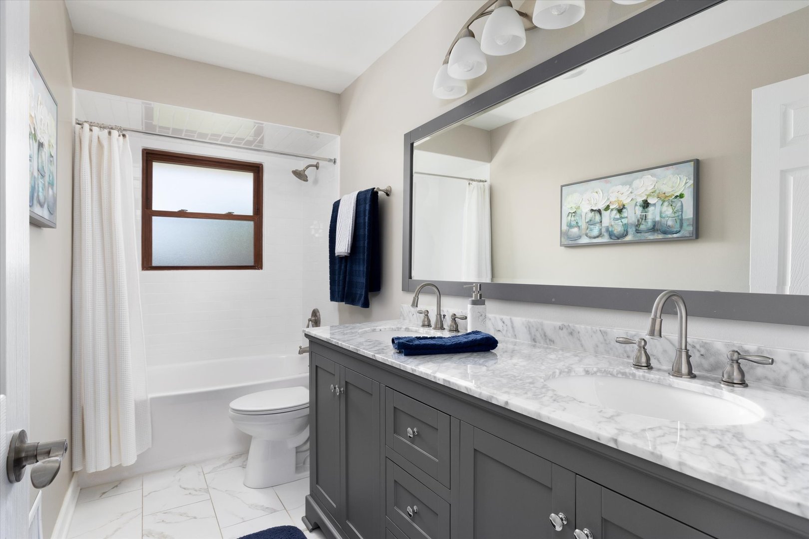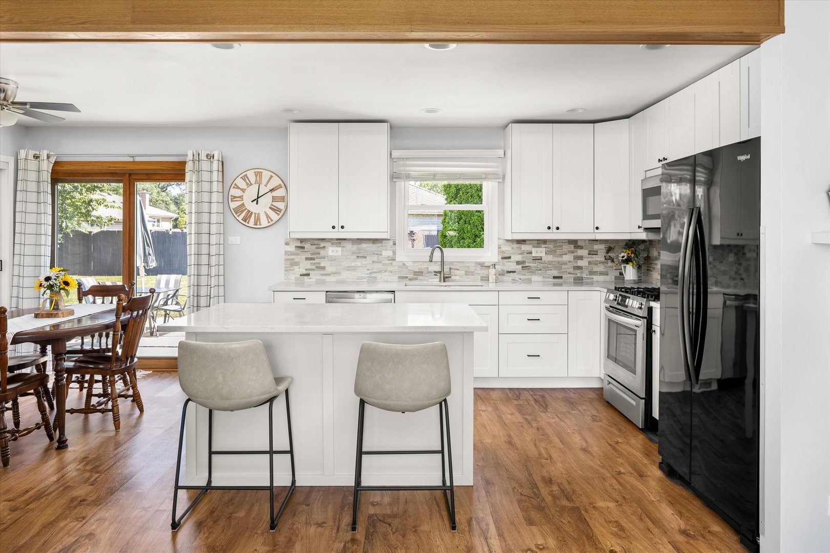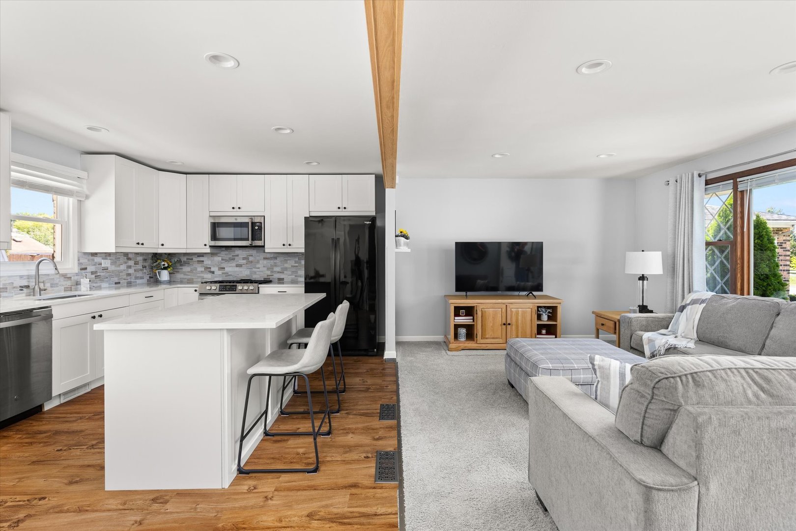 Welcome to this beautifully remodeled 3-bedroom, 2-bath tri-level in Lemont with 1,600 sq. ft. of modern living space. Step inside to a sunlight-filled living room that opens to the fully remodeled kitchen, where a striking wood beam separates the two spaces. The eat-in kitchen features 42″ soft-close cabinets, quartz countertops, marble backsplash, GE Cafe microwave, gas range, a large island with seating, and a deep stainless sink with spot-free faucet. The Pella sliding glass doors leads to the concrete back patio and meticulously maintained back yard. Upstairs, the spacious primary bedroom offers a custom feature wall, ceiling fan, new blackout blinds, and a custom closet organizer. Two additional bedrooms and a fully updated hall bath with new vanity, quartz/marble top, tub/shower, tile flooring, and fixtures complete the second level. The lower level boasts English windows for natural light, a large family room with an extra area great a home office or hobby area, and a second remodeled bath with a glass shower, new vanity, tile flooring, and fixtures. The oversized utility room includes a utility sink and washer/dryer hookups with direct access to the 2.5 car garage with new isulated garage door and 16ft workbench with storage. Large dry concrete crawl space for additional storage. Major updates within the last 1-4 years include: new 30-year architectural roof, oversized gutters and downspouts, insulated garage door, high-efficiency HVAC, water heater, sump pump, Nest thermostat, attic insulation, high efficancy Quiet Cool whole-house fan 3 speeds with timmer. Ductwork has been professionally cleaned and sanitized. Exterior features include new Pella front door, cedar shutters, coach lights, freshly landscaped with rock bed and brick edging, a large concrete patio with gas line for grill, private yard, and quiet neighborhood setting. Located near grocery stores, coffee shops, Downtown Lemont, parks, dog parks, walking paths, and the Lemont Park District. Part of the award-winning Blue Ribbon School District with easy access to I-55, I-355, and the Metra station.This home is a rare find with modern updates, prime location, and true pride of ownership. Truly nothing to do but move in! Don’t miss your chance to tour this beautiful property.