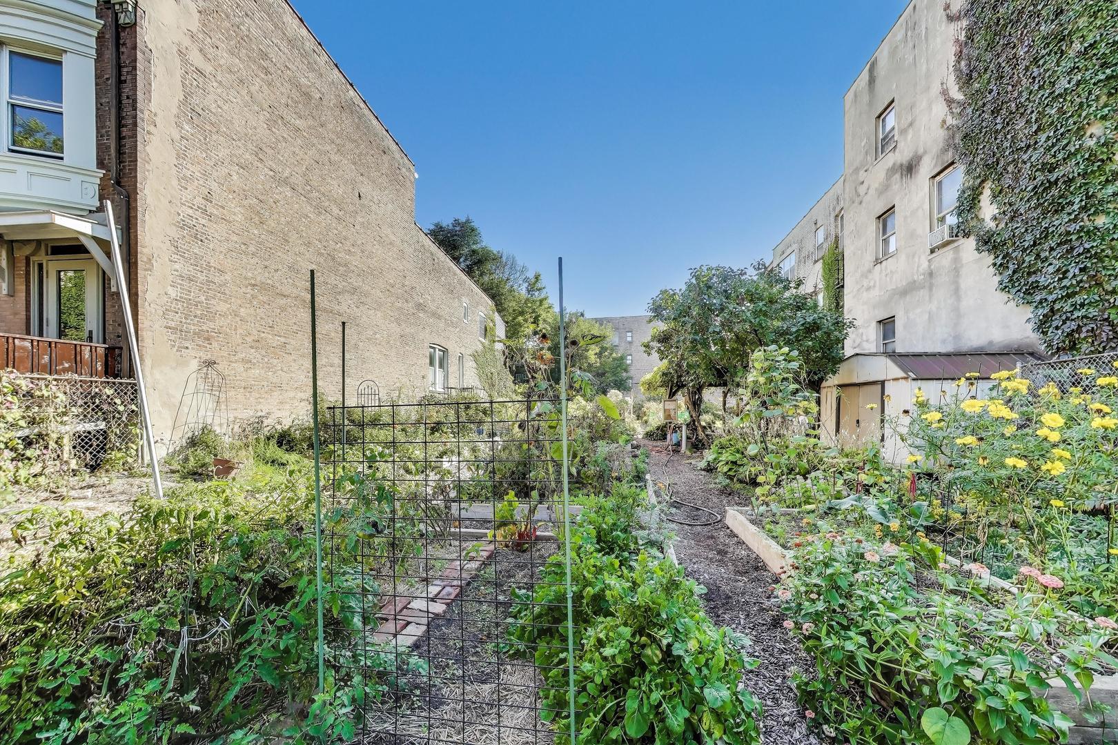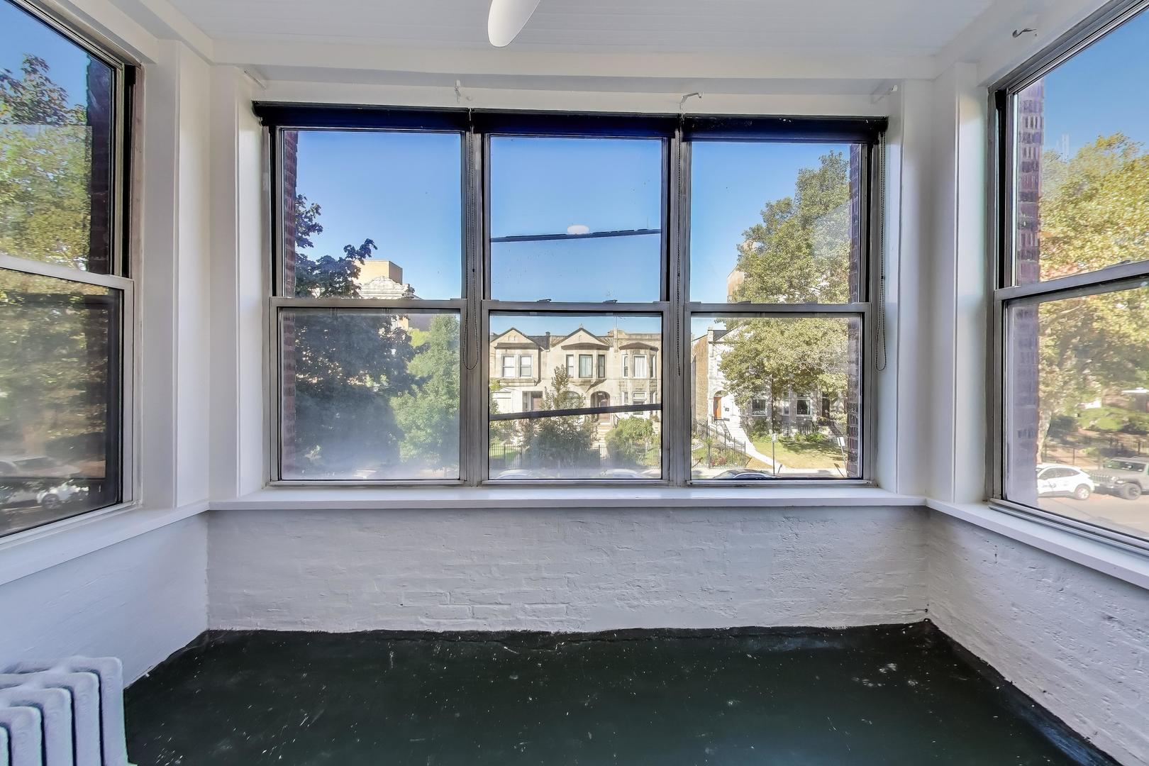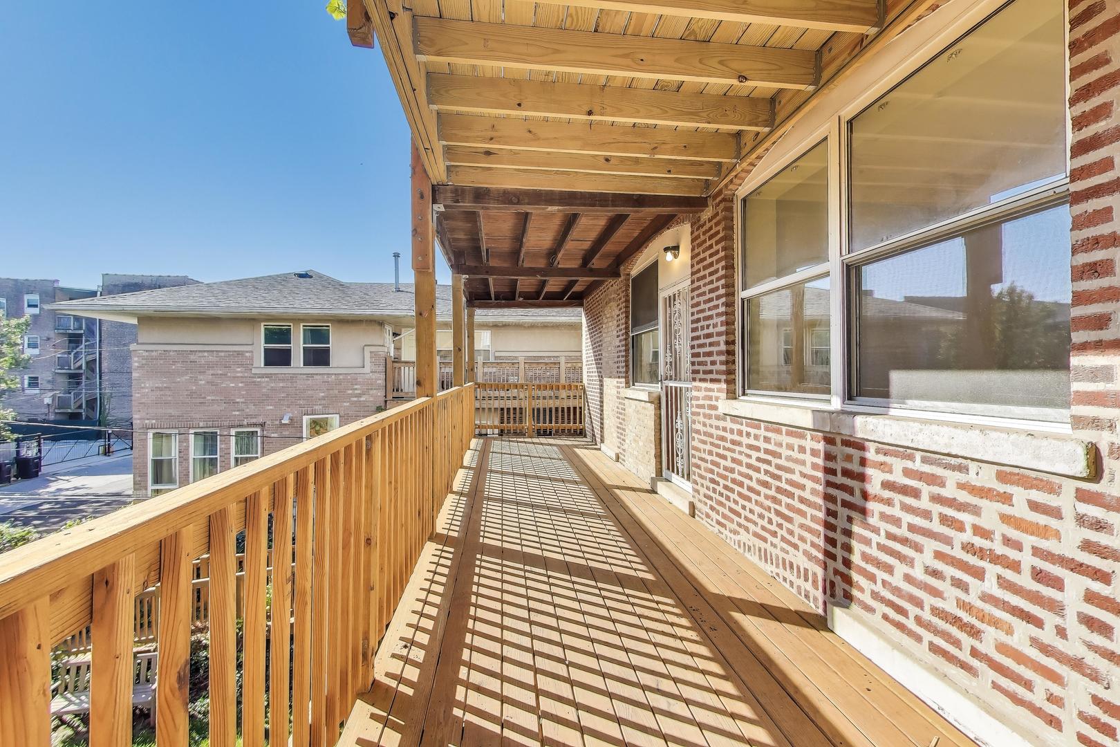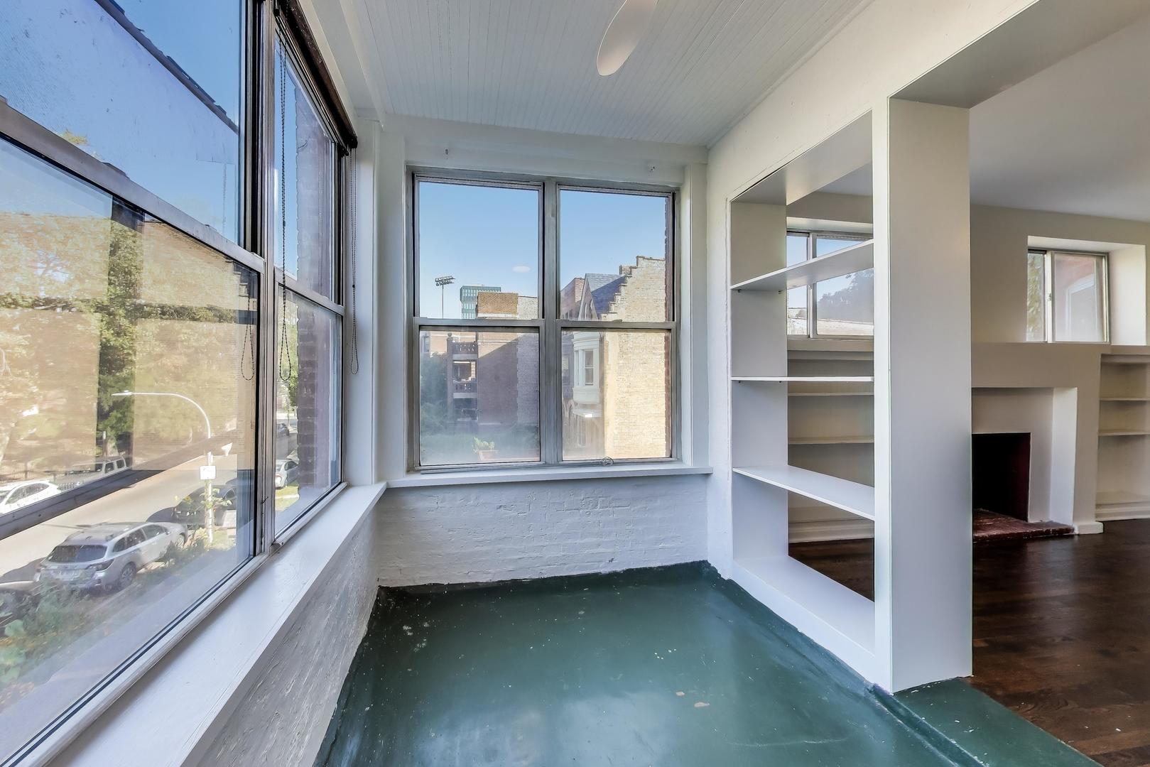 University of Chicago Campus. Bright and roomy with thoughtful details throughout, this 4-bedroom, 2-bath home offers comfortable living in a well-maintained building. The open kitchen includes 42″ wood cabinets with crown molding, ample cabinet and counter space, AND a butler’s pantry for easy prepping and additional storage space. The kitchen connects to the dining area with chandelier, large living room and a sun-lit sunroom. There are four large bedrooms that can easily accommodate large furniture, including a king-sized bed. Step out onto your rear deck, perfect for relaxing or entertaining. An off-street parking spot is included, and there’s a community garden right next door. Convenient access to UofC, public transit, and local shopping. Strong, well-run association.