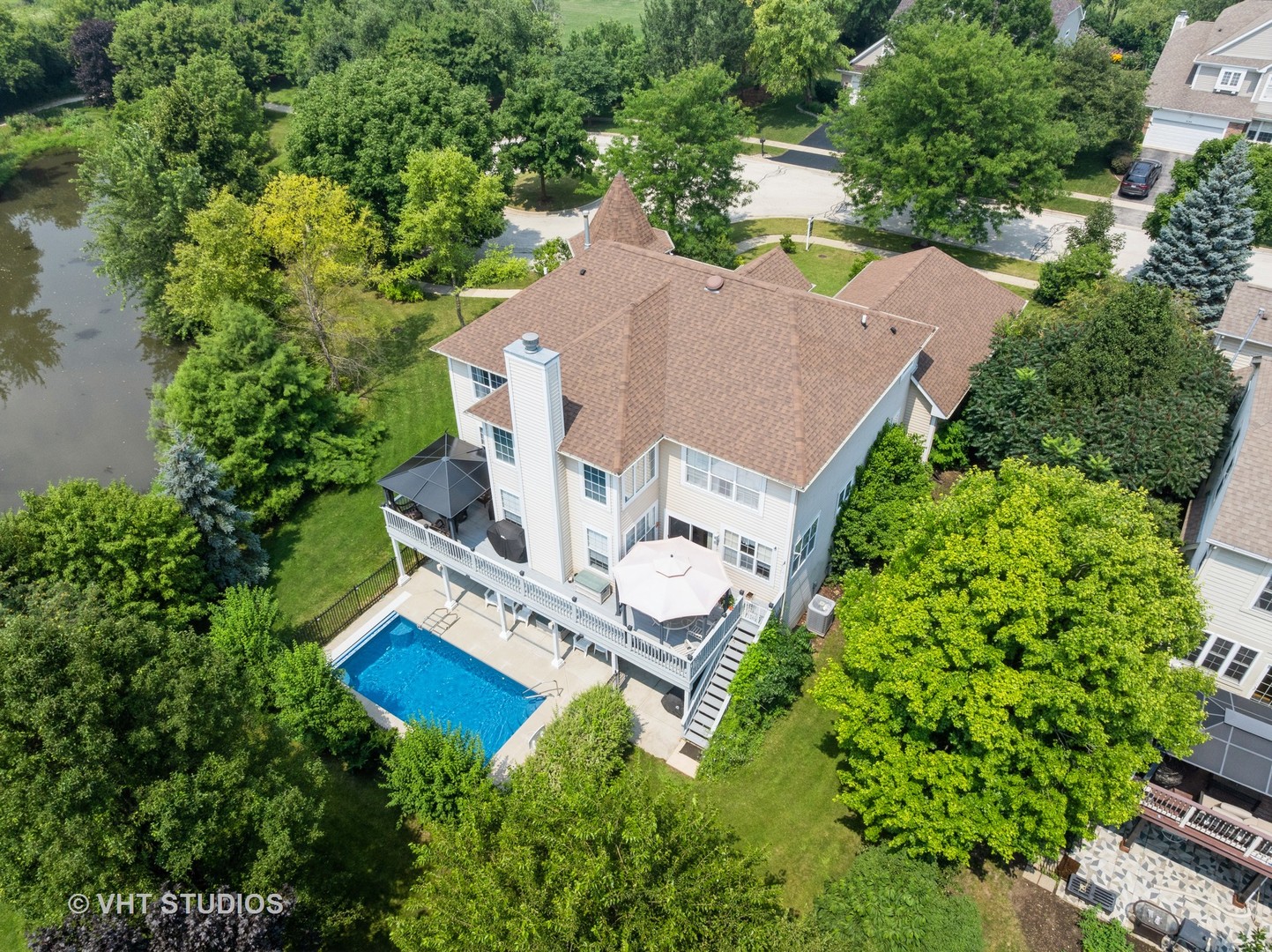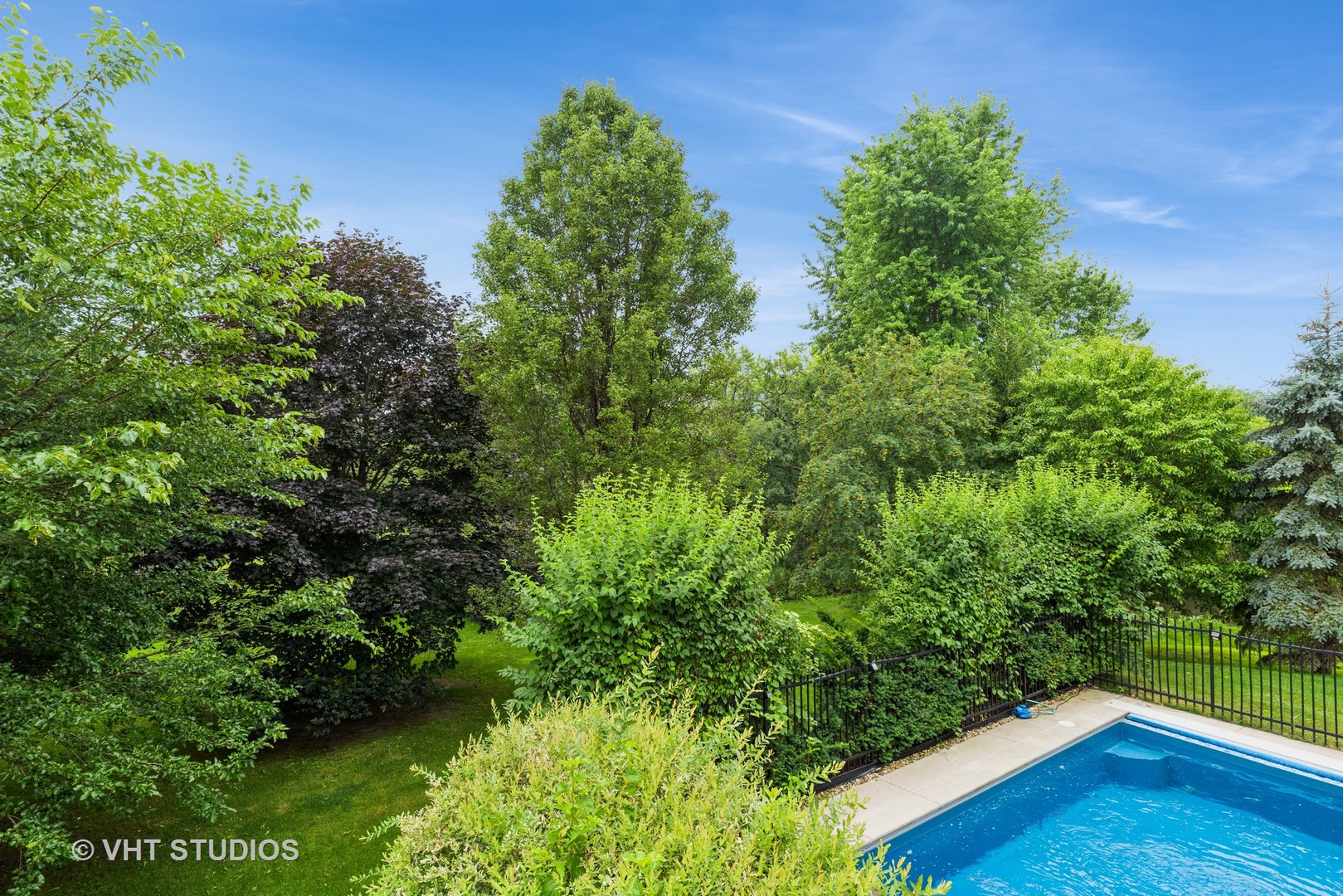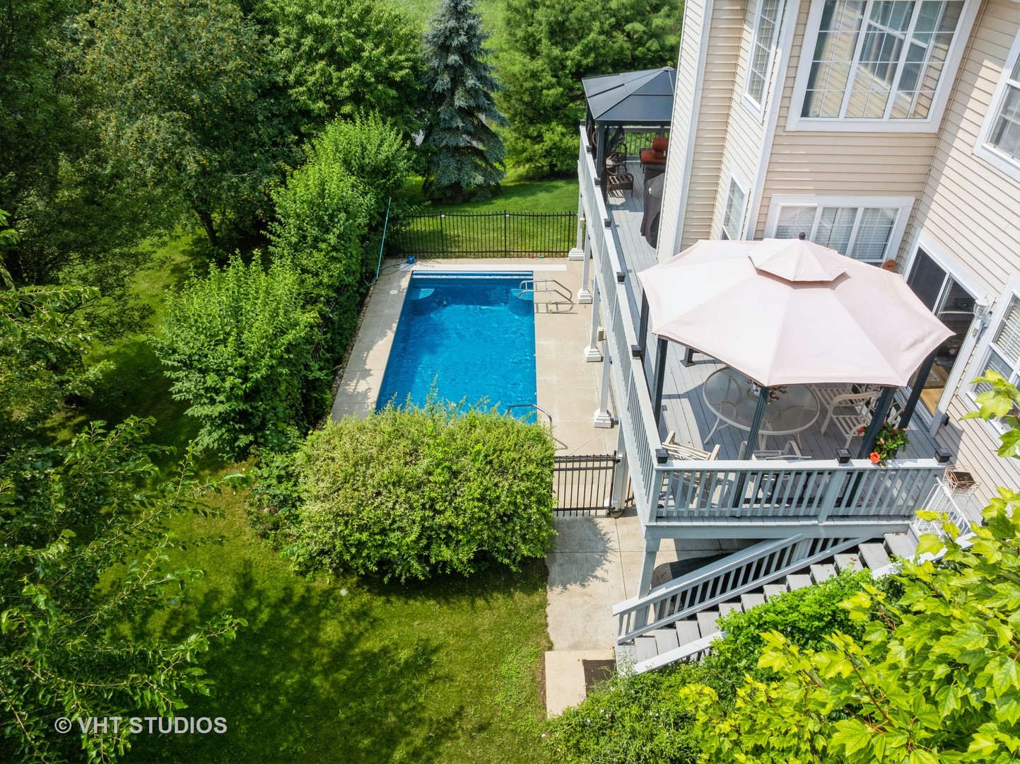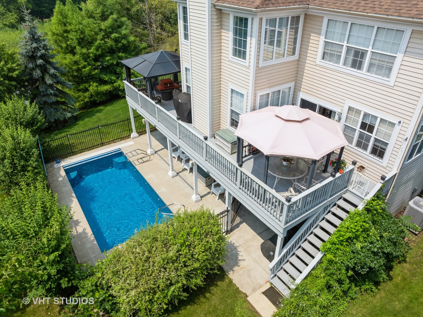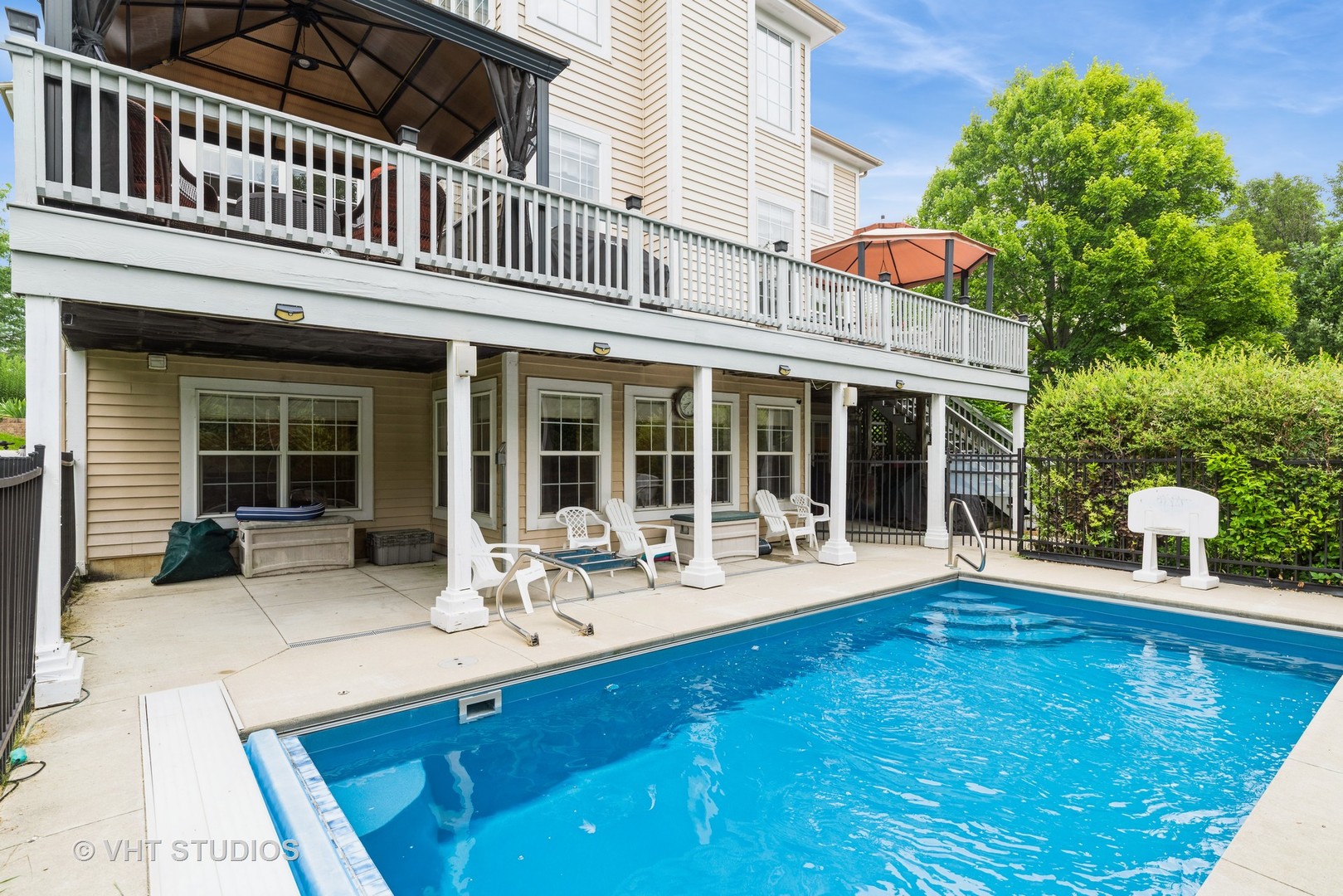 Welcome to your own private paradise! This beautifully maintained and updated 5 bedroom, 3.5 bath home with an in-ground heated swimming pool, offers over 3 finished levels of living space plus a 3 car garage. It is the perfect blend of elegance, comfort, and outdoor enjoyment. Set on a premium lot that backs to serene open land with mature trees and a tranquil pond, you’ll enjoy daily visits from gorgeous birds and have incredible views-with no backyard neighbors! Step onto the charming front porch and into a special home! The first floor features gleaming hardwood floors (just refinished to perfection), a convenient home office, a spacious laundry room, and a dramatic two-story family room perfect for entertaining or cozy movie nights. You’ll feel like royalty sitting in the living room shaped like a turret in a castle! Royal dinners can be served in the elegant dining room. The heart of the home is the updated island kitchen featuring trendy colors, newer stainless appliances, with a generous eating area and a breakfast bar for quick bites. Step outside to the deck complete with 2 gazebos-an amazing spot to relax, entertain or simply enjoy nature. Inside and upstairs, there are four roomy bedrooms, all with ceiling fans and large closets. The hall bathroom offers a dual-sink vanity, while the luxurious primary suite features a tray ceiling, a huge walk-in closet with custom built-ins, and a spa-like bathroom with a whirlpool tub, separate shower and dual vanities. Relax and enjoy! The finished walk-out basement is a dream! It includes a massive recreation room with built in cabinets, a sink and refrigerator, a 5th bedroom, a full bathroom with heated floors, and a craft/exercise room. Just outside the walk-out basement, the in-ground swimming pool is perfect for summer fun, and the peaceful setting with pond views makes this home a rare find!