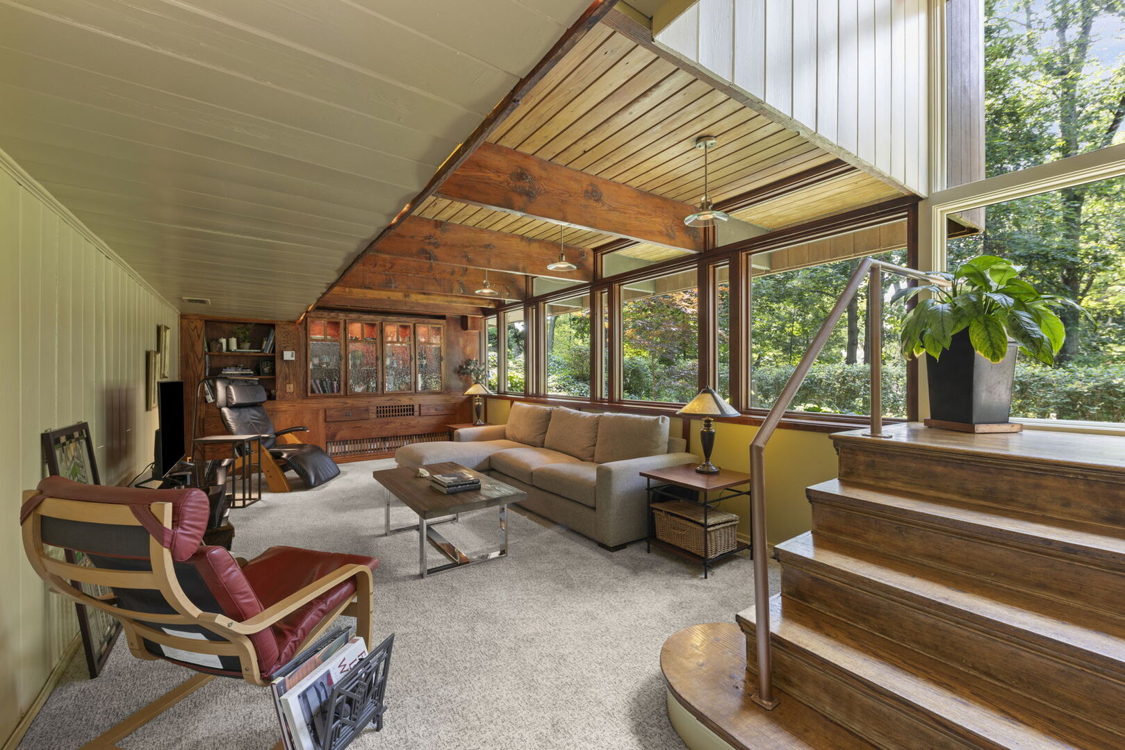 C. 1952, Mid-Century Modern, 4-bedroom hilltop ranch home in the fabulous Midway Park area of Glen Ellyn! Perched on a 120×179 foot lot, this architectural beauty seems to materialize from its wooded surroundings. Nature and function come together with seasonal views from the many windows throughout. The tranquil living room with masonry and copper fireplace boasts perpendicular walls of windows overlooking the rear deck and back yard with access through the adjacent screen porch. Custom built by Hummingbird Designs (2010) the light filled kitchen in the craftsman style features the sink wall of windows, natural cherry cabinetry, soapstone counters, stainless appliances and sustainable cork flooring. The dining room, open to the kitchen has access to the screened porch, side deck, gardens and garage. Primary bedroom includes newer bath (2016) with custom cabinetry, marble tiles and soapstone counters. 3 additional bedrooms and updated hall bath included on the main floor, all with views of the outdoors. Ribbon windows overlooking the backyard, line the hallway to the bedrooms. With “post and beam” construction, exterior walls are the only load bearing. The cozy lower level, also with outdoor views includes family room with built-in bar cabinet and laundry room. Both naturalized and manicured, the grounds are stunning in every season with water feature in the front, two entertainment decks, gardening shed or playhouse, and an assortment of appropriate garden ornamentation. Paver brick walkways and driveway lead to the the 2.5 car garage “complex’ which includes a generous storage area and EV charging station plus storage shed and potting area built into the the side of the building. Updates include: Modified Bitumen Roof(2001) Washer/Dryer and Architectural Staircase to the Kitchen(2025) DW, Fridge, HW Heater, 22KW House Generator and EV Charger(2020) Range(2017) Anderson Window Replacements, HVAC and Rubber Garage Roof(2016). Walking distance to the Metra train station, Lake Ellyn, Restaurants, Shops, IL Prairie Path, Glenbard West HS and more from this sought after location. Within the Ben Franklin Elementary boundaries.