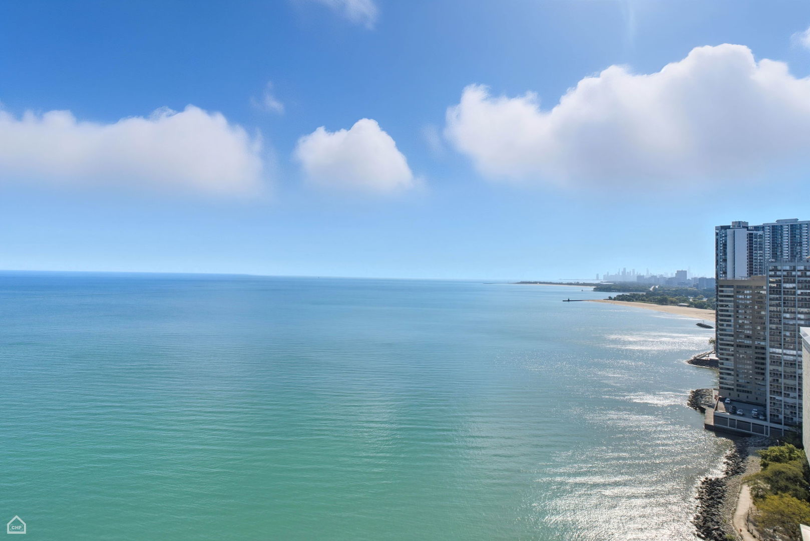 This beautifully remodeled true 1-bedroom condo at Shoreline Tower is a must-see! Pristine and move-in ready, with rich dark engineered hardwood flooring and new lighting fixtures throughout. The spacious, opened chef’s kitchen has been fully reimagined with pristine white and gray cabinetry, stylish subway tile, newer stainless steel appliances (2024), quartz and butcher-block counters and breakfast bar. Enjoy lake views from the all windows! Smart floor plan w/ plenty of storage, flexible living and dining space, and a sizable bedroom that can easily accommodate a king bed and office furniture. Monthly assessments included internet, cable, heat/AC, water…everything but electric. Extra storage included. Shoreline Towers is a full-amenity building, featuring an incredible sundeck w/ panoramic lake and skyline views, well-stocked fitness center, large common lounge/community room, laundry facility, 24 hour door staff and more. Strong reserves at $4 mil+. This is lakeside living at its best: enjoy quick access to the beach, bike and walking trails, Whole Foods, Metropolis Coffee and plenty of amazing restaurants and entertainment venues throughout Edgewater, Andersonville and Rogers Park. Convenient to the Red Line and express bus downtown. Just a short walk to Loyola University.