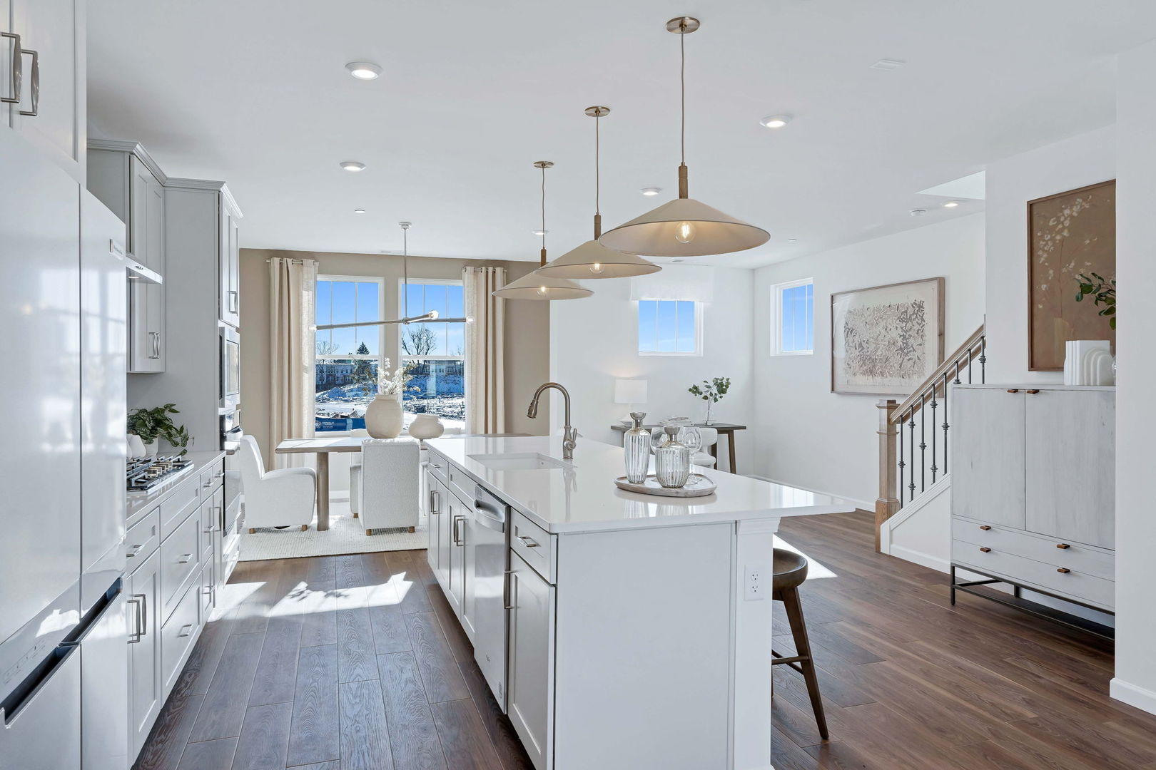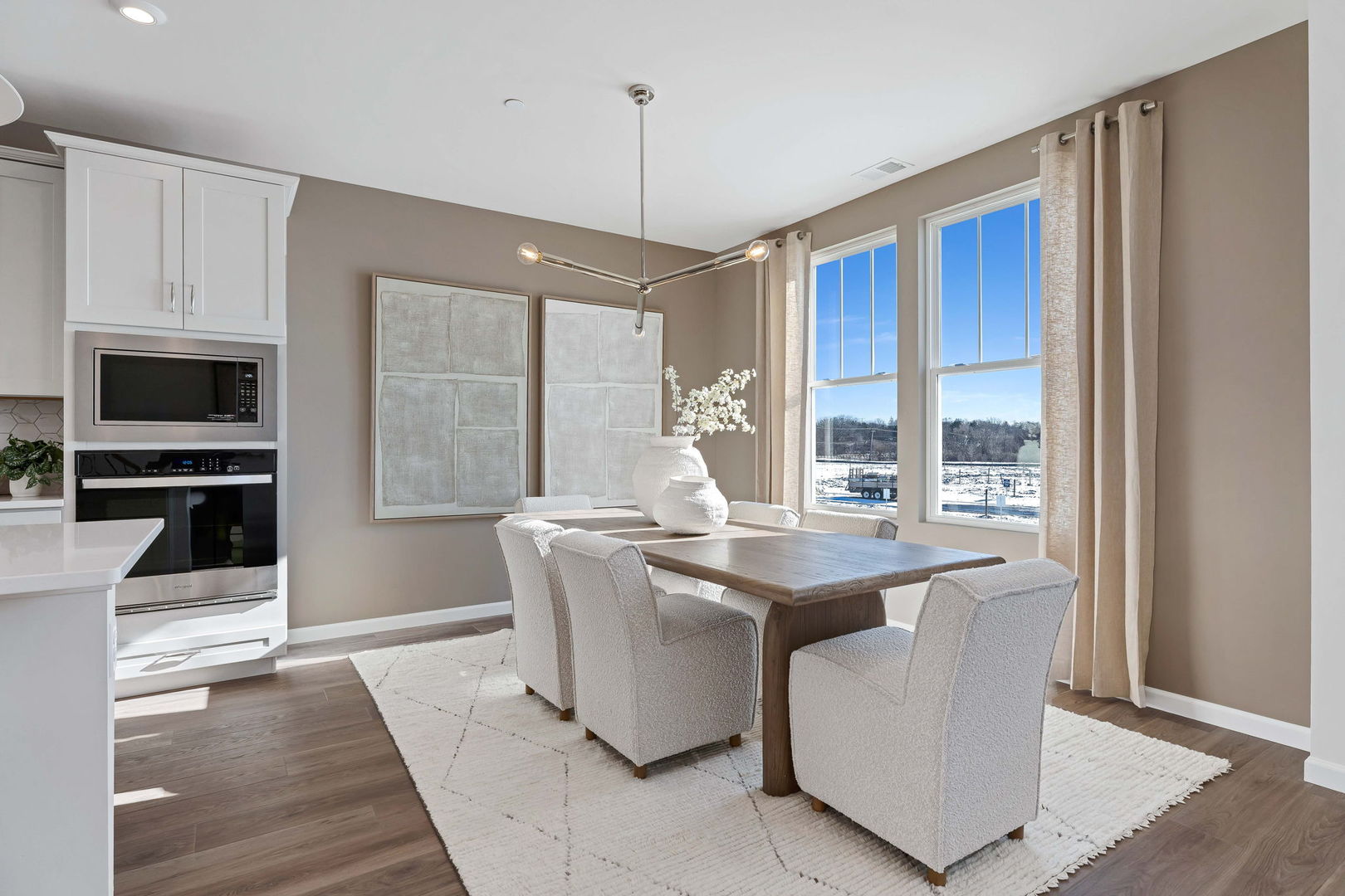 Welcome home to Rivers Edge! Our newest community! Exciting new Townhomes with open concept designs, plenty of storage, and built-in livability and in walking distance to Main Street and Seven Bridges. The Highwood features an open concept with an integrated kitchen, cafe and gathering room plus a flex room/home office. You also have two powder rooms. This beautifully finished Highwood welcomes you to the great room, cafe and kitchen area, a great space for family and friends to gather. Your gourmet kitchen includes upgraded 42″ white cabinets, Quartz counters, SS appliances, a large island with pendant lighting and is complete with a beautiful tile backsplash. Your large island has room for seating, and you have a pantry for extra storage. Your spacious owner’s suite is tucked away for your complete privacy and has a large walk-in closet. Your bathroom has a double bowl vanity with Quartz counters and a separate shower with glass doors. You have brushed nickel finishes throughout and wrought iron rail and spindle stair and LVP flooring the entire 2nd floor. Homesite 33004. You will love our attention to details and the beautiful finishes in this new home. Photos of similar home with some options not available in this home at this price. All the great design features in this home are the same as the beautiful model home. Check it out!