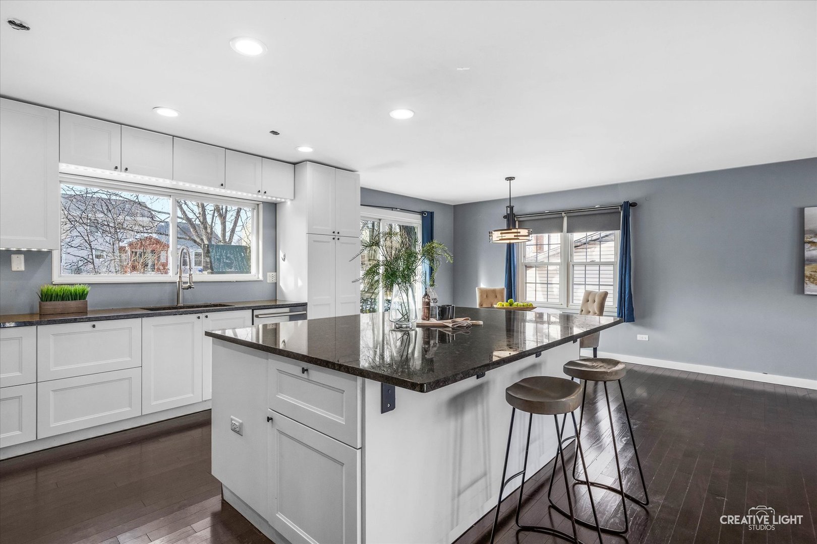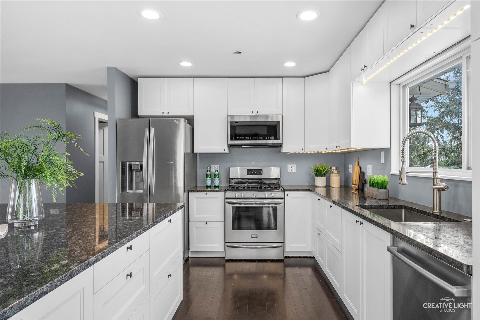 What a floor plan! This owner has created a welcoming, open, on trend home… that is SMART too! This home is convenient to shopping, restaurants, IKEA and feeds into DOWNERS GROVE HS with WOODRIDGE schools for the elementary and JH. The kitchen, eating area and living room was opened, making this one large space for everyone to enjoy! There is a supersized island with extra seating & storage, granite counters, stainless appliances and stylish, white, modular cabinetry with under mount lighting, deep drawers (look for the ‘secret’ pull out interior drawers), soft close cabinets and the hardware is already installed. The eating area has updated lighting and overlooks the backyard. The bathrooms have been updated with ceramic surrounds and custom inlays, updated vanities and mirrors. The primary bedroom has a private bathroom and a 8×5 walk in closet. There are 3 more bedrooms. Two are on the main floor with the primary and the other is in the lower level & is currently being used as office. The Family Room is beautiful with its brick, gas fireplace, raised hearth and glass doors. There is no issue with storage in this house! You will discover 3 storage rooms/closets and lots of extra space in the Laundry Room and an oversized garage. Outside is a mature lot with a raised deck (more storage under the deck) and a shed. The yard is fenced with 2 entry gates and stairs connecting the front and backyards. This home is set up with a HUB that allows you to control the under cabinet lighting and outside lights. The washer/dryer and garage door are smart too! You can control them all from their corresponding apps. This home is ready for you to begin making memories!