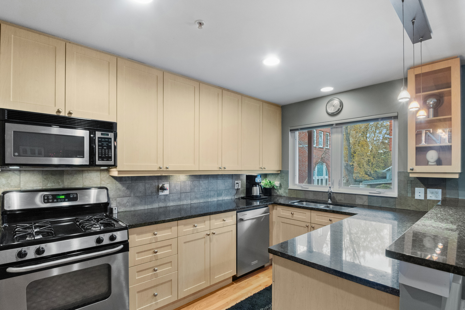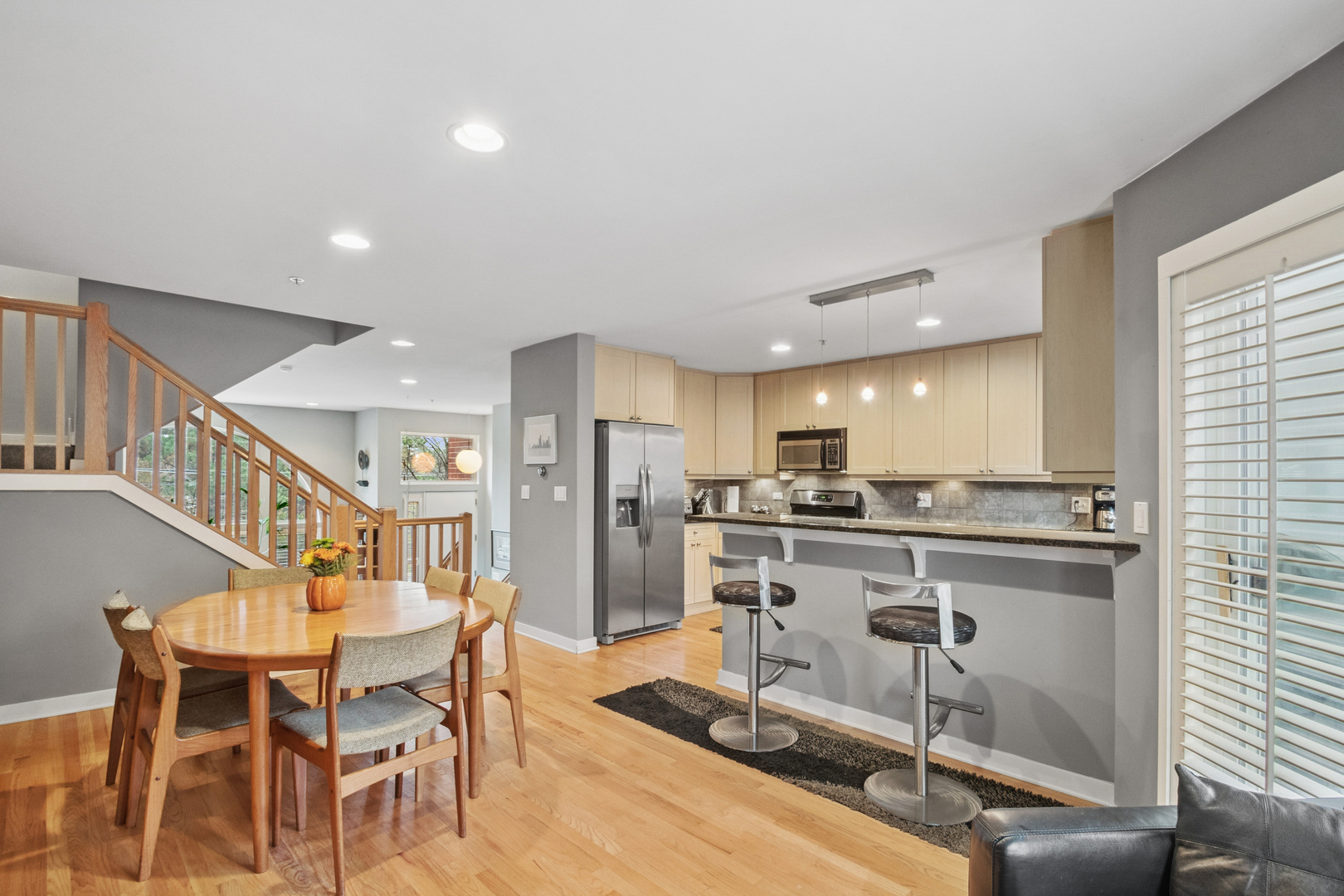 Rarely available and beautifully maintained, this 3-bedroom, 3.5-bath brick townhouse lives like a single-family home. The gracious living room with a cozy fireplace is perfect for holidays and warm gatherings. The kitchen features beautiful oak cabinets, granite countertops, stainless steel appliances, hardwood floors extending through the living and dining rooms, and large windows that fill the home with natural light. The kitchen opens to an inviting eating area and dining room, with sliding doors leading to a private balcony-an ideal spot for a quiet retreat. Upstairs, the spacious primary suite offers a cathedral ceiling, walk-in closet, two-person jetted soaking tub, and separate shower. Two additional bedrooms and a full bath complete the second level. A second-floor laundry hookup provides added convenience. You will love entertaining or relaxing on the expansive 20×20 deck with an adjoining penthouse wet bar. The finished lower level provides flexible space for a recreation room, office, or guest accommodations, and a full bath. Additional highlights include a 2-car attached garage, new garage heater (2025), furnace (2021), new fridge (2024) lower-floor laundry, and a convenient powder room. A brand-new roof was installed in 2024. Situated in a highly desirable area, this home is within easy walking distance to downtown Des Plaines-just half a mile from the Metra station, public library, restaurants, and grocery stores. Enjoy comfort, convenience, and a true sense of home.
