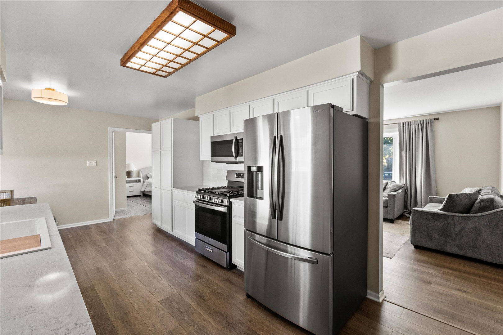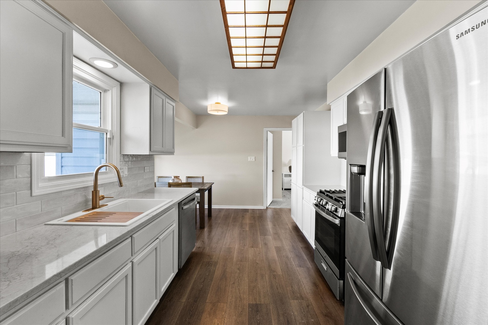Welcome to 6507 Goldhaber Lane, your new home with NO HOA and countless upgrades in the desirable subdivision of Mayfair! Offering 4 bedrooms, an enormous full basement, a completely renovated kitchen, new flooring, and all brand new windows! Upon arrival you’ll notice the large front yard leading to the long driveway and well kept landscaping. Step inside to discover a spacious living room with neutral colors and brand new flooring, the perfect lounging space to unwind each night! The brand new bay window offers tons of natural light, creating an open and airy feel! More updates continue into the kitchen with stunning new quartz countertops, new backsplash and ample pantry space, all complimented by brand new stainless steel appliances! Head down the hall to find the spacious master bedroom and private bathroom with a shower tub combo. The other 3 bedrooms are oversized, ready for any type of space you can imagine! Another great sized hall bathroom provides additional space and storage. Down into the massive full basement you’ll find an amazing opportunity for more square footage of living space. The large open area gives potential for adding extra bedrooms, extra bathrooms, or just a giant recreational space to double the size of the home. You’ll also find a brand new washer and dryer, and a furnace to provide peace of mind for years to come. Out in the backyard is a huge patio for enjoying the outdoors and tons of green space for anything you choose to add! The detached 2-car garage offers plenty of space for vehicles and storage, while the expansive yard and long driveway provide additional outdoor enjoyment and multiple parking spots! All new Windows 2024, brand new Flooring 2025, all new stainless steel appliances 2024, Quartz countertops 2024, Eco Thermostat, Washer and Dryer 2024, Furnace 2024. Situated in a highly desirable location, this home is just moments away from schools, parks, Route 59 for shopping, and I-55 for an easy commute. Don’t miss your chance to make this exceptional property your forever home, schedule your private showing today!