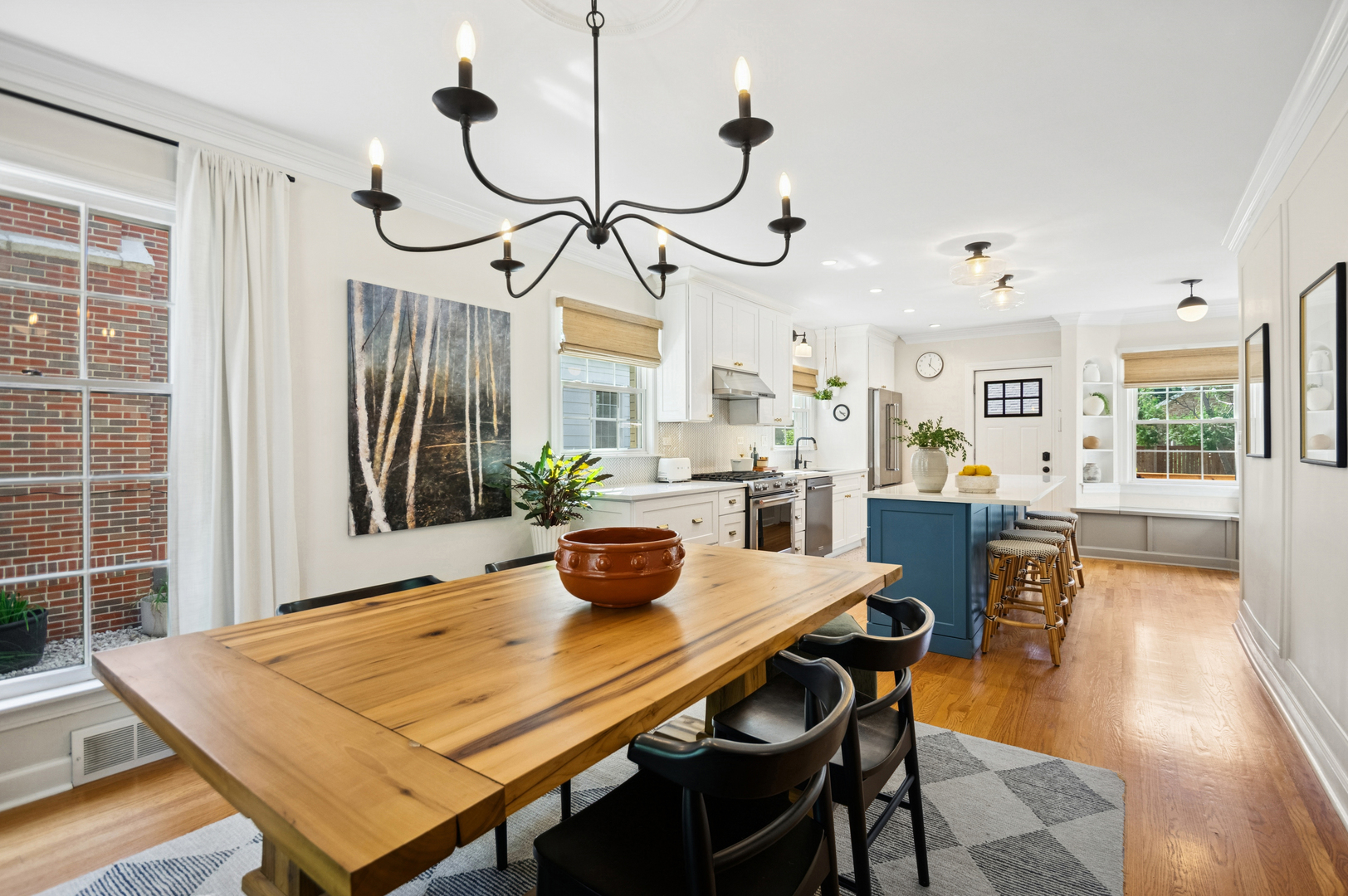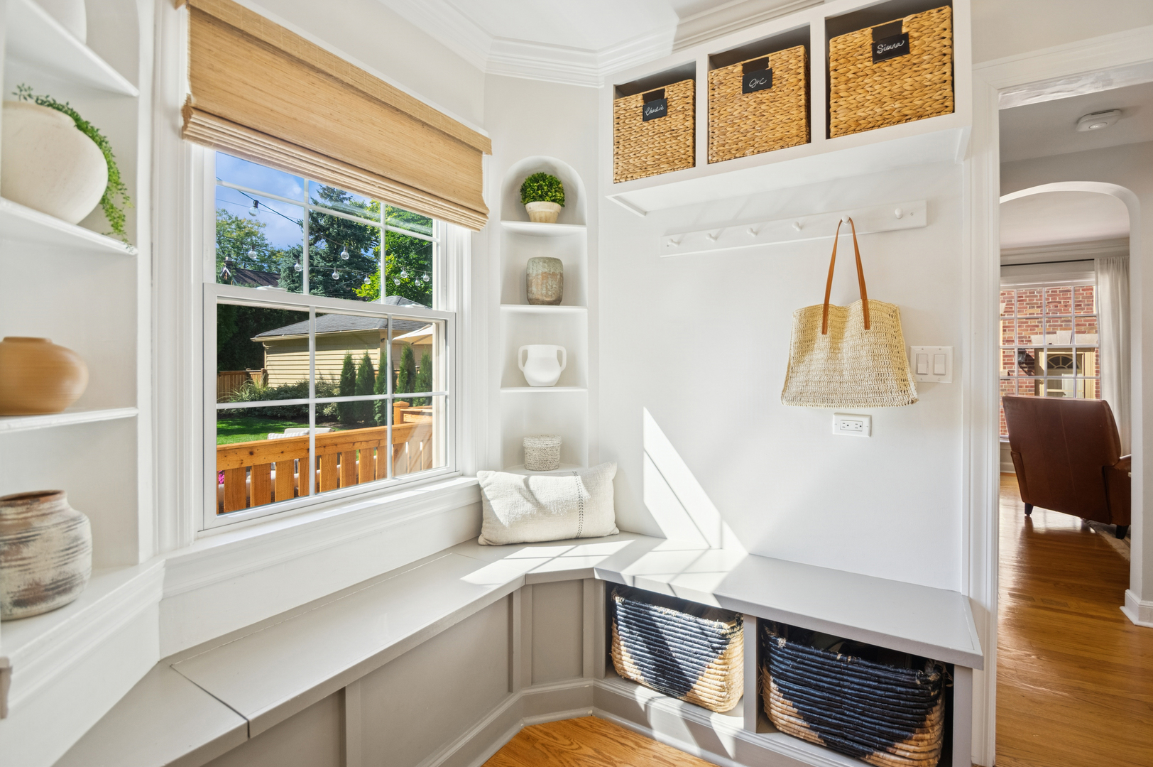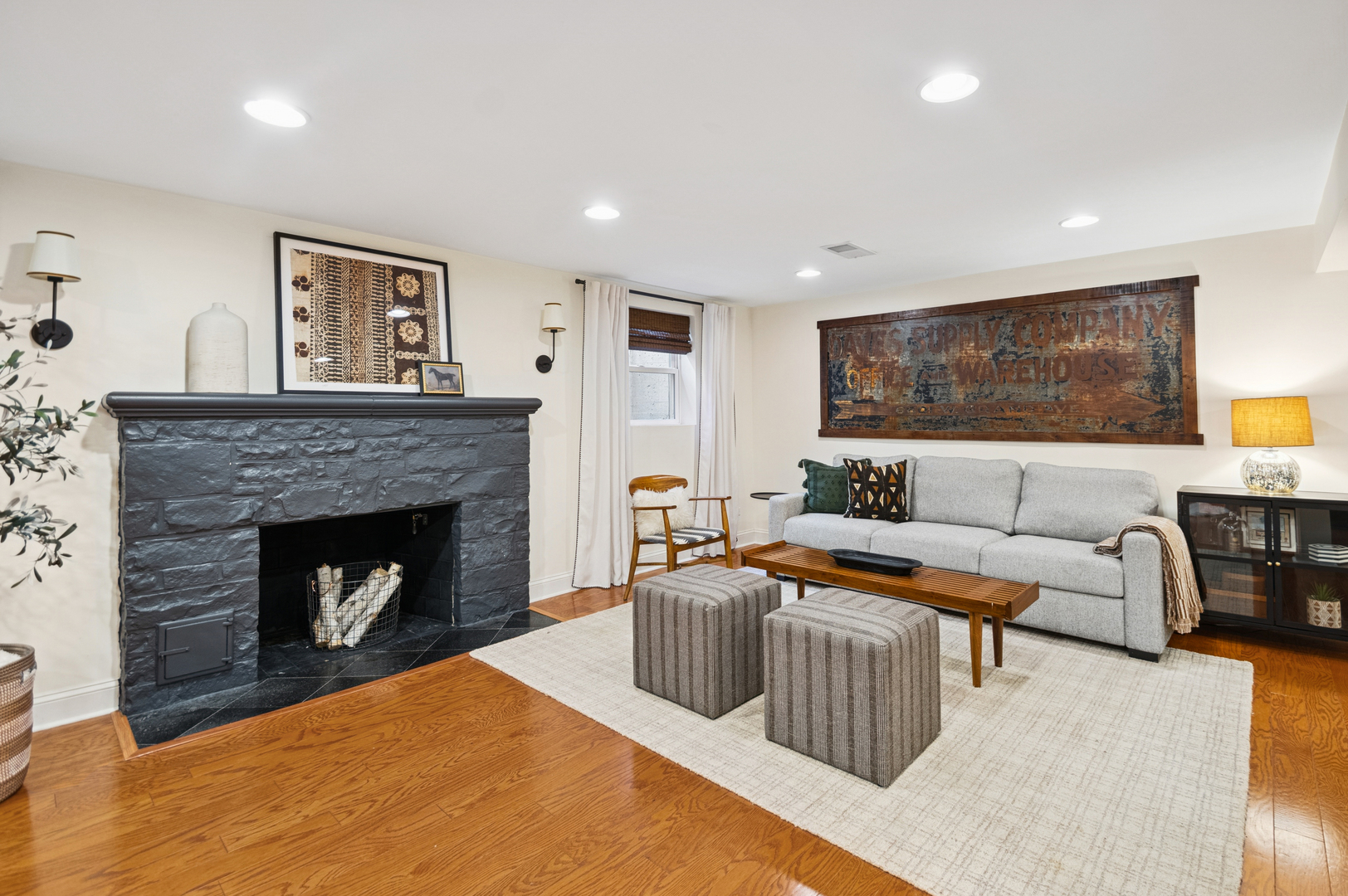 This Stately 1940s Brick Colonial tastefully combines vintage charm with a fresh and sophisticated interior for a contemporary lifestyle. The entire first floor has warm hardwood floors, oversized windows with elegant crown molding and arched doorways. The inviting LR is centered by a WB fireplace. A unique glass barn style door separates a light filled space perfect for an office. There is a large and sophisticated open concept kitchen and dining area. The kitchen has been tastefully updated and includes a unique and cozy corner seating area with views of the lovely backyard. There is also a convenient half bath on the first floor. A classic staircase takes you upstairs to the primary bedroom and 2 good sized bedrooms all light-filled from oversized windows. The beautifully updated bathroom has double sinks and a relaxing soaking tub. The finished basement has a welcoming and comfy family room, complete with a second WB fireplace and a second full bath with a walk-in shower. The oversized lot has large grassy area and brick paver patio with italian lights for outdoor entertaining plus a new 2-car garage. Recent updates: 2025 New 2-car garage, new basement ejector pump, 2024 Fireplace flue and firebox repaired & relined, 2022 New energy efficient furnace and humidifier installed, 2021 perimeter cedar fence installed, 2018 full kitchen remodel and expansion, touch screen, whole house security system installed, 2014 updated main floor half-bath. Fabulous location on a tree-lined street, just walking distance to everything Edgebrook, including the Edgebrook School, Metra, shops, and restaurants with easy access to 90/94, downtown and O’Hare. Stunning home in the heart of Edgebrook.