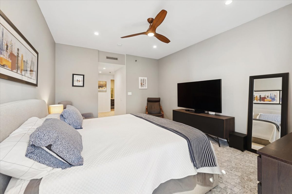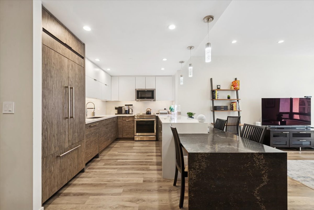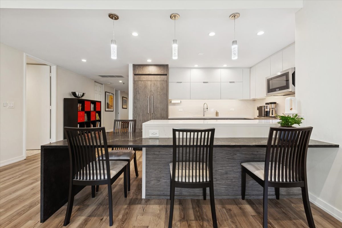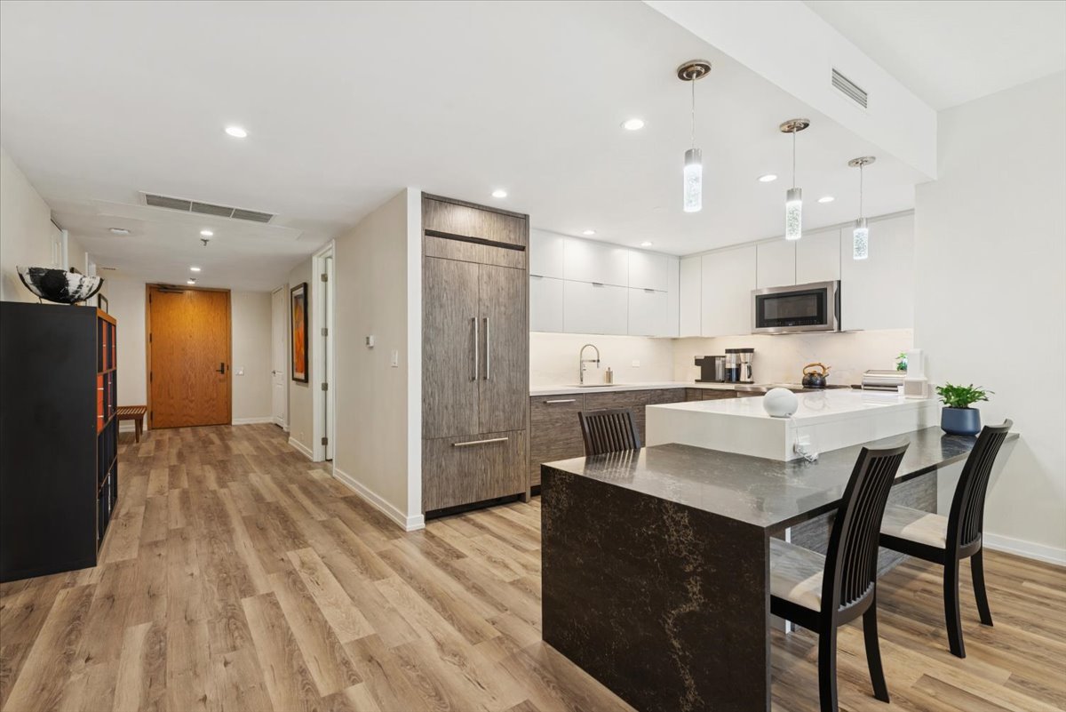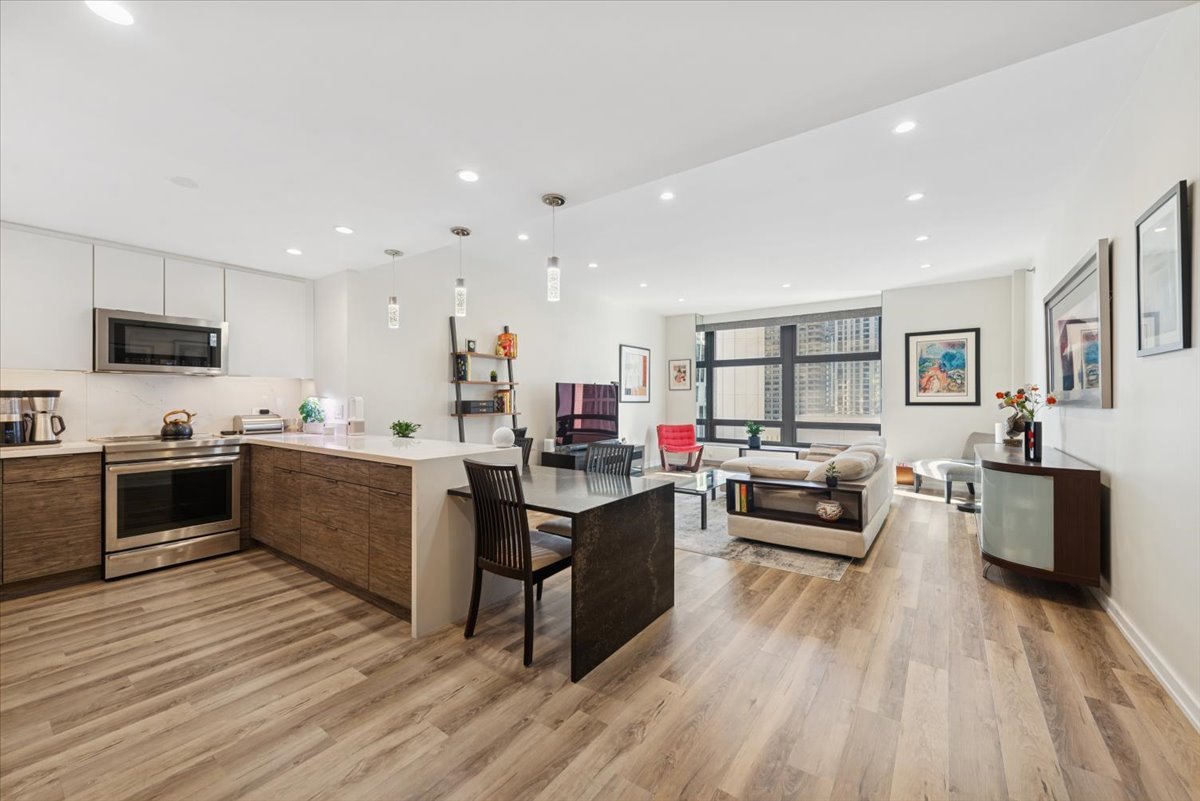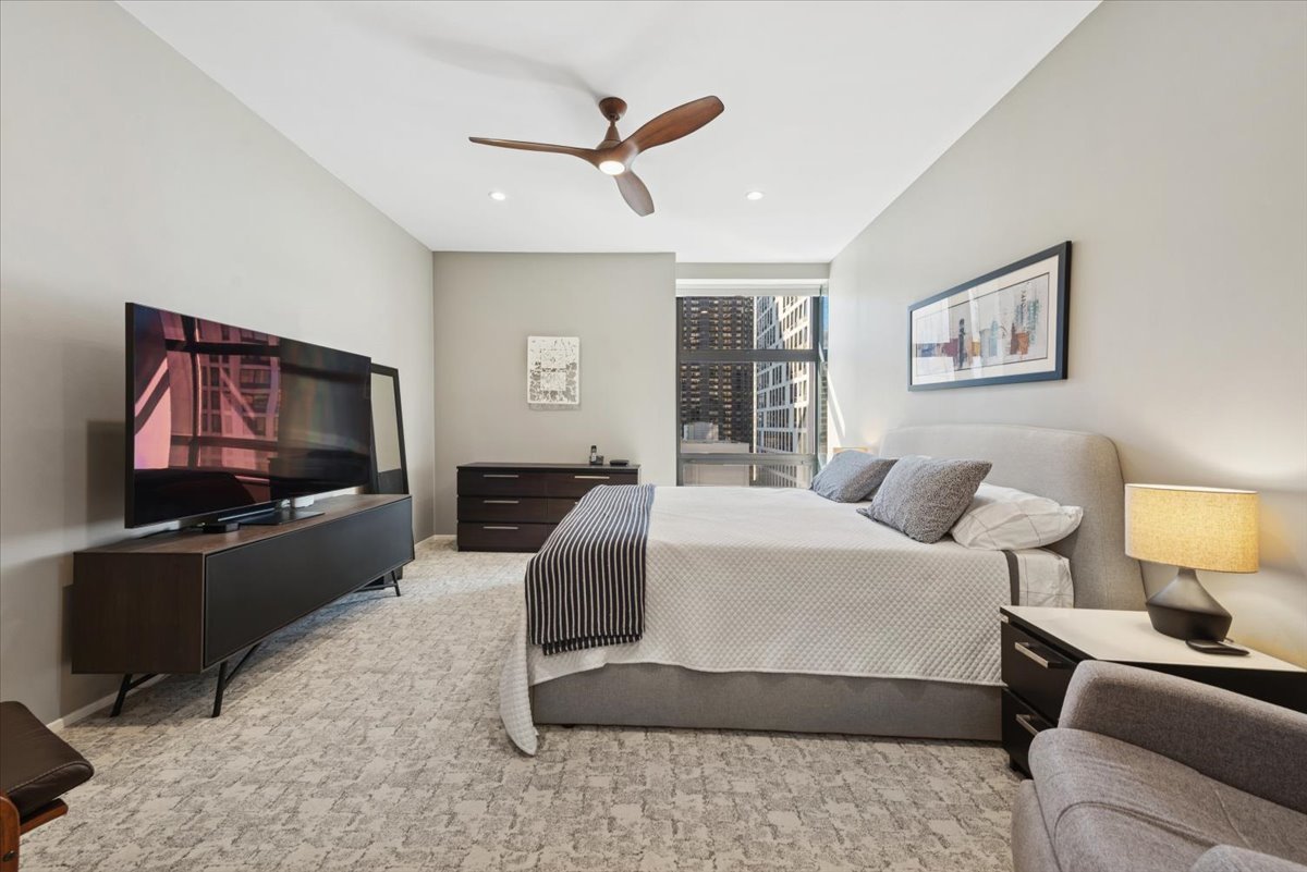 Stunning highly upgraded 3 bedroom with newly renovated kitchen and baths.Spectacular south facing views from oversized windows bring in tons of natural sunlight… The open kitchen has custom designed cabinetry and quartz countertops with built in quartz table with waterfall edge. Built in Jenn-Air refrigerator, Jenn-Air convection oven and induction stove top and microwave oven/convection oven. Bosch dishwasher. Large Blanco granite sink and permanently installed water filter. Custom LED lighting throughout Motorized blinds. Full size washer and dryer. Custom cabinets and quartz countertop in primary bath. Customized ELFA step-in closets in primary bedroom. All new copper plumbing. Located in an iconic Streeterville landmark building, premium amenities include a 24 hour doorman, indoor pool, fitness room, an on-site cleaner/tailor, and restaurant/coffee shop. Situated in the heart of Streeterville, you’re within walking distance to Northwestern Hospital and the Magnificent Mile. A prime deeded parking space is available for $52K. This unit is available immediately and short notice for showings is ok