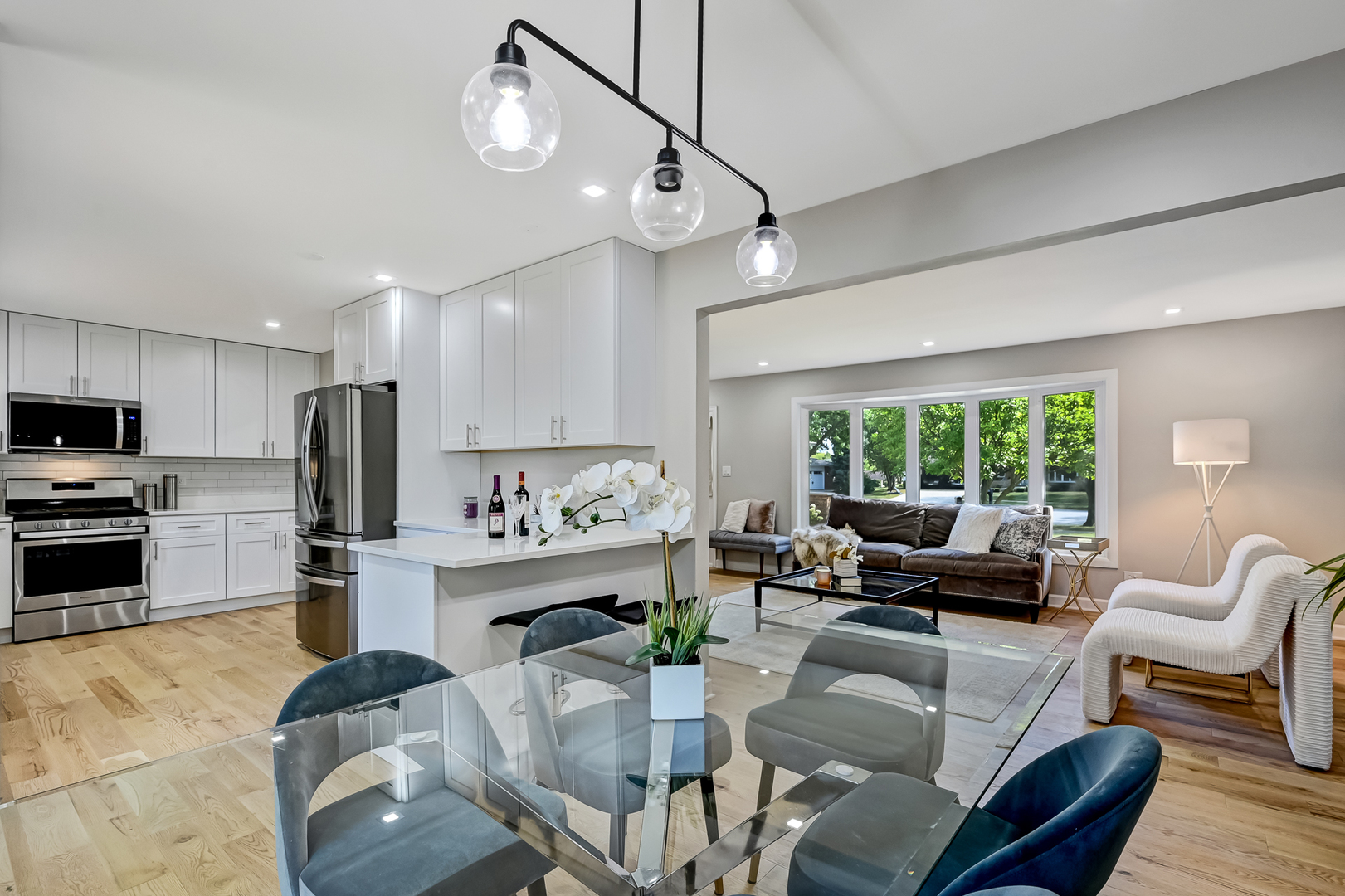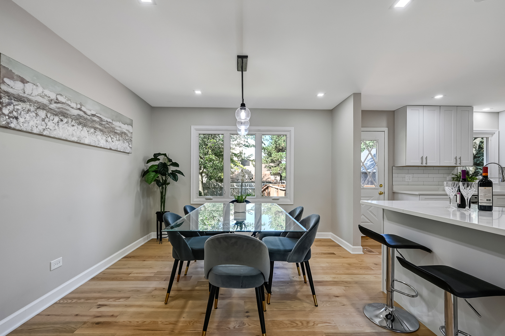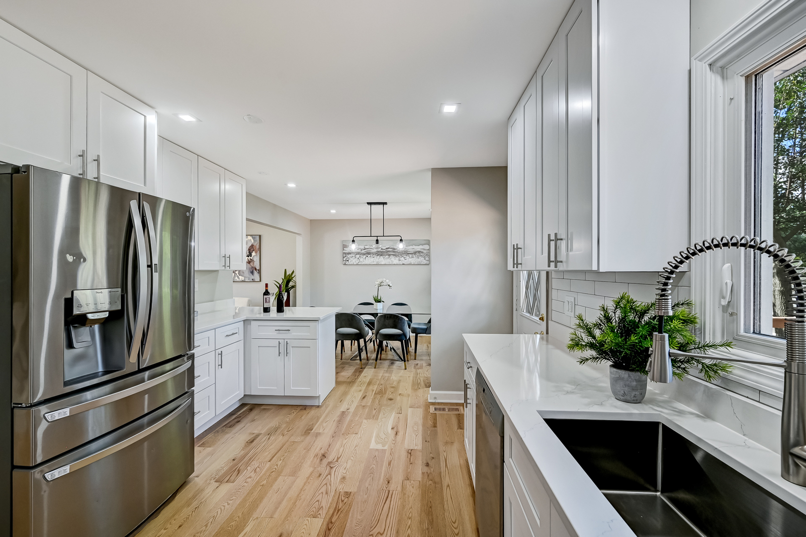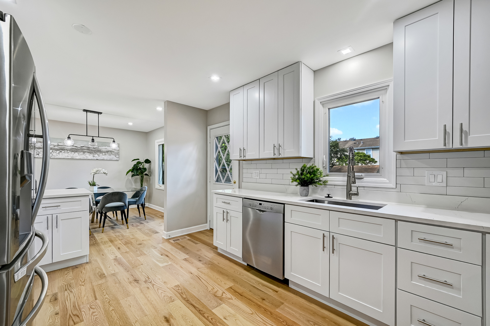 Gallagher & Henry split-level home, nestled on over a 1/4-acre fenced lot. This inviting residence offers 4 bedrooms and 3 full baths, featuring newly installed hardwood floors on the main and upper levels, and new vinyl flooring on the lower level. Brand new HVAC, newer roof, siding, and windows. The spacious and open living and dining areas seamlessly flow into a newly renovated kitchen, showcasing white cabinets with soft-close drawers, quartz countertops, stainless steel appliances, and a peninsula with breakfast bar seating. The upper level hosts three generously sized bedrooms, including the primary suite with a newly renovated ensuite bathroom. An additional newly updated full bathroom completes this level. The lower level boasts a family room with above-ground windows that flood the space with natural light, along with a versatile fourth bedroom or office, and a full bathroom just outside. Step outside to a private backyard oasis with a large deck and mature trees, perfect for relaxation and entertainment. The property also features an attached 2-car garage and a concrete driveway. Located in a tranquil neighborhood, this home offers easy access to elementary and high schools, shopping, dining, and I-355. Welcome home!