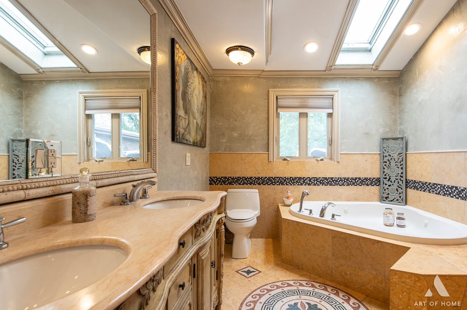 This stunning all-brick true ranch with 4+ bedrooms is tucked away at the end of a private cul-de-sac in a sought-after neighborhood, just minutes from shopping, dining, world-class golf courses, expressways, and more. From the moment you arrive at the stone-clad front entrance, you’ll sense the craftsmanship and elegance awaiting inside. Step into the welcoming foyer and discover an expansive open-concept main level filled with vaulted ceilings, custom details, and abundant natural light. The chef’s dream kitchen is the centerpiece, featuring timeless custom cabinetry, a coffered wood ceiling, a commercial-grade 6-burner stove with oven, an additional electric cooktop, built-in espresso machine, Sub-Zero refrigerator, wine cooler, and reverse osmosis water system. This extraordinary kitchen seamlessly connects to the dining area and spacious family room, highlighted by a stone fireplace, hardwood floors, and detailed millwork. Patio doors off the main living areas lead to your private backyard oasis, where a serene patio and elevated ipe ironwood deck await. Entertain or unwind with a jacuzzi, dining area, and complete privacy-no neighbors in sight. The other wing of the home features 4 bedrooms and 3.5 baths. The luxurious master suite showcases raised ceilings with crown molding, skylights, a spa-like bath with a glassless shower, soaking tub, and double vanity, plus a large walk-in closet with custom shelving. A second bedroom includes an en-suite bath and walk-in closet, while bedrooms three and four boast raised ceilings and share a full bath. The finished English basement offers endless possibilities with natural light from above-ground windows, a spacious entertaining area, an additional bedroom/office, laundry room, and generous storage. Sitting on nearly .7 of an acre, this 3,741 sq. ft. ranch is completed by an extended heated 2.5-car garage with epoxy flooring. Impeccably maintained with no expense spared, this home truly reflects pride of ownership. A must-see property where privacy, beauty, and craftsmanship come together.
