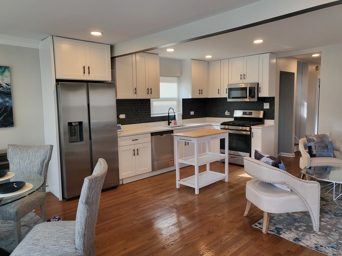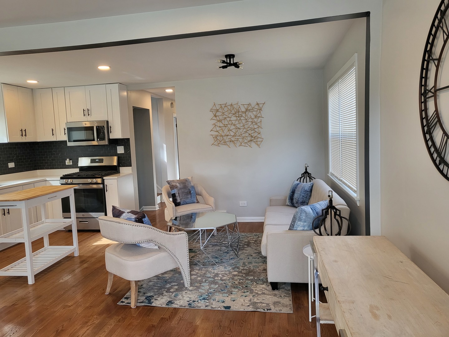 Solid Brick Home remodeled with all new modern finishes, new roof, finished attic and basement! The home welcomes you with bright & open great room with new kitchen w/ SS appliances, stone countertops, farmhouse sink and refinished hardwood flooring! This bright space has tons of windows and an easy flow. Take the stairs up to your expansive finished attic, great for your primary or entertainment space. Beautifully remodeled bath next to 2 main floor bedrooms and linen closet finish up the first floor. But take the stairs down to your open basement, additional bed and bath for those extra guests and you have a wonderful home on a nice block. Your privacy fence gives privacy to a generous yard and refurbished 2 car garage. Welcome home!