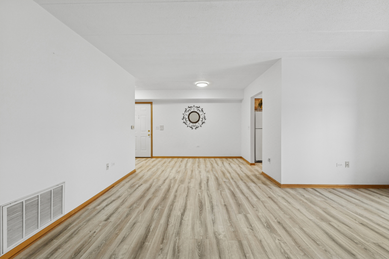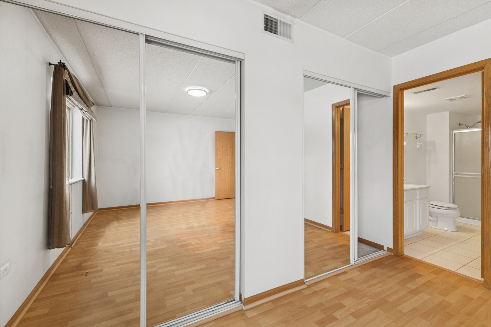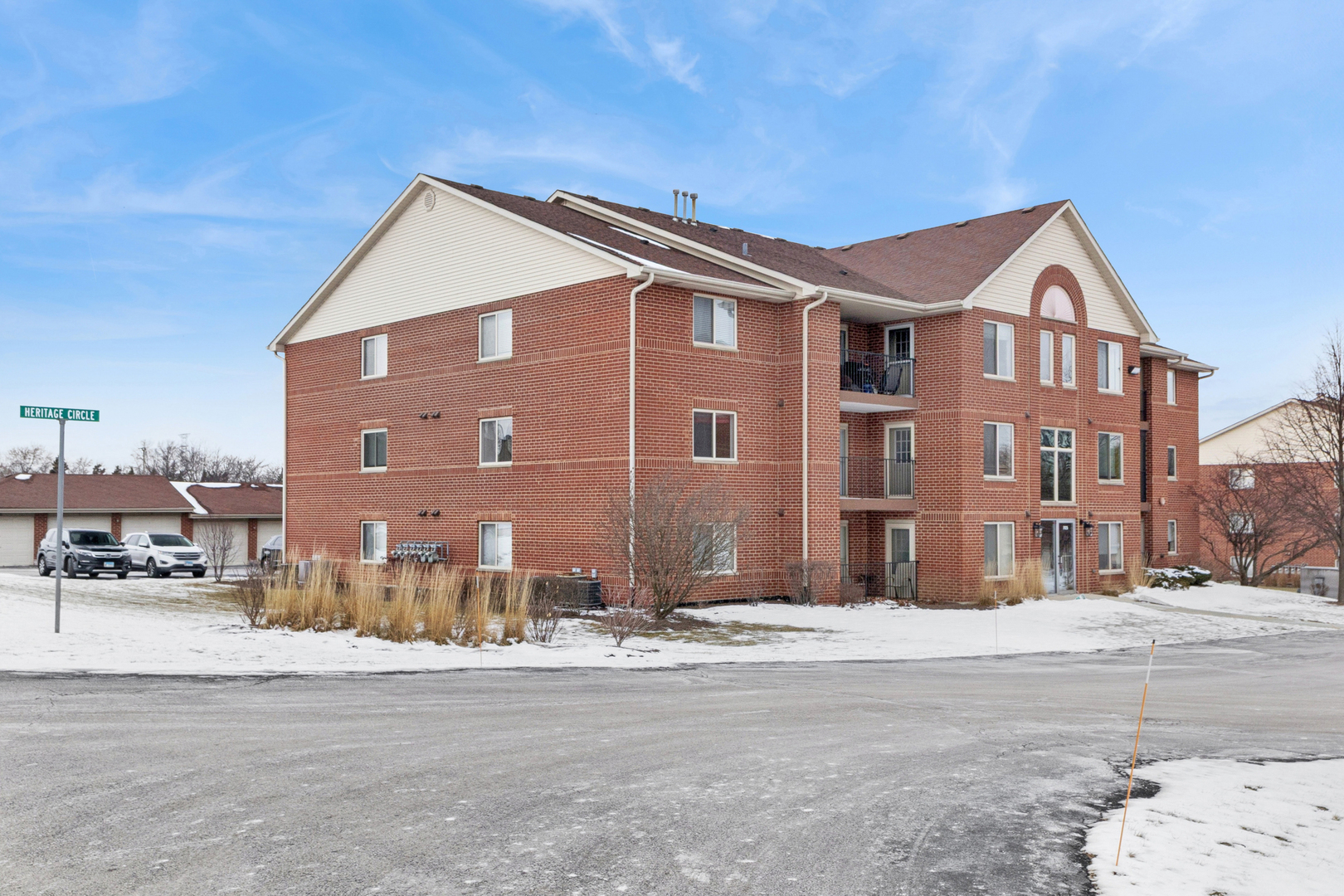 Welcome home to this well-maintained 2-bedroom, 2-bath condo in the desirable Heritage Circle community. This second-floor unit offers approximately 1,200 square feet of comfortable living space with an open layout, wood laminate flooring, and abundant natural light. The spacious kitchen features table-space dining and ample cabinetry, opening to a large living room ideal for entertaining. The primary bedroom includes a full en-suite bath, while the second bedroom is generously sized with easy access to the hall full bath. Enjoy the convenience of in-unit laundry, a private balcony, storage and a detached garage space included in the price. Solid brick construction, low monthly assessments that cover water, exterior maintenance, lawn care, snow removal, and insurance make this an easy, low-maintenance option. Pet friendly (dogs and cats welcome, 25-lb limit).