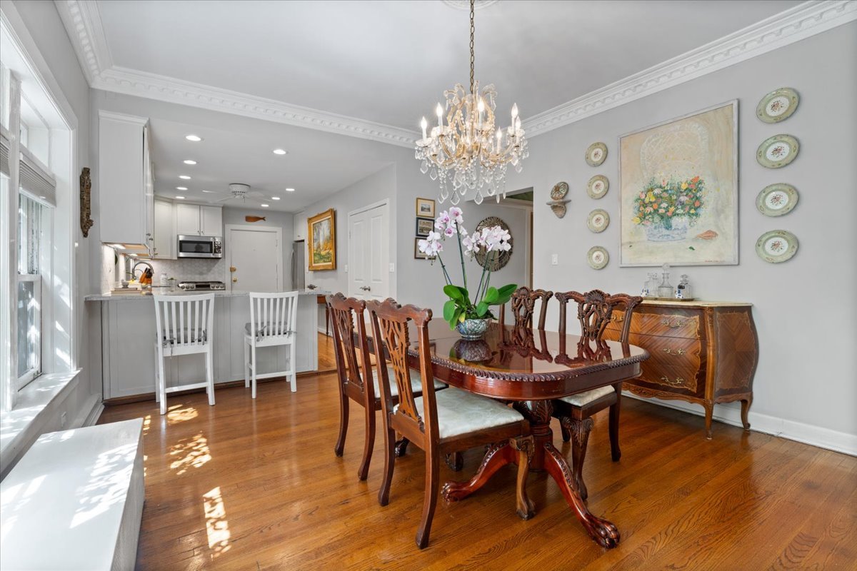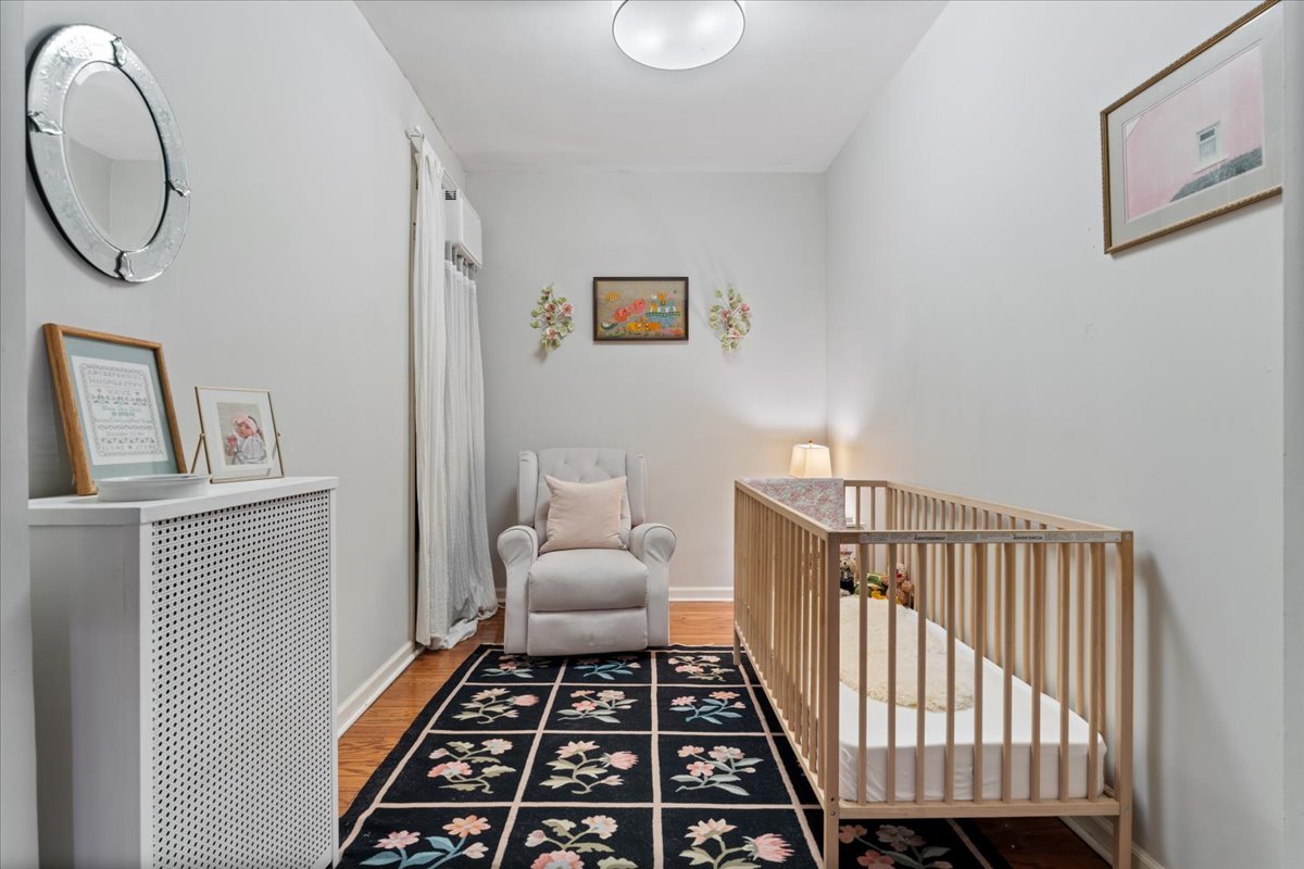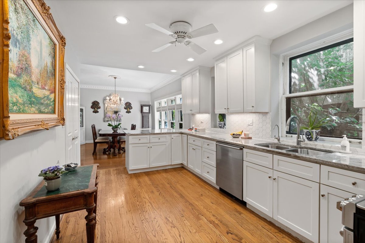 Situated on sought-after Buena Avenue in Chicago’s Buena Park, this sprawling 3-bedroom, 2-bathroom (plus sunroom!) residence is a rare 1920s gem and an extraordinary blend of history, elegance, and modern comfort. You’ll open the front door and immediately feel the scale of this home. The foyer greets you with tall ceilings and gleaming oak hardwood floors. As you head into the oversized living room, you will notice custom built-ins, a cozy fireplace, Gilded Age style crown molding, and large windows overlooking tree-lined Buena Avenue. A French door leads you into the sunroom. This is the ideal place for working, reading, or crafting. Enormous original windows bring in so much natural light, and shelving makes the perfect place for storage of all kinds. Back into the living room and down the hallway, you’ll make your way to the kitchen and dining space. Don’t forget to look up as you go. The ceiling was hand-painted by the current owner in the trompe l’oeil style. This is a design detail that is truly special and one-of-a-kind. In the kitchen and dining area, southern light pours in through a wall of windows. The kitchen is updated for today with crisp white cabinetry, marble backsplash, and striking countertops. There is a convenient pantry for additional storage, and it includes a hookup for installing a washer and dryer (there is also free laundry in the basement). The open-concept layout makes entertaining a breeze: in the extra-large dining room, you’ll have room for a buffet, 6-10 person table, and then some. Before you tour the bedrooms, be sure to take the back stairs down to the sprawling shared back patio and garden. This is a quiet place to enjoy a meal, read a book, or soak up some sun. This home offers three bedrooms, all with deep closets. Two of the bedrooms have an en-suite bathroom, each decked out in floor-to-ceiling subway tile and Duravit fixtures. The third bedroom boasts beautiful built-in bookcases, and a surprisingly large walk-in closet. 703 West Buena is an all-brick walk-up (dating back to the 1920s) in the most desirable pocket of Buena Park. The timeless building has a commanding entryway, convenient for mail and deliveries, and a traditional staircase with spindles that takes you up to the homes. From this address, you’re steps away from the enchanting Peace Garden that guides to quick access of the lake (the underpass is just down the street), Montrose Harbor, a swift 8 minute drive on LSD to downtown Michigan Avenue, and many CTA stops. For groceries, take a short walk to Whole Foods, Target, Jewel, Aldi, and the neighborhood farmers market. You couldn’t be closer to restaurants and bars (try The Green Mill for live jazz), and coffee shops (Dollop is around the corner), gyms, parks, Brennemann School, Disney Magnet School, and so much more. Welcome home.