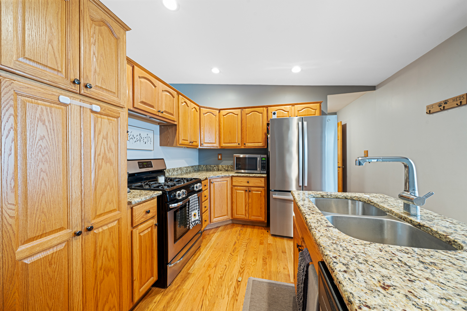 Move right in! Updated 3-bed, 1.5-bath home! Ideally located near the library and athletic/event center, this home offers convenience and comfort.The kitchen features granite countertops, stainless steel appliances, and a brand-new refrigerator. Enjoy hardwood floors throughout, six-panel solid doors, a 1-car attached garage, plus a massive 2+ car detached garage with A/C and concrete driveways. Additional updates include freshly painted bedrooms, newer ceiling fans, added attic exhaust fan, and upgraded insulation.Both bathrooms have been updated, and the main bath includes a relaxing steam shower. Roof (2012), furnace & A/C approximately 20 yrs old and have been serviced. Close to shopping, restaurants, and easy access to I-55 and I-355. A wonderful home-don’t miss it!