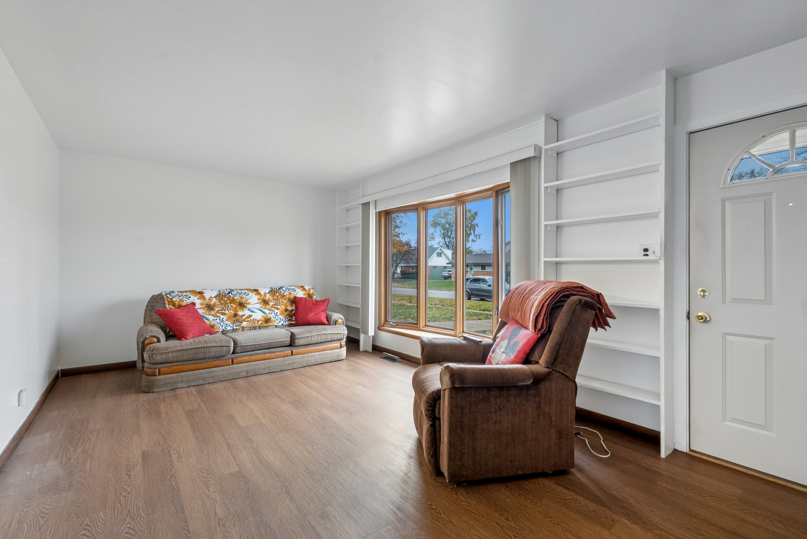 Welcome to this charming 4-bedroom home. This residence features beautiful wood laminate flooring throughout, creating a warm and inviting atmosphere. The updated bathroom has a walk-in shower, while the living room showcases built-in shelving, perfect for displaying your favorite decor. Freshly painted in a neutral color. This home offers an eat-in kitchen equipped with a pantry closet. Enjoy the convenience of a large 2-car garage for your vehicles and storage needs. The privacy-fenced backyard provides a perfect retreat for outdoor entertaining or relaxation. The hot water tank is 3 years old, the A/C is 10 years old, and the refrigerator is 5 years old. Nestled in a desirable neighborhood, you’ll have easy access to local amenities, parks, and major expressways.
