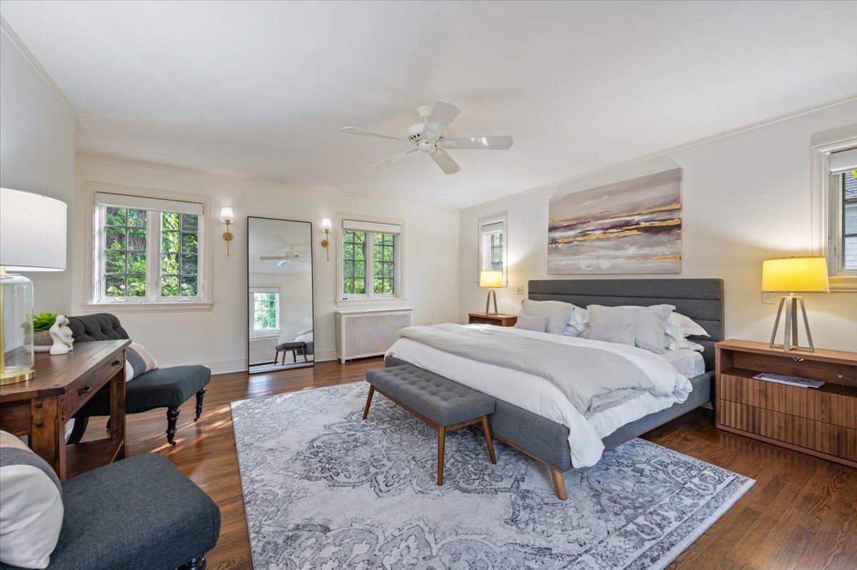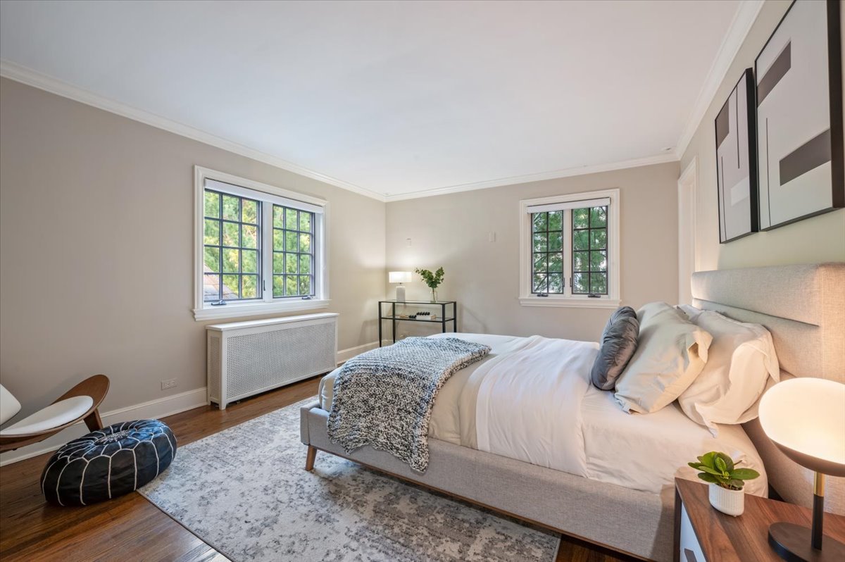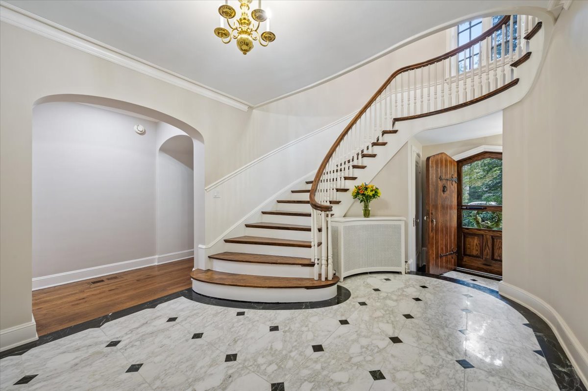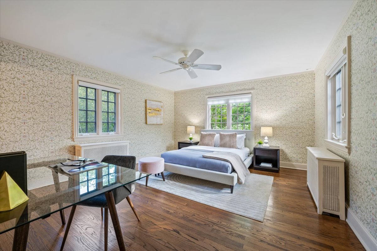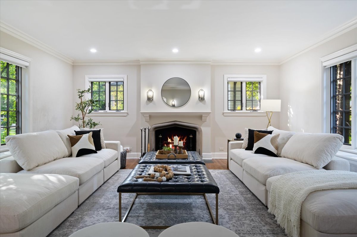 An Enchanting English Oasis in the Heart of East Wilmette. Welcome to a storybook English country home nestled within a lush, tranquil garden sanctuary-an exceptional retreat located on a coveted street in walkable East Wilmette, just steps from the beach, town, Metra, parks, and top-rated schools. Timeless architectural elegance and quality craftsmanship define this one-of-a-kind residence, where rich moldings, curved walls, and gracious proportions blend effortlessly with modern updates. A marble-floored entry foyer with a sweeping curved staircase sets the tone for the refined interiors. The sunlit living room, featuring a fireplace and serene views of both front and rear gardens and the formal dining room are perfect for entertaining. French doors lead to a wide hallway adorned with a wet bar and built-in desk, flowing seamlessly into the breathtaking 10-foot-ceiling family room. This inviting space includes a fireplace, custom bookshelves, a large bay window, and enchanting garden views. An adjoining round breakfast room connects to the covered back porch and magical yard, while the bright white kitchen offers a central island, pantry, and high-end appliances-truly the heart of the home. Upstairs, the spacious primary suite overlooks the gardens and features a luxurious bath with double sinks, soaking tub, and separate shower. A charming adjoining sitting room with fireplace and window seats can serve as a 4th bedroom or office. There are two additional bedrooms that share a Jack-and-Jill bath plus upstairs laundry perfectly positioned off the main hallway. The third level includes a 5th bedroom, full bath, and a large unfinished attic-ideal for a future teen hangout or game room. The lower level provides a partially finished rec room, utility and laundry areas, plus direct access to the yard. Step outside into your own private Eden-an authentic brick-walled English garden featured in Traditional Home magazine. Meandering pathways lined with perennials, handcrafted iron arches, a walled lily pond with fountain, and cozy seating areas create an unmatched sense of peace and beauty. A generous bluestone patio offers the perfect spot for outdoor dining and entertaining. This enchanting East Wilmette gem offers the rare combination of architectural charm, modern comfort, and a truly magical setting-ready to be cherished for generations. Special features include copper gutters, a slate roof, whole home generator, updated HVAC, electrical, plumbing and windows, newer garage with EV charging capability and heated apron, and more. This home is not to be missed.