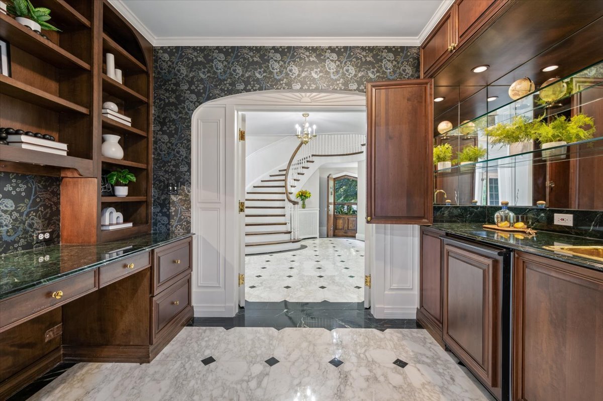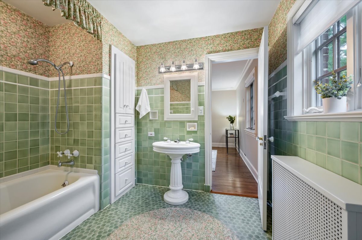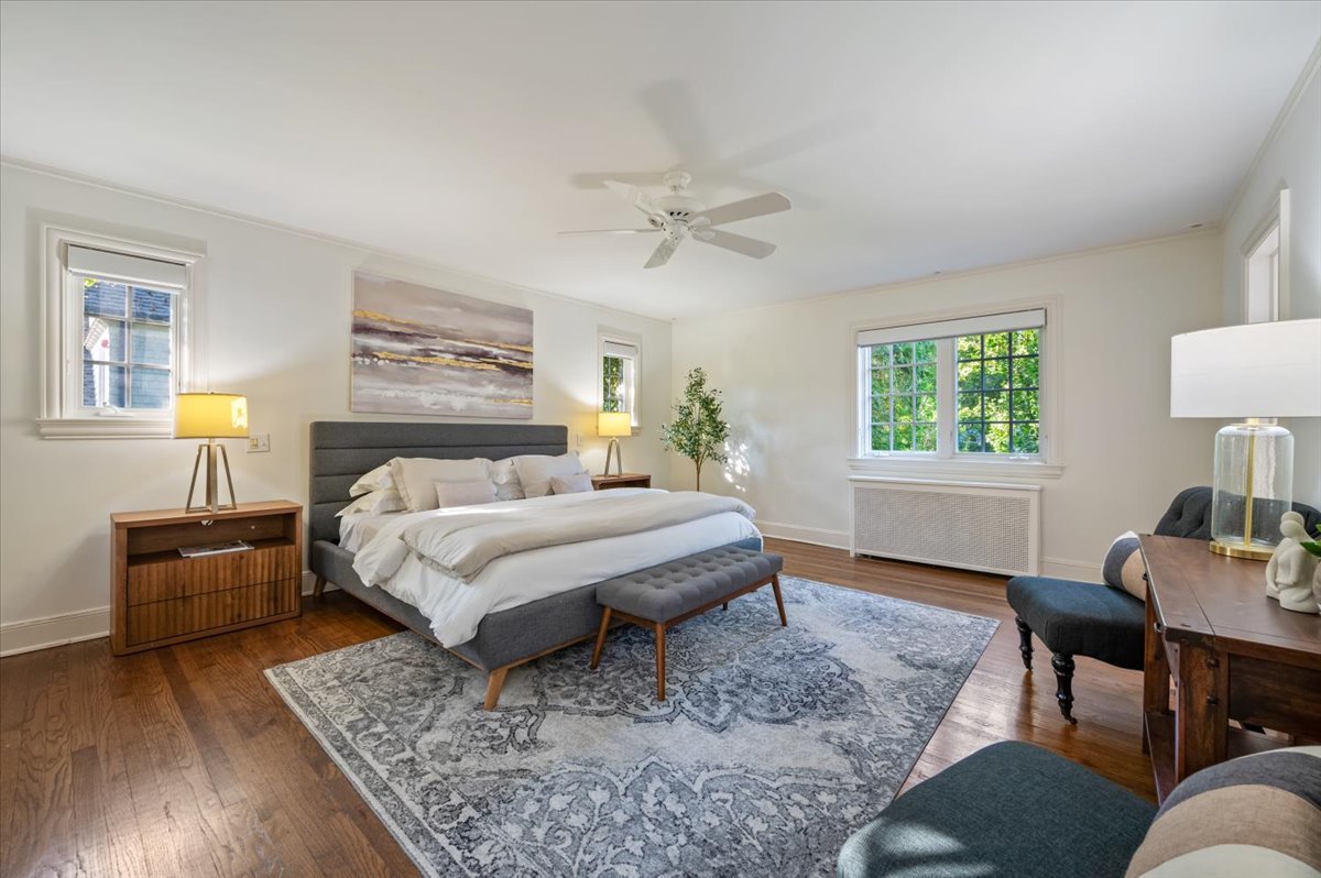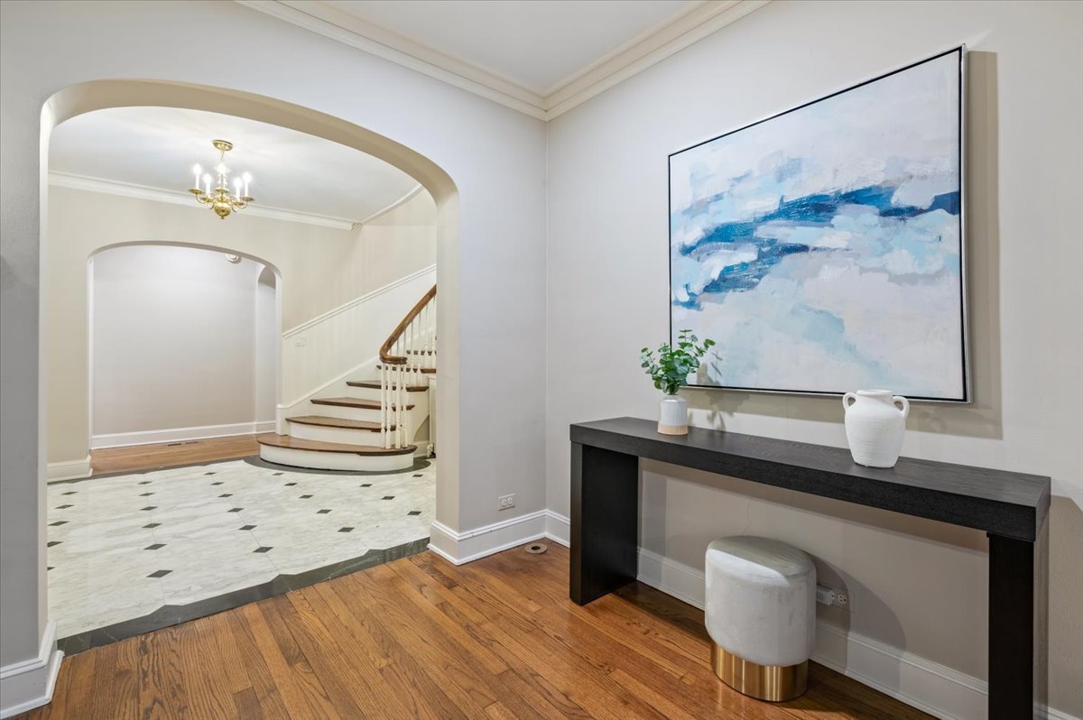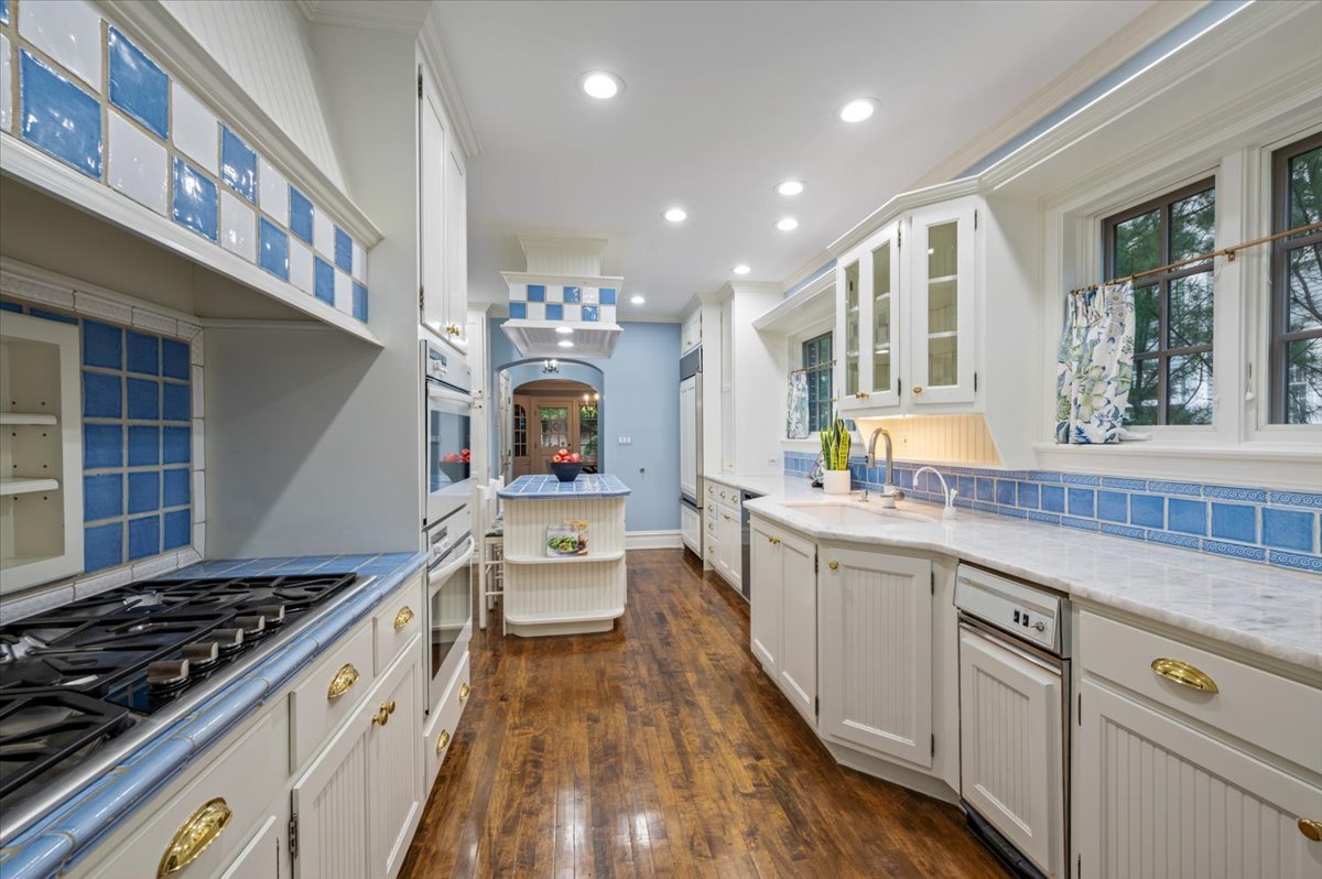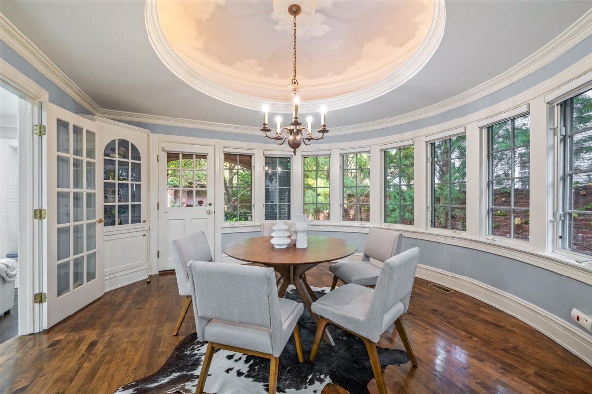 An Enchanting English Oasis in the Heart of East Wilmette. Welcome to a storybook English country home nestled within a lush, tranquil garden sanctuary-an exceptional retreat located on a coveted street in walkable East Wilmette, just steps from the beach, town, Metra, parks, and top-rated schools. Timeless architectural elegance and quality craftsmanship define this one-of-a-kind residence, where rich moldings, curved walls, and gracious proportions blend effortlessly with modern updates. A marble-floored entry foyer with a sweeping curved staircase sets the tone for the refined interiors. The sunlit living room, featuring a fireplace and serene views of both front and rear gardens and the formal dining room are perfect for entertaining. French doors lead to a wide hallway adorned with a wet bar and built-in desk, flowing seamlessly into the breathtaking 10-foot-ceiling family room. This inviting space includes a fireplace, custom bookshelves, a large bay window, and enchanting garden views. An adjoining round breakfast room connects to the covered back porch and magical yard, while the bright white kitchen offers a central island, pantry, and high-end appliances-truly the heart of the home. Upstairs, the spacious primary suite overlooks the gardens and features a luxurious bath with double sinks, soaking tub, and separate shower. A charming adjoining sitting room with fireplace and window seats can serve as a 4th bedroom or office. There are two additional bedrooms that share a Jack-and-Jill bath plus upstairs laundry perfectly positioned off the main hallway. The third level includes a 5th bedroom, full bath, and a large unfinished attic-ideal for a future teen hangout or game room. The lower level provides a partially finished rec room, utility and laundry areas, plus direct access to the yard. Step outside into your own private Eden-an authentic brick-walled English garden featured in Traditional Home magazine. Meandering pathways lined with perennials, handcrafted iron arches, a walled lily pond with fountain, and cozy seating areas create an unmatched sense of peace and beauty. A generous bluestone patio offers the perfect spot for outdoor dining and entertaining. This enchanting East Wilmette gem offers the rare combination of architectural charm, modern comfort, and a truly magical setting-ready to be cherished for generations. Special features include copper gutters, a slate roof, whole home generator, updated HVAC, electrical, plumbing and windows, newer garage with EV charging capability and heated apron, and more. This home is not to be missed.