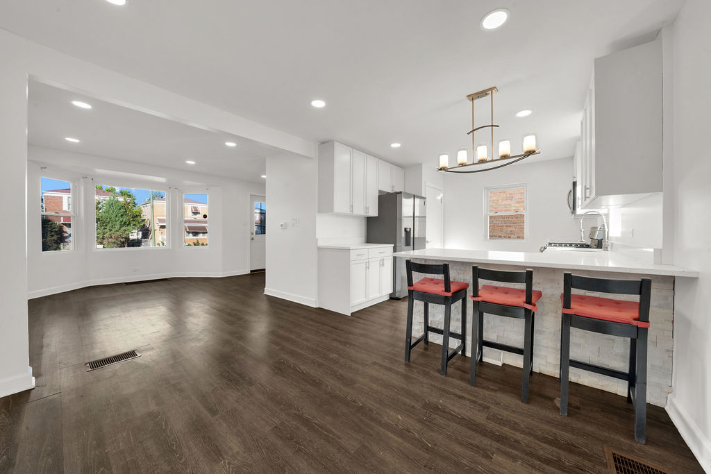 Welcome to this beautifully updated brick Georgian in the heart of Marquette Park! Fully remodeled in 2021 and well-maintained since, this 3-bedroom, 1.5-bathroom home offers modern comfort in a quiet, family-friendly neighborhood. Step inside to an open-concept living and dining area filled with natural light, complemented by luxury vinyl flooring and a neutral color palette. The fully remodeled kitchen features shaker cabinetry, sleek quartz countertops, and stainless steel appliances, creating a stylish space that’s both functional and inviting. Upstairs, you’ll find two spacious bedrooms, while the finished basement provides additional living or entertainment space. Freshly updated bathrooms add to the home’s appeal. Outdoors, enjoy a private backyard, perfect for summer gatherings, gardening, or simply relaxing – as well as a 2-car garage for convenience. Ideally located near schools, shopping, dining, and major highways, this move-in-ready home is a rare find. Schedule your private showing today!