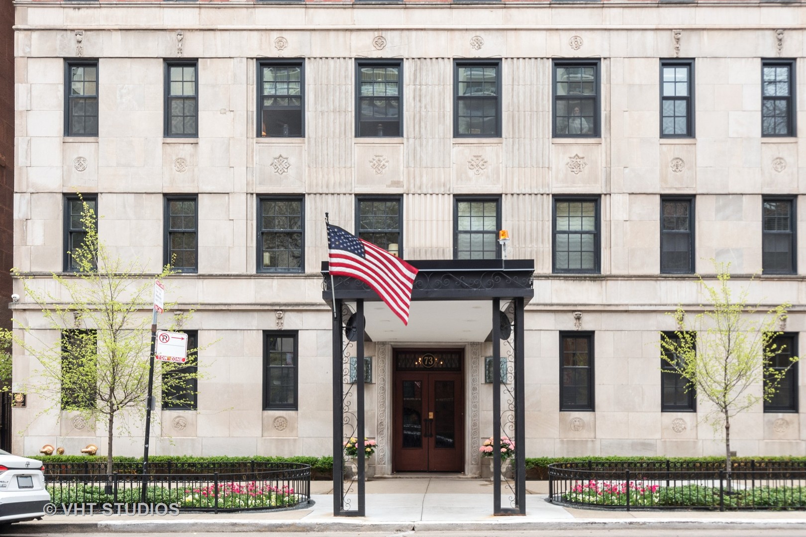 Be awed by this beautiful two-bedroom, two-bathroom vintage home located in the elegant McNally Quinn boutique elevator building, circa 1930. Stepping into the home, you are immediately greeted by its exquisite vintage details, including a formal entry with barreled ceilings, original doors and hardware, gorgeous parquet stained floors, meticulous crown moldings, chair rails, and arched doorways. The spacious living room, boasting 9′ ceilings and a decorative fireplace, offers tree-top views over quiet Elm Street and allows for multiple furniture configurations. The formal dining room is perfect for entertaining and could easily be opened to the adjacent kitchen for a more open floor plan. The galley kitchen features abundant cabinets, storage drawers, and a built-in dry bar with glass shelving. Tucked away is a grandfathered-in in-unit washer and dryer. The primary bedroom easily accommodates king-size furnishings and offers ample closet space. The second bedroom, currently utilized as a den, includes an ensuite bathroom and is lined with built-in bookshelves and storage on the west wall, complemented by multiple closets. Storage is plentiful throughout the home, featuring a walk-in utility/storage closet, a cedar closet, original wardrobes, and an additional storage closet included with the unit. Cable and internet are covered by the monthly assessment, and the condo benefits from new windows throughout. The McNally Quinn building offers excellent amenities, including a stunning landscaped roof terrace with panoramic views of Lake Michigan and the Chicago skyline, featuring multiple lounge areas and grills. Residents also enjoy 24-hour door staff, on-site maintenance and engineering, professional management, on-site laundry, pet friendliness, and bike storage. Located on quiet, tree-lined Elm Street, the building is just steps from the lakefront and a short walk to some of Chicago’s finest restaurants and shops. Multiple parking options are available nearby, including permit parking on Elm Street or rental parking at 1150 N. Lake Shore and 30 E. Elm.