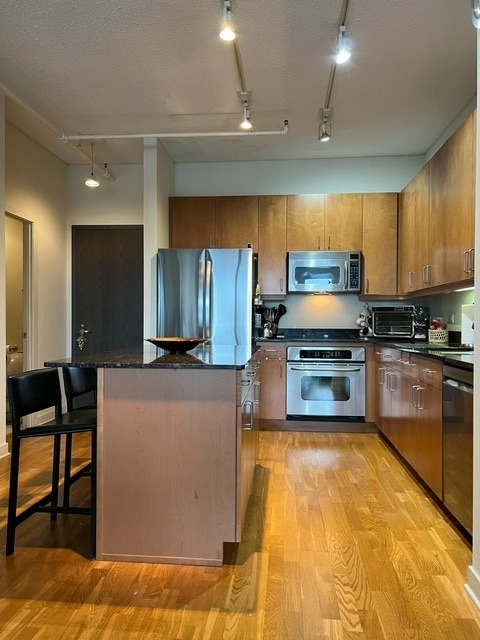 Welcome to Skybridge, where convenience, comfort, and remarkable city views meet in one of the West Loop’s most desirable buildings. This exceptional and rarely available 1 bedroom, 1.5 bath residence offers a bright, open layout with floor-to-ceiling windows in living room and bedroom, an extra-long west-facing private balcony – perfect for enjoying sunset views, morning coffee, or relaxed evenings at home. One of only a select number of units in the building offering this unique blend of natural light, space, and outdoor living. The kitchen features granite countertops, stainless steel appliances, and a spacious breakfast bar that opens to the living area, creating an ideal setting for everyday living and entertaining. The primary suite comfortably fits a king-size bed and a spa-inspired bathroom with double vanity, soaking tub, and separate shower. A guest powder room, in-unit washer and dryer, and hardwood floors add both function and elegance. Skybridge is a full-amenity building offering a 24-hour doorman, fitness center, rooftop sun deck, private dog walk, bike room, and additional storage. Direct indoor access to Whole Foods provides unmatched convenience. Garage parking available for $35k. Located just steps from Randolph Street’s renowned Restaurant Row, Fulton Market District, Greektown, parks, nightlife, and major transit – this is West Loop living at its finest.
