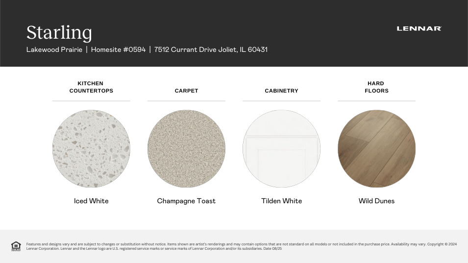 SPECIAL FINANCING OFFERS AVAILABLE! READY FOR FEBRUARY DELIVERY! Homesite# 0618 Unveil the Starling, an expertly constructed home where exceptional design blends effortlessly with everyday comfort. This airy design offers four bedrooms, two bathrooms, a powder room, and a versatile flex room, perfect for adapting to your lifestyle. Luxury vinyl plank flooring flows throughout the main living space, creating a warm and inviting atmosphere in the open-concept family room, dining area, and kitchen. The chef-inspired kitchen features stainless steel appliances, sleek 42″ cabinetry, elegant quartz countertops, and a large island that serves as both a focal point and a functional workspace. A built-in pantry adds extra convenience and storage. The owner’s suite, situated on the upper level, is an oasis with a generous walk-in closet and a spa-like en-suite bathroom. The bathroom includes double sinks and a deluxe shower, creating a luxurious space for relaxation. Three additional bedrooms share a full bathroom, and the convenience of a second-floor laundry room makes everyday tasks easier. The first floor features a flexible space that can be customized to fit your needs-whether it’s a home office, dining room, or entertainment area, the possibilities are endless. Additionally, a standard two-car garage provides ample parking and storage. Exterior will be Indigo color vinyl siding with Benton color brick. (pic for reference ONLY) *Photos are not this actual home* Welcome to Lakewood Prairie, a vibrant new master-planned community offering beautifully designed new homes in Joliet, Illinois. This thoughtfully developed neighborhood features family-friendly amenities including multi-use trails, a tot lot, and plenty of open green space-perfect for enjoying the outdoors and building a connected community. Situated in the heart of Joliet, Lakewood Prairie offers more than just a place to live-it offers a lifestyle. Joliet is a city rich in history, culture, and recreation, with easy access to world-class entertainment and everyday conveniences. Explore the charm of Downtown Joliet, located along the scenic Des Plaines River. This dynamic and walkable area is filled with local restaurants, boutique shops, and renowned museums. Signature events like the Taste of Joliet festival and the Joliet Christmas Parade bring the community together year-round for celebration and fun. Lakewood Prairie combines modern suburban living with the energy and accessibility of Joliet-offering the best of both worlds for families, professionals, and everyone in between.