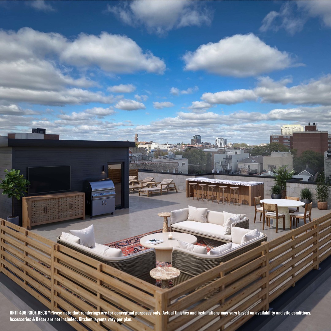 Welcome to Bishop on the Park! This is a first-look opportunity in a PREMIUM new construction condominium development featuring stunning, well laid out floorplans! All masonry, elevator building with attached, heated, EV-capable garage parking and separate storage included! Limited additional parking available for purchase. 754 Bishop is a statuesque corner building: our homes offer a variety of spacious 3bd/2ba floorplan units, each with private outdoor space. Unit 405 is a Penthouse Unit and has a two-tiered private rooftop deck accessible via interior stairs with sweeping skyline views! This Premier Penthouse will absolutely amaze with their nearly 20-foot ceiling heights and floor to ceiling windows. Ascend the stairs to your two-tiered private deck space! Absolutely spectacular. Primary suites with ENORMOUS room-sized walk-in closets! Luxurious ensuite with stand-alone tub, expansive double bowl vanities with plenty of storage and heated floors. Per plan, units include mudrooms laundry rooms with cabinet storage, coat closets, dry bars, more! Designer finishes have been carefully curated to elevate every detail! You’ll enjoy wide-plank wood floors, magazine-caliber luxury kitchen with Thermador appliance package including 36″ range and paneled fridge/freezer. Add the focal feature wall in living room for visual interest and warmth as an optional upgrade with gas fireplace possible. Early Buyers can impart their own design choices by selecting finishes including quartz countertops, backsplash, and paint. The location is ideal! Eckart Park has quickly become THE destination neighborhood anchored by the 9-acre park with open fields for pups and people alike! Fieldhouse with indoor pool and a gym, walking and running track. Best transportation options: walk to the Chicago BlueLine, easy access to the expressway, and at the confluence of Fulton Market, West Town, and River West neighborhoods. Chicago and Division Street provide great access to nightlife, restaurants, and a variety of retail shops while the parallel streets offer quiet streets lined with mature trees for a relaxing stroll. Delivery early-to-mid Q1 2026. Site is walkable and we are conducting on-site tours. Come select your perfect unit today!