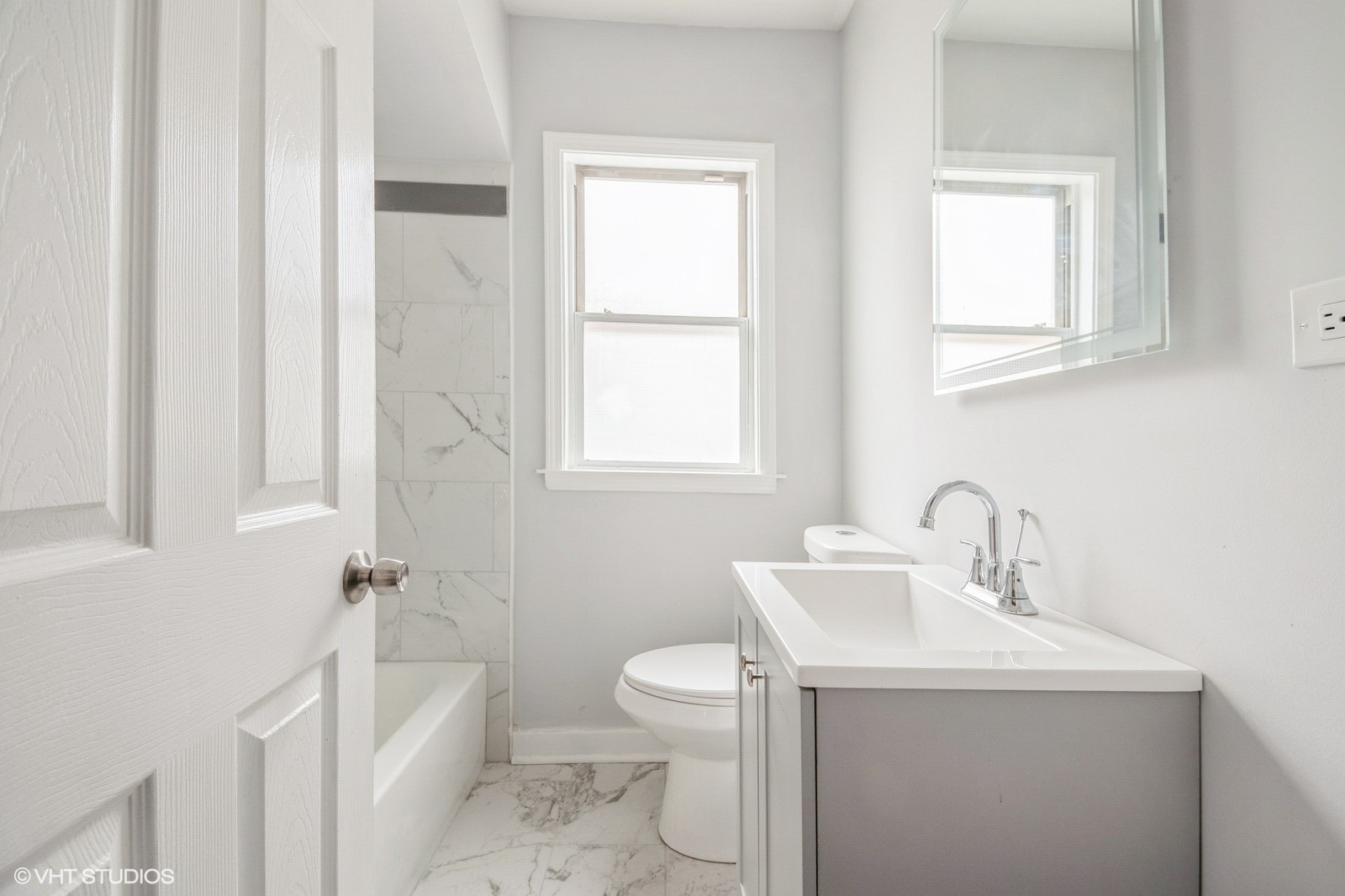 This 3-bedroom home features custom white trim, new lighting, freshly painted, updated kitchen with custom granite countertops, vinyl floor, wood cabinets and a set of stainless-steel appliances, a full bathroom with custom ceramic tiles and new vanity; living room with a fireplace, separate dining room and a closed porch.