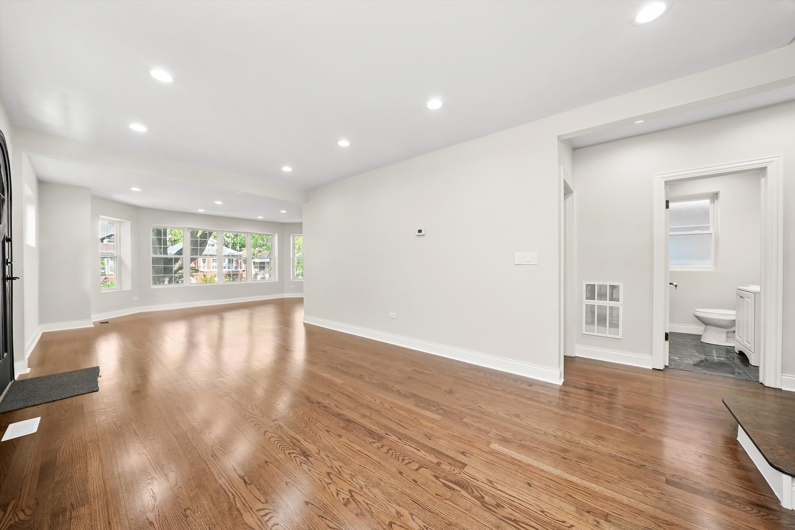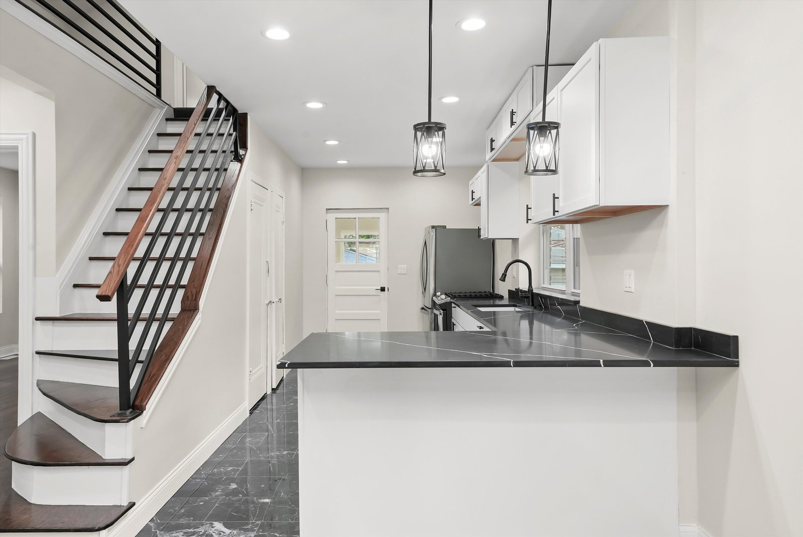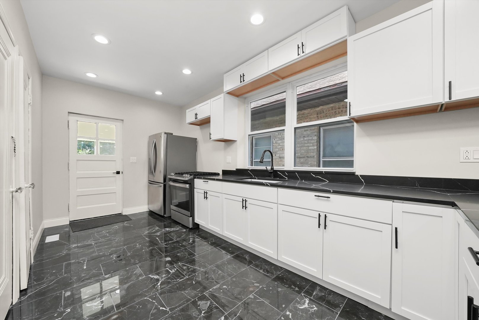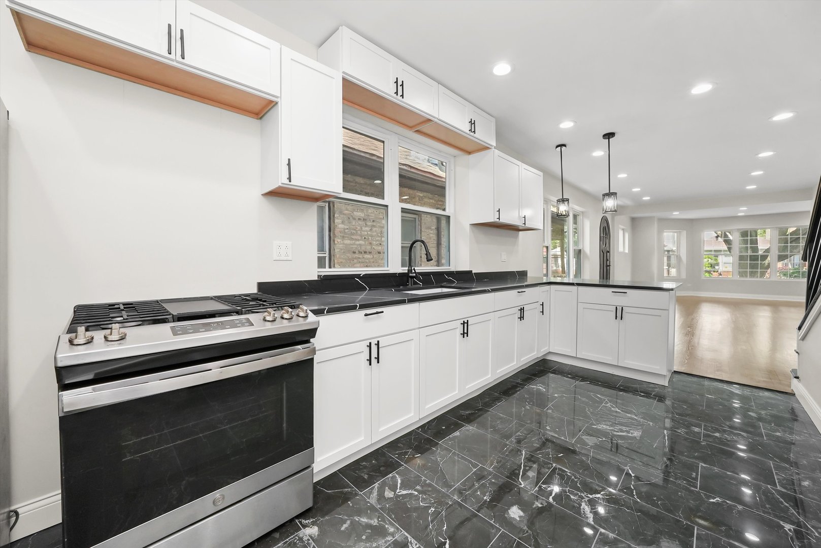 Beautiful brick bungalow completely remodeled. All new windows plumbing, electricity, kitchen cabinets with quartz countertops, hardwood floors, central heater and central air, side walks, all new wooden fence, and siding in the back of the house. Basement finished with extra rooms all laminated and a walk-in shower, wooden deck.