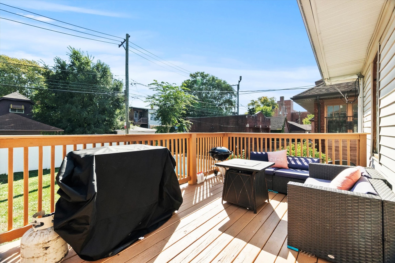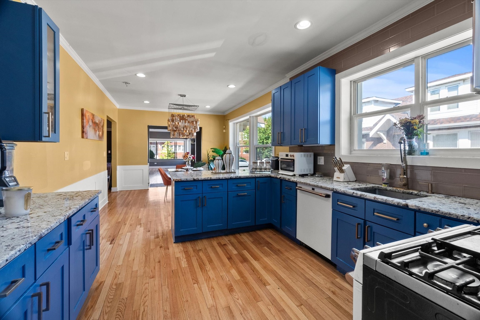 Welcome to this beautifully updated 5-bedroom, 2-bathroom brick bungalow, perfectly situated on a wide 50-ft lot with a private driveway. The sun-filled main level features gleaming hardwood floors and an open-concept layout that seamlessly connects the living room, formal dining area, and modern kitchen. The updated kitchen boasts granite countertops, newer cabinetry, a breakfast bar, and stainless-steel appliances-ideal for both everyday living and entertaining. Also on the main floor are three spacious bedrooms and a full bathroom. The cozy living room includes a charming fireplace, adding warmth and character to the space. Downstairs, the fully finished basement offers an extra-large family room, two additional bedrooms, a second full bathroom, and a dedicated laundry room-perfect for guests, extended family, or a home office setup. Step out from the main level onto your deck and enjoy the expansive backyard, complete with a well-maintained lawn, an above-ground pool, and a detached garage. This move-in-ready home has it all-space, style, and functionality. Don’t miss your chance to make it yours!