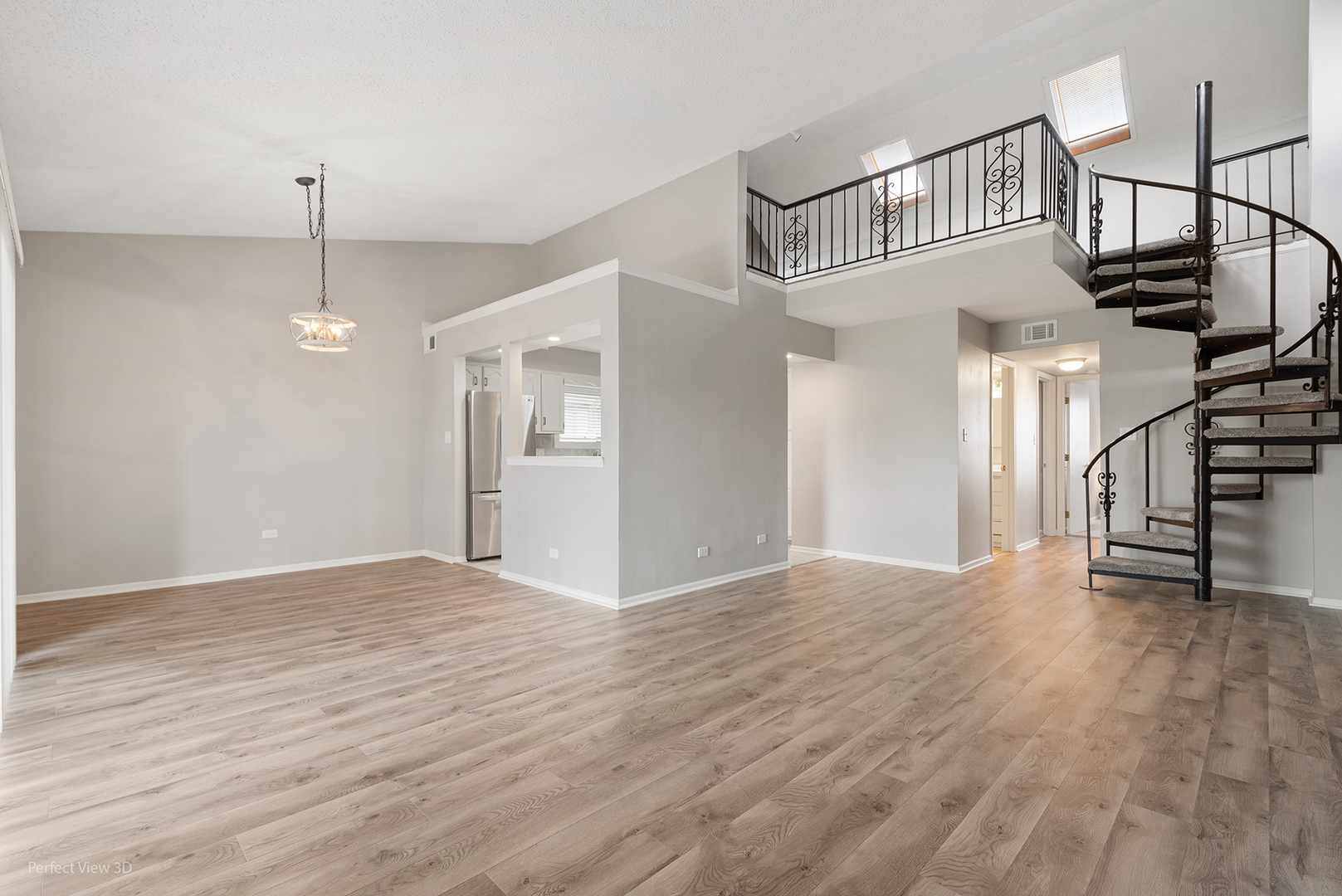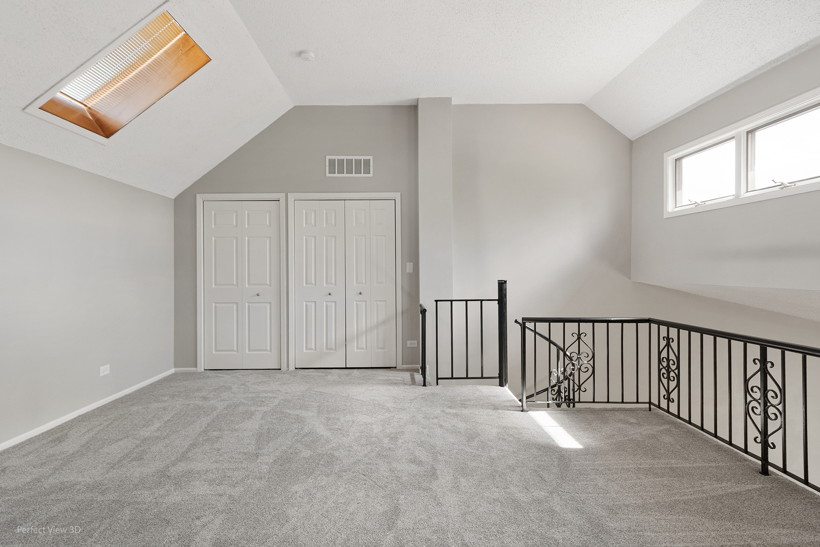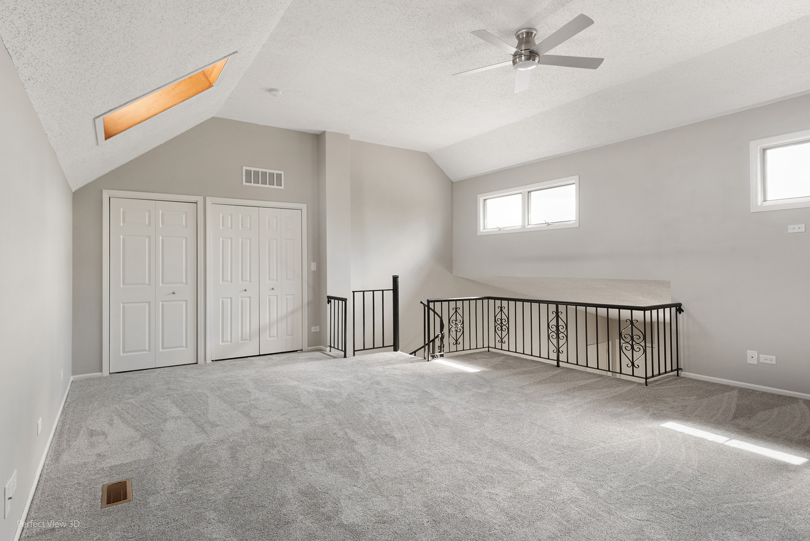 Newly renovated condo in 2025, 1,600 square foot, quiet 6-unit condo building, low HOA and well managed association. Incredibly spacious-loft style condo. 2 bedroom, 2 bath, living room, dining room, family room, with a second-floor large loft and eat-in kitchen. Kitchen has all new appliances, large new modern single-bowl sink and faucet. Central air, newer furnace, and hot water heater. All new lighting, window coverings, and ceiling fans. Bathrooms have new toilets, vanities, faucets, and quartz countertops. Large laundry room with new cabinets, ceiling, sink, counters, washer and dryer. New flooring throughout unit, including luxury vinyl in main living areas, and neutral carpet in bedrooms and loft. The loft has a gas fireplace that overlooks the living room, and it provides, walk in access, to floored attic, with plenty of additional storage. 1 car detached garage with new garage door opener and keypad, compatible with smart phone, as well as one additional assigned parking spot behind building. Building has maintenance free brick hallways, new roof on building and garages, as of September 2025. Enjoy the view from the 3rd floor balcony, that boasts an additional large storage closet, close to train, shopping, walking paths, parks, and Tinley Park recreation center. This is a MUST SEE! Schedule your viewing asap, this one will not last.