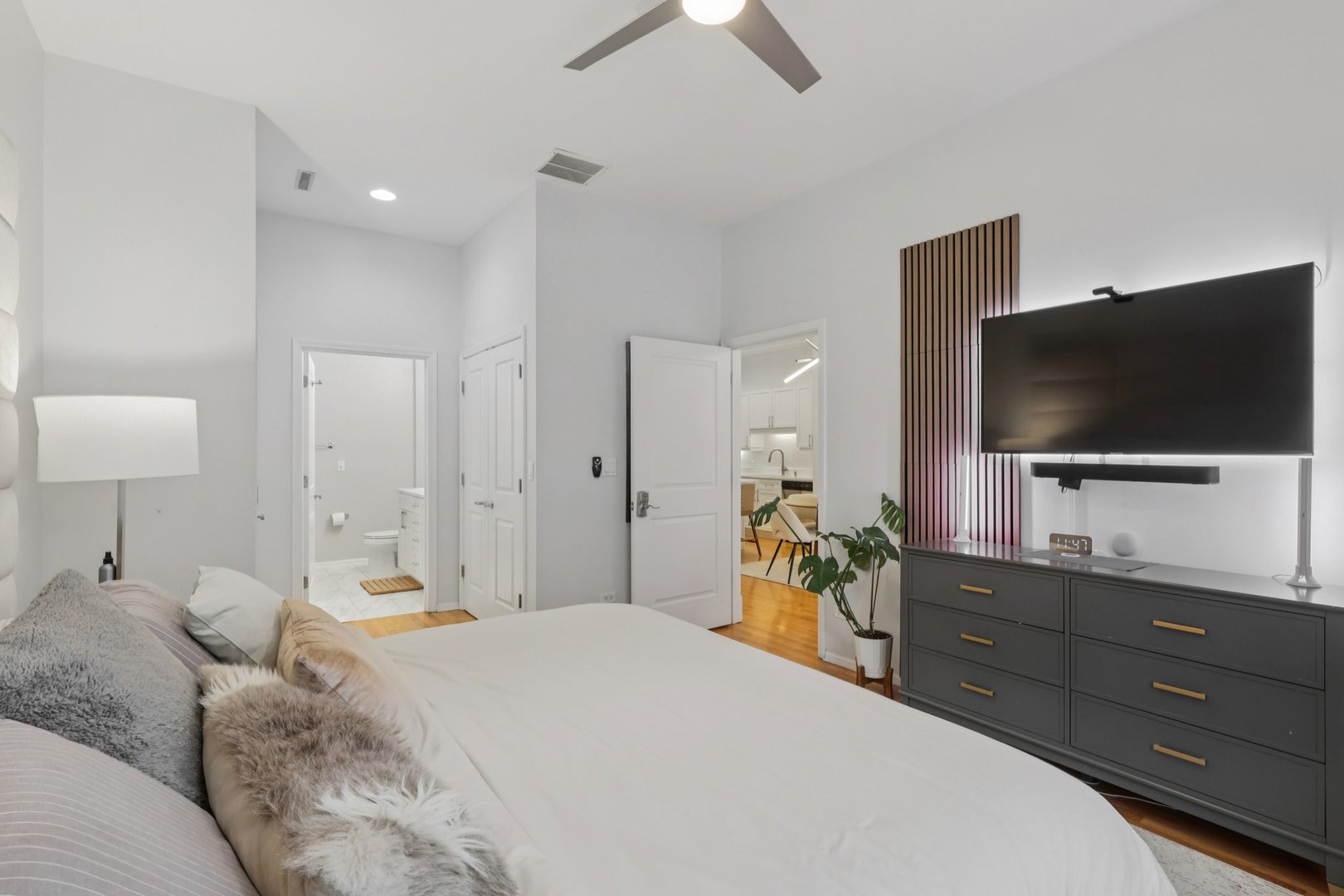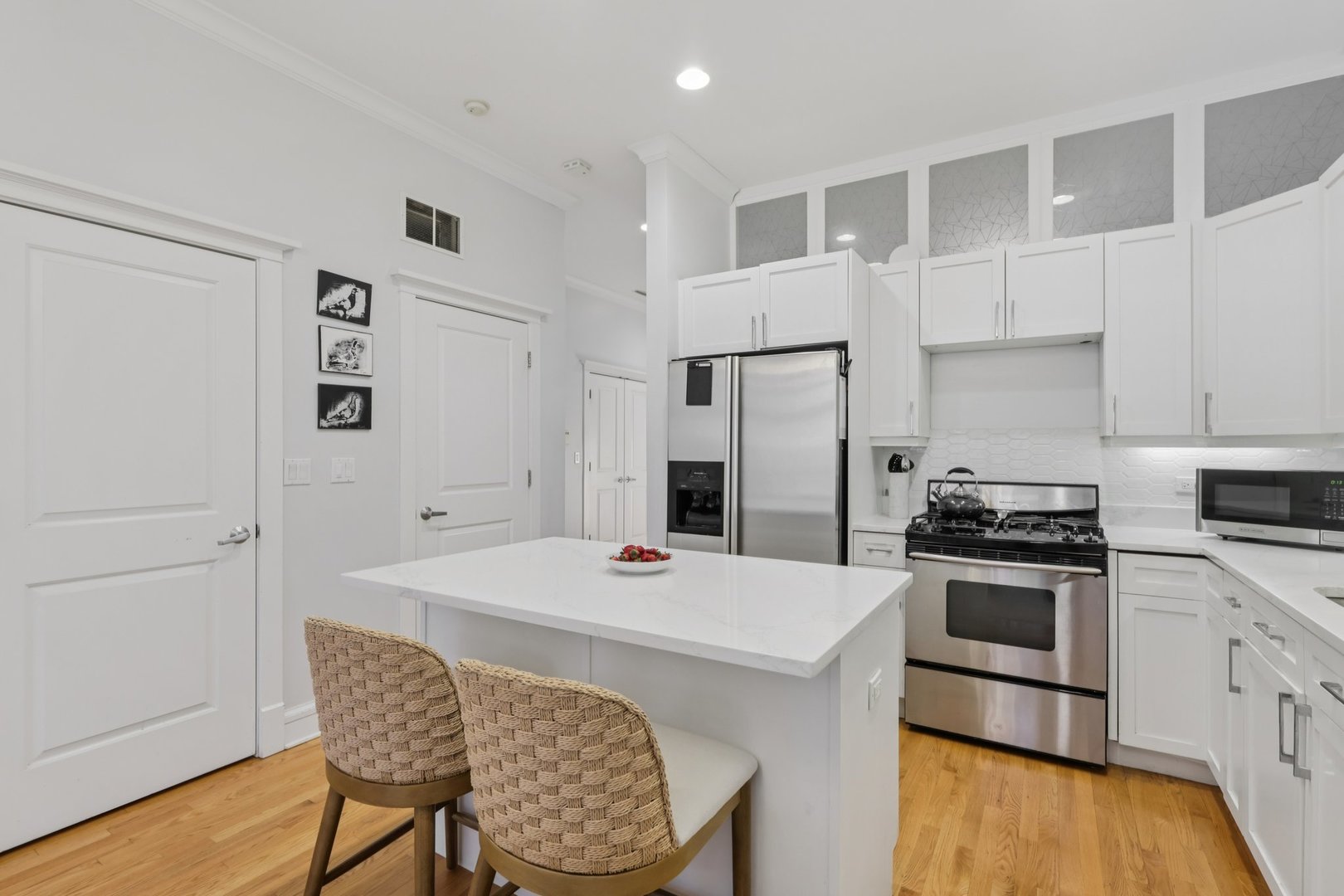 Welcome to this stunning 2-bedroom, 2-bath condo located in a boutique elevator building in a prime Boystown location! Your new home welcomes you with 10-foot ceilings and hardwood floors throughout. The spacious living room offers a gas fireplace, floor-to-ceiling windows that let in tons of natural light, and ample space for a dining table. The kitchen is open to the living area and features 42-inch maple cabinets, stainless steel appliances, a large island with breakfast bar and quartz countertops (2022). The primary bedroom offers dual closets, a ceiling fan and private en suite with dual vanity, whirlpool tub and separate walk in shower. The secondary bedroom is perfect for guests or a home office and provides easy access to the hall bathroom. Hardwood was added to both of the bedrooms in 2020 and the existing hardwood floors were refinished to match. Other upgrades include Washer and dryer (2017), HVAC (2020), paint (2020), glass in most windows (2020). Enjoy your morning coffee or unwind in the evening on the private balcony overlooking Halsted Street. One assigned heated garage parking space is included in the price. Unbeatable location close to the Red Line, multiple buses, parks and with easy access to the lake and Wrigley Field. Blocks to all the shopping and dining on Clark and minutes to the Southport Corridor and Roscoe Village. Zoned to highly rated Nettelhorst Elementary and Lake View High School – this home checks every box.