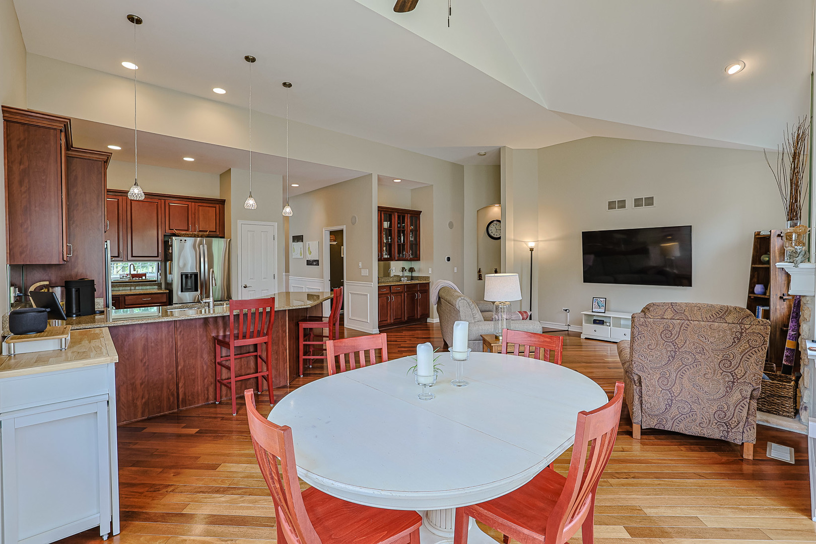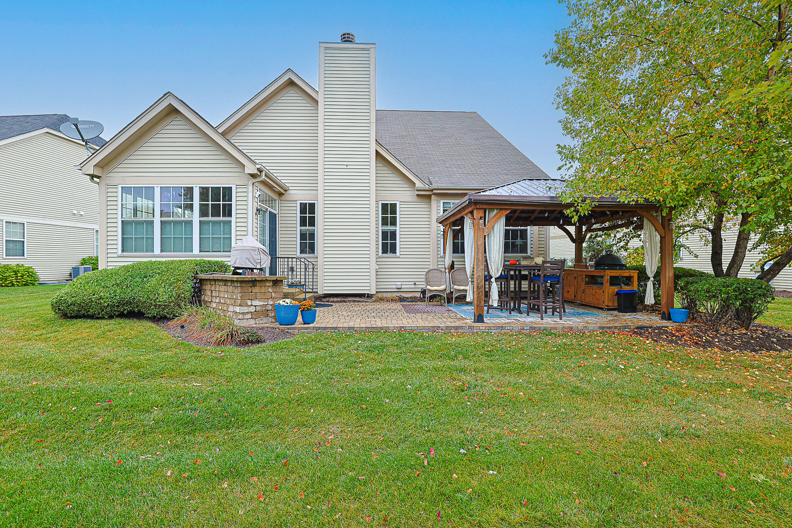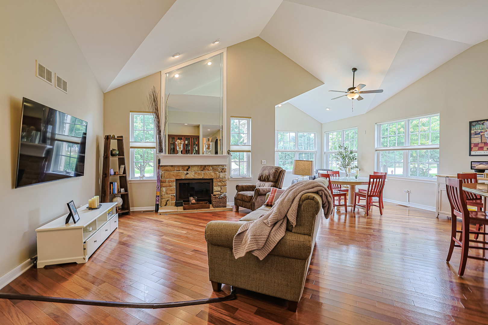 Must see in person! This recently painted home has so much storage and so many upgrades like architectural ceilings, gorgeous hardwood floors, and a suana just to name a few! The first floor primary suite includes vaulted ceilings with a walk in closet and organizer, a second separate closet, and private bath with shower and dual sinks at gentlemen’s height. The first floor also includes a formal dining room and office that could be used as a fourth bedroom. The kitchen has tall cabinets with stainless steel appliances, a new refrigerator, granite countertops and a pantry closet. There’s a spacious eating area that opens to the sunroom that looks out at a lush backyard with pergala and no neighbors behind the home. The family room has a cozy fireplace with lots of light from surrounding windows and a wet bar with glass cabinets that coordinate with the kitchen. Upstairs there’s a loft that’s hardly been used with a giant closet and a huge bedroom with a walk in closet, and a bathroom with a separate linen closet. The finished basement was professionally remodeled in 2023 and includes a full bathroom with a built in sauna, a bedroom with a walk in closet, two storage rooms, and a huge family room that also has space for workout equipment and a bar. Located close to our neighborhood clubhouse with family and adult swimming pools, workout rooms, tennis/pickleball courts, ponds and walking trails. Just minutes from shopping and diningdinning! This is an active adult 55+ community. HOA does all the snow removal and lawn care so you can relax and enjoy. Come see your new home!