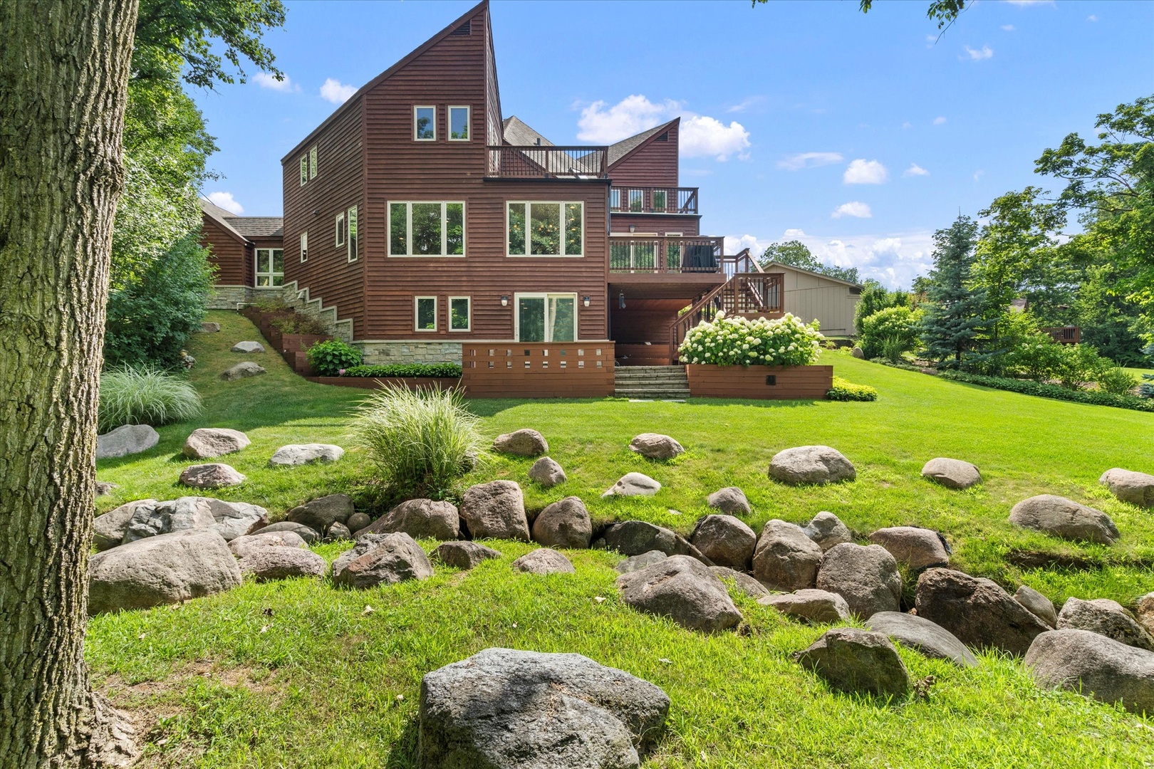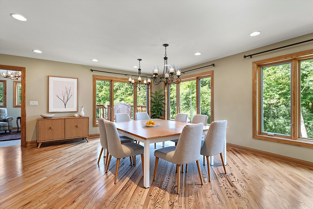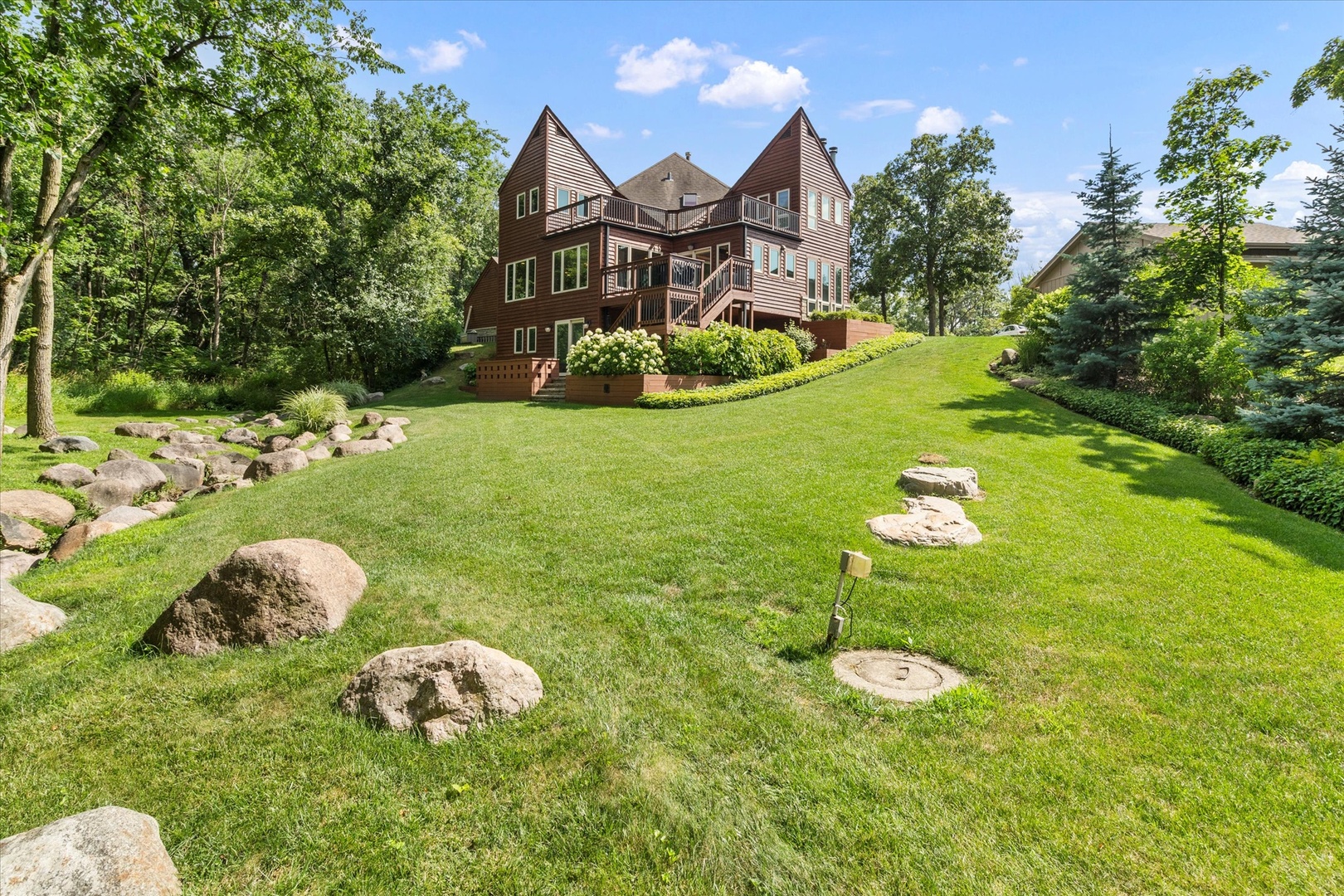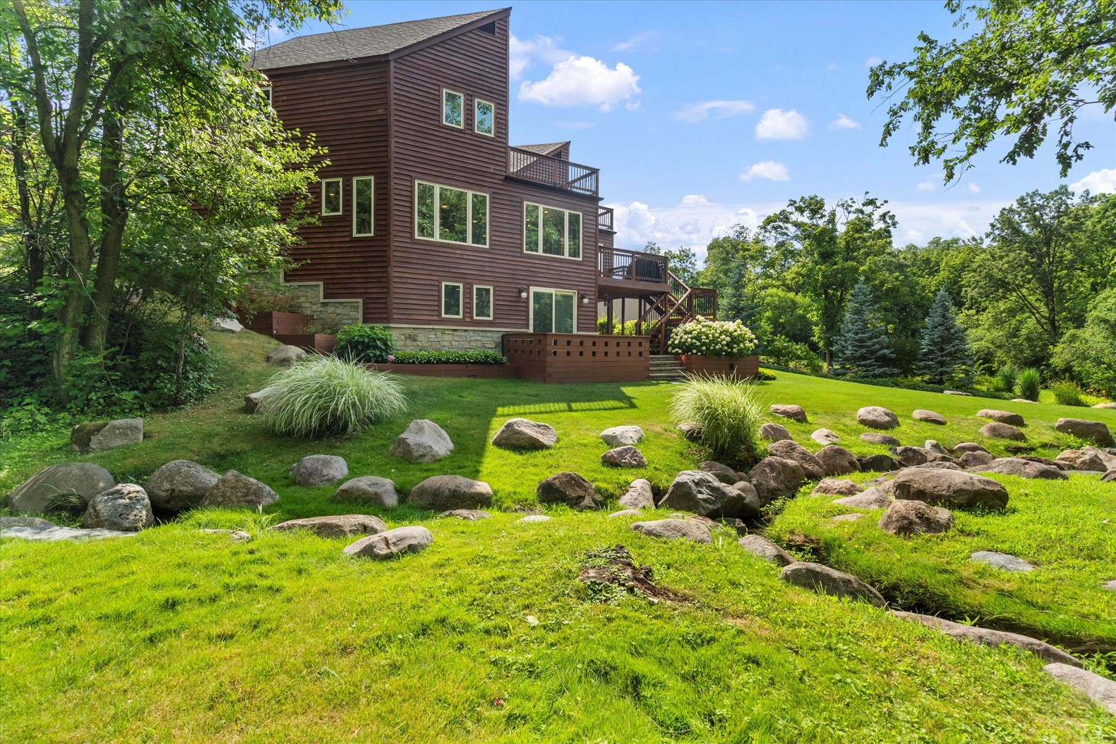 ONE-OF-A-KIND OFFERING! Nestled in a storybook setting on over 1 acre lot and surrounded by flourishing trees. Eccentric exterior accented by stone, cedar and striking peaks that bring so much character to its facade. Upon entering you’re greeted by an elongated foyer and dramatic staircase highlighted by decorative glass. Impressive family room offers multiple entertaining spaces, an abundance of windows for natural sunlight and a custom stone fireplace. Gorgeous chef’s kitchen is any buyer’s dream with furniture quality cabinetry, granite countertops, stainless steel appliance package, an expansive center island, breakfast bar seating and a walk-in pantry. A sizable dining room/breakfast room off the kitchen that offers additional seating and remarkable views of the lush grounds. Incredible and cozy sunroom with a rustic chandelier, stone fireplace, custom built-ins and access to the large deck. Upstairs you will find a unique master retreat with a beautiful fireplace, two walk in closets and custom floating/tray ceiling. Unwind in your private bathroom with a soaking tub, overhead skylight and a walk-in shower. Three additional bedrooms on the second level all have plenty of closet space and share a full bathroom. WALKOUT basement is an entertainer’s dream and includes an exceptional stone wet-bar, family room/media room and plenty of storage. Escape to a life of tranquility in this mesmerizing backyard that is a true showstopper. Great location close to Silver Lake Country Club/Golf Course, shopping, dining and more! Don’t miss this opportunity to view/own this rare one of a kind property. Updates include: Addition added to the back of the house, remodeled kitchen, replaced all appliances and over $40,000 in custom cabinetry. All windows in the house were replaced and the cedar siding. Over $100,000 in landscaping including all the rocks for the creek. The HVAC system and the water purification system are less than ten years old. The deck was also rebuilt. Hot water heater is less than a year old.