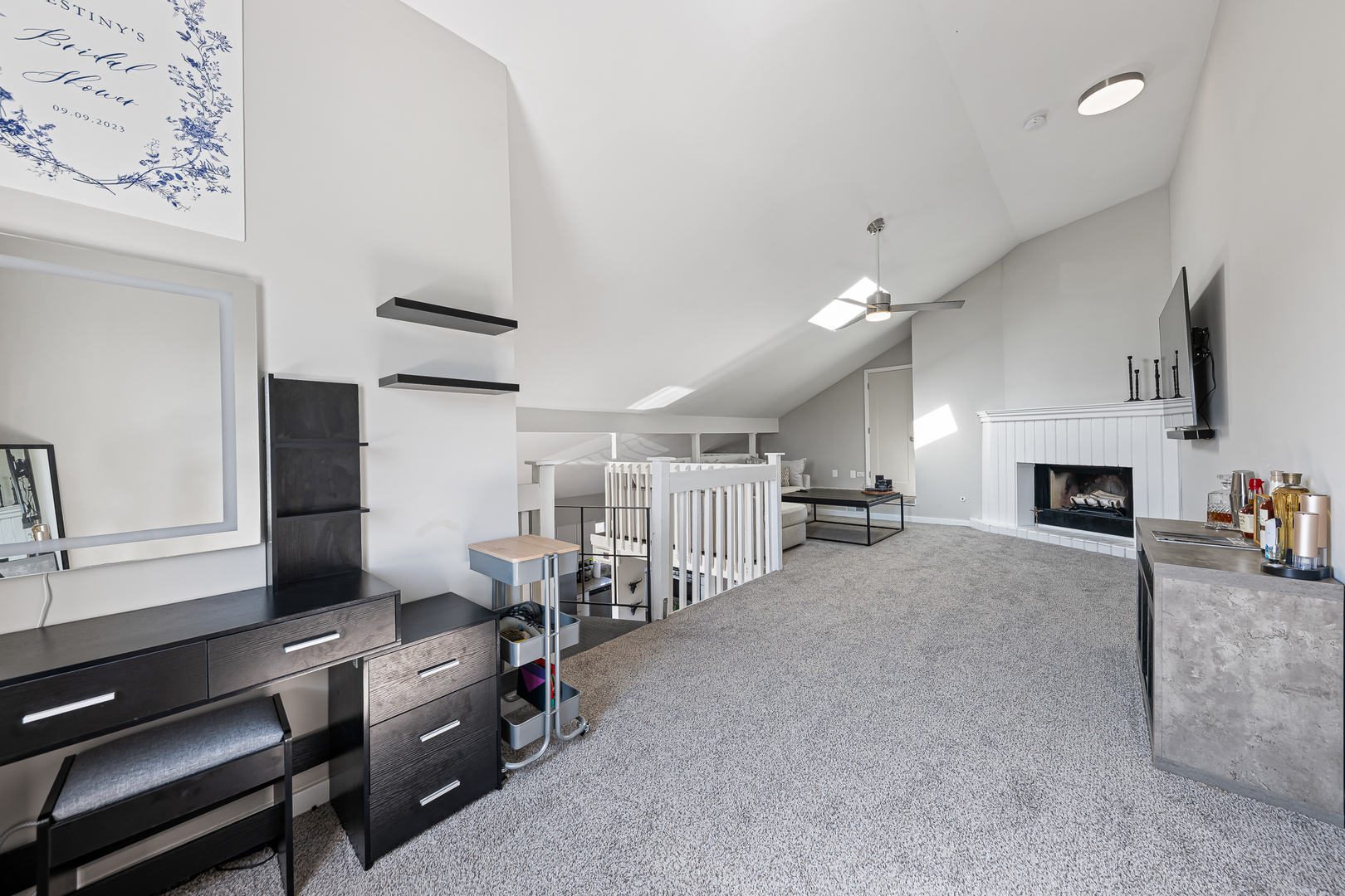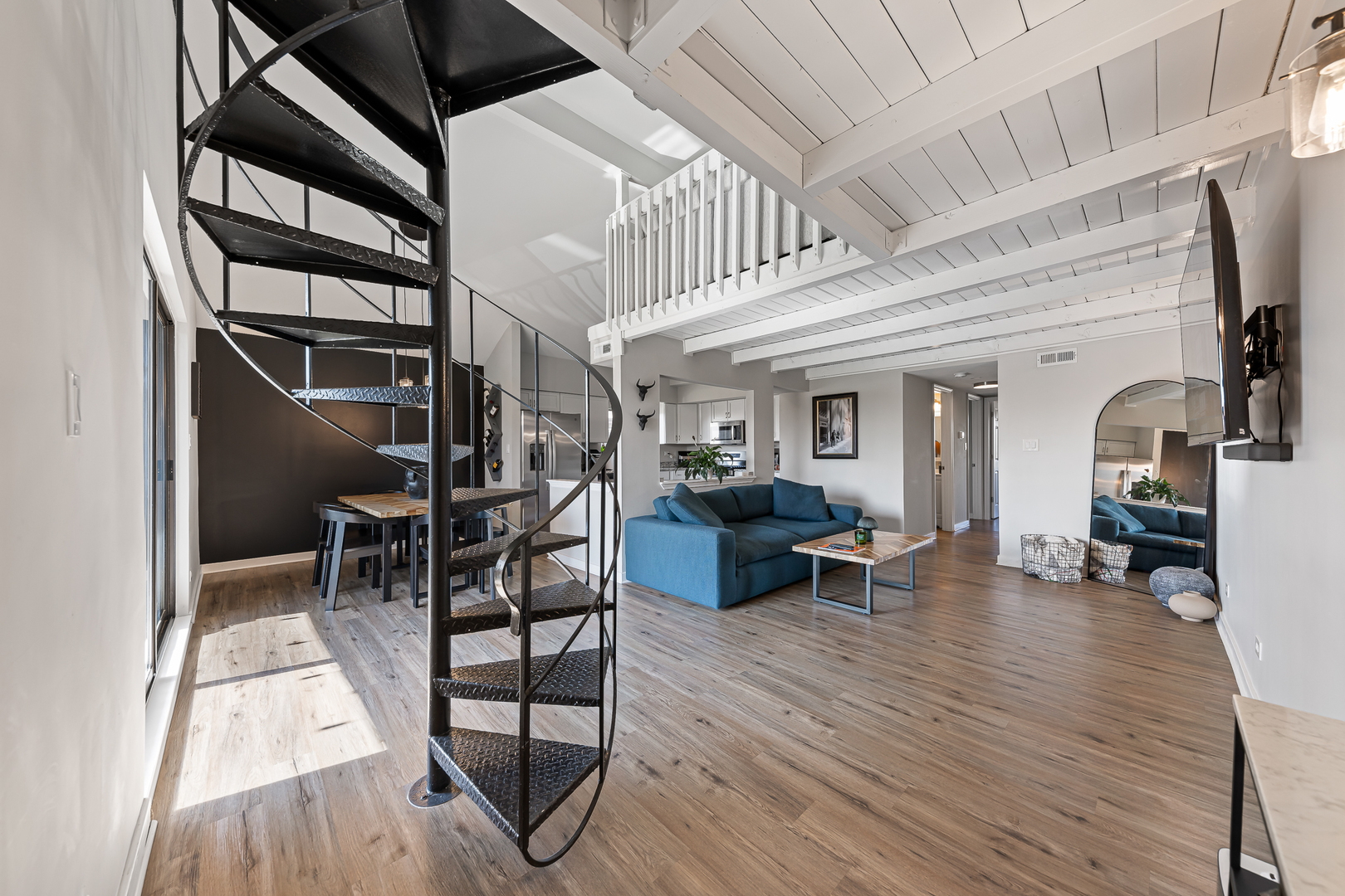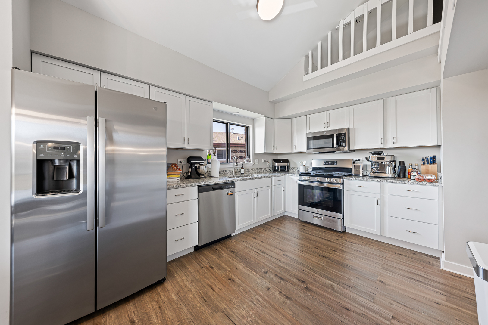 Welcome to this beautifully updated penthouse condo! Filled with natural light, this immaculate home features wood laminate flooring, 6-panel white doors, and crisp white trim for a clean, classic look. The main living area boasts a stunning beamed ceiling and an open floor plan that creates an airy, welcoming atmosphere throughout. The updated kitchen offers white shaker cabinets, granite countertops, and stainless steel appliances. Enjoy easy access to the balcony from the cozy living room and formal dining space-perfect for relaxing or entertaining. The primary suite includes dual closets and a private bathroom, while the spacious second bedroom provides comfort and versatility. Upstairs, a large loft serves as a family room highlighted by a cozy gas fireplace. Completing this exceptional home is a detached 1-car garage for added ease. Ideally located near all the best in-town amenities, this home is just minutes from Centennial Park, Harmony Square, shopping, dining, the Metra station, and interstate access. A perfect blend of style, comfort, and convenience!