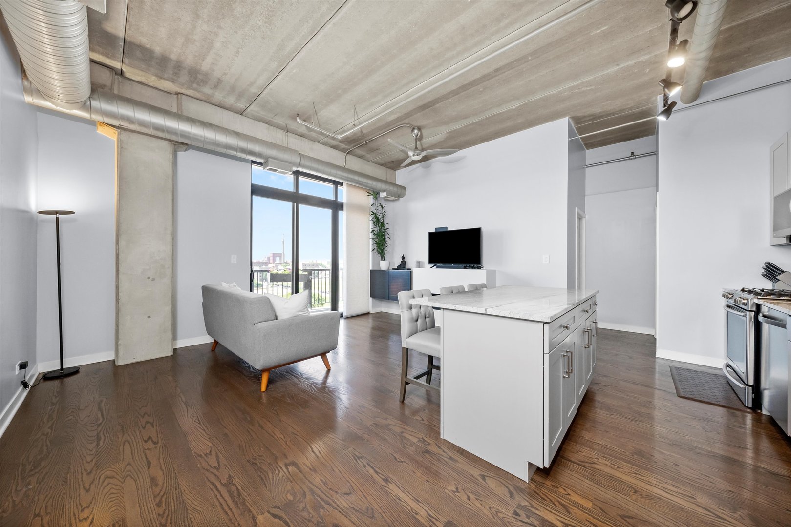 Upper-Floor Loft with Expansive Balcony and Heated Garage Space Included. Welcome to this rare upper-floor cornet unit offering the perfect blend of style, space, and convenience. This loft-style home features two spacious bedrooms, each with generous walk-in closets, and one-and-a-half updated baths. Both bedrooms are enclosed for privacy and include large windows that flood the space with natural light and fresh air. The beautifully updated kitchen is a true showstopper-featuring sleek granite countertops, a large island, all newer stainless steel appliances, and custom pull-out shelving for maximum functionality. The kitchen flows seamlessly into a warm and inviting living space highlighted by rich wood flooring, modern doors and trim, upgraded lighting, premium window treatments, and a contemporary fireplace-perfect for cozy evenings. Enjoy your morning coffee or entertain guests on the oversized private balcony, offering plenty of room to relax and unwind. This unit includes an incredible heated garage space. Residents also enjoy access to desirable building amenities, including a fully equipped fitness center, a bike storage room, a residents’ storage room, and a beautifully designed outdoor common area with a pergola-ideal for gatherings or a peaceful retreat. All this is located in a prime area with convenient access to Chicago’s major sports venues, diverse dining options, public transportation, and shopping destinations. Don’t miss the opportunity to own this exceptional home that truly has it all-location, luxury, and lifestyle.