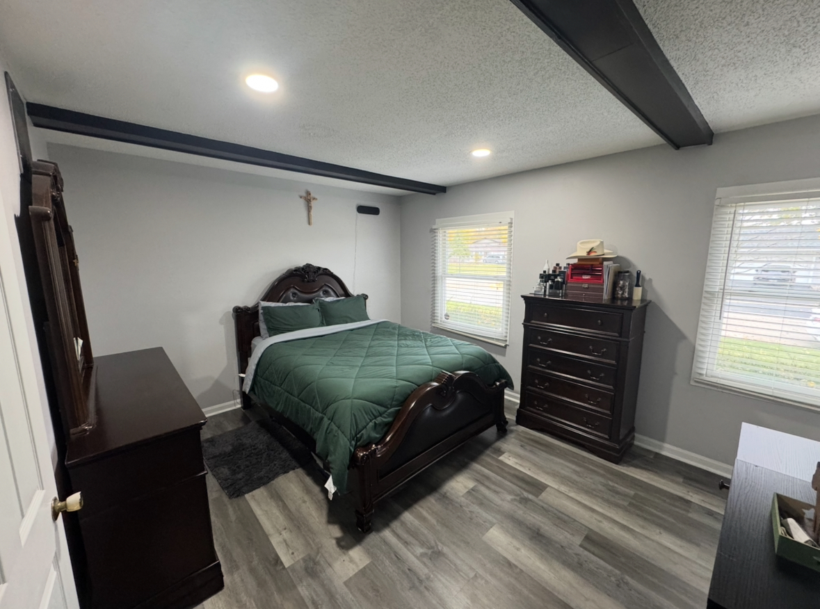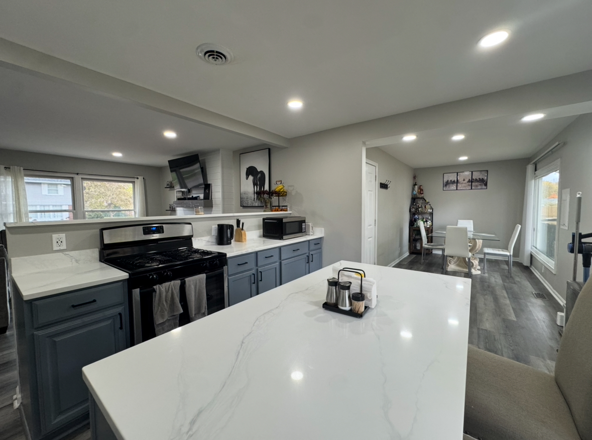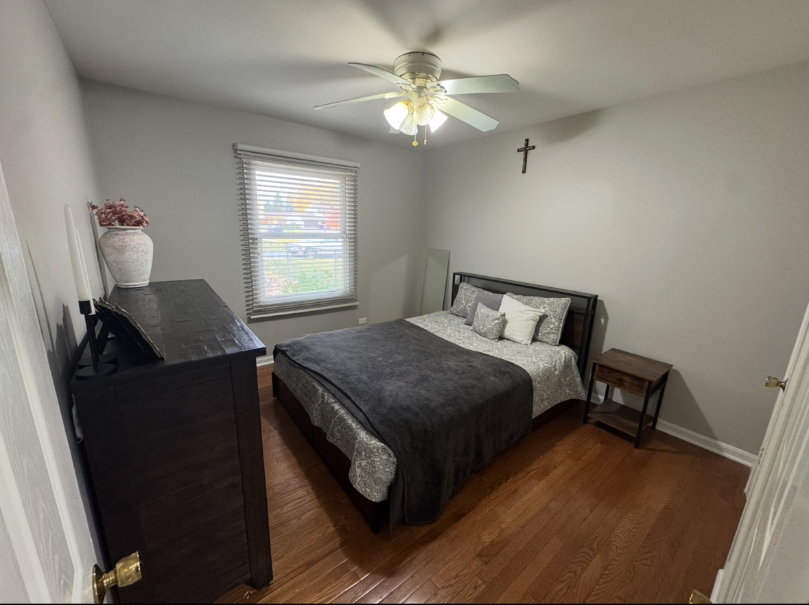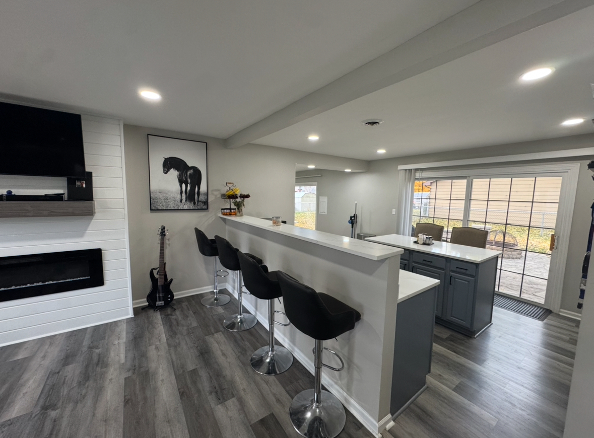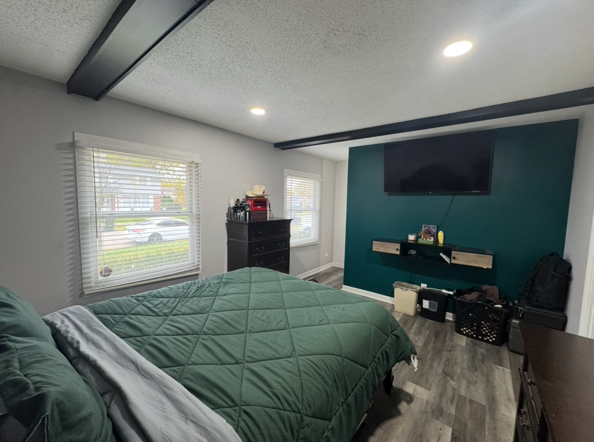 Move right into this beautifully updated brick-front ranch, perfectly situated on a large fenced corner lot with mature trees in a quiet, desirable neighborhood. This move-in ready home has been thoughtfully upgraded over the past two years, offering a blend of modern design and everyday comfort. Step inside to a bright, open layout featuring new gray flooring(2023), fresh paint(2023), new trim(2023), and recessed lighting throughout(2023). The completely redesigned kitchen(2023) includes a new layout with expanded countertops, a large island with seating for four, updated countertops, and modern appliances, ideal for cooking, entertaining & family gatherings. The family room features a custom media wall with fireplace and the primary bedroom offers generous space with wood beam accents and a walk-in closet, while the second bedroom features hardwood flooring, perfect for guests or a home office. The bathroom is well maintained and conveniently located with bluetooth lights to upgrade morning showers. Enjoy outdoor stone patio with fire pit, and a large fenced yard. Additional improvements include a new water heater(2025), Seven-year-old roof, twelve-year-old furnace, newer washer and dryer, and an attached two-car garage. Located in the highly rated Schaumburg School District, this home offers comfort, functionality, and modern style in a peaceful setting! book your tour today.