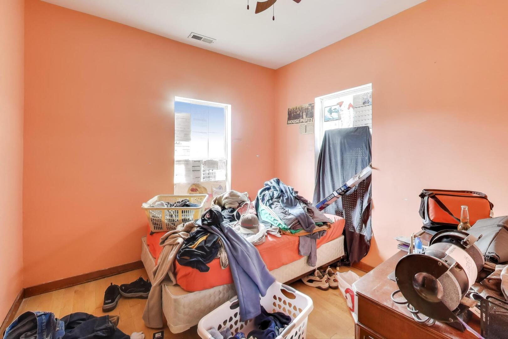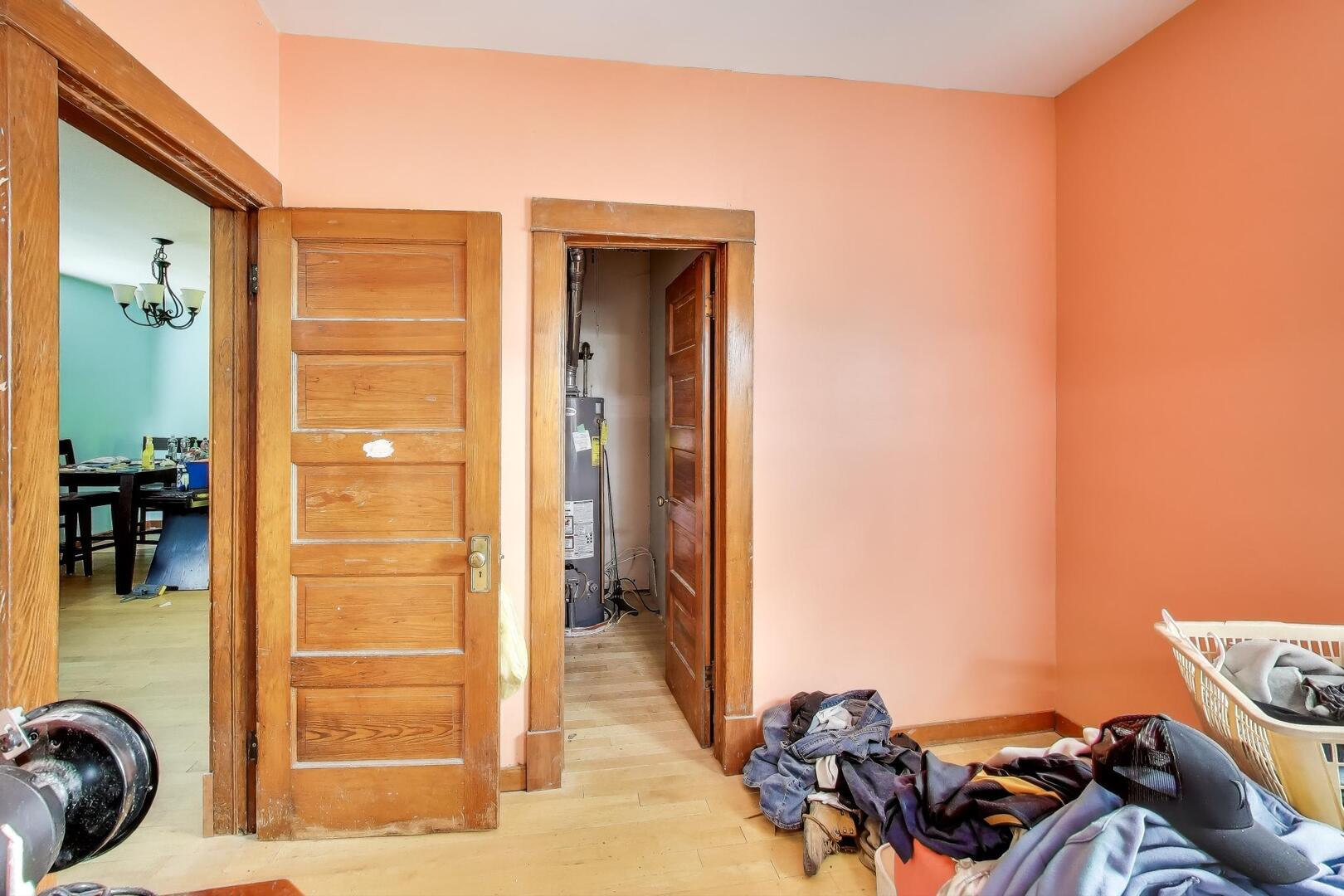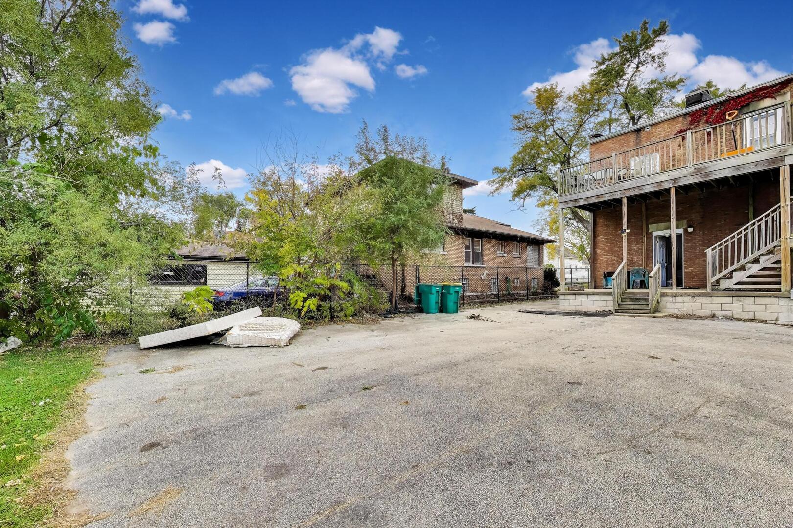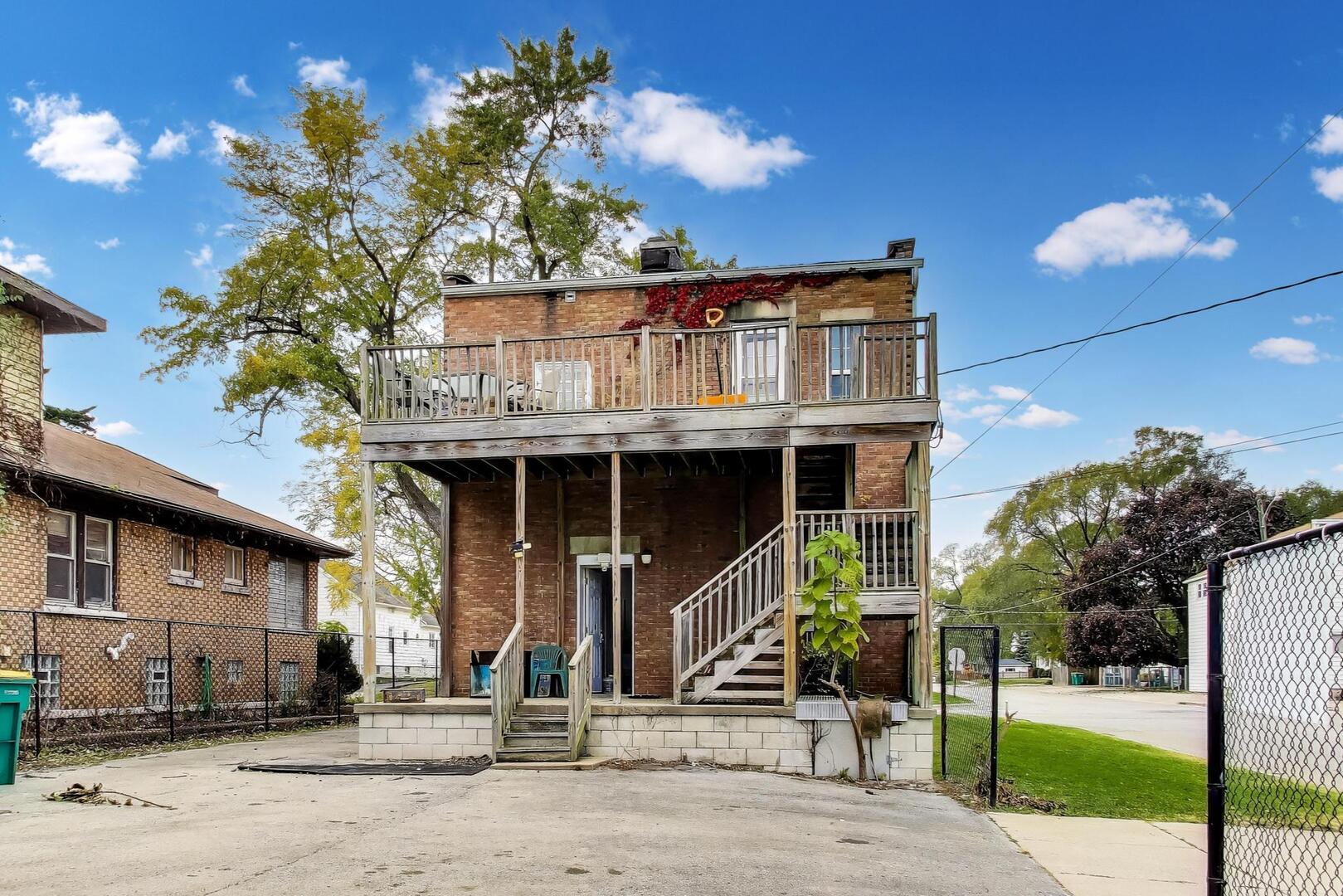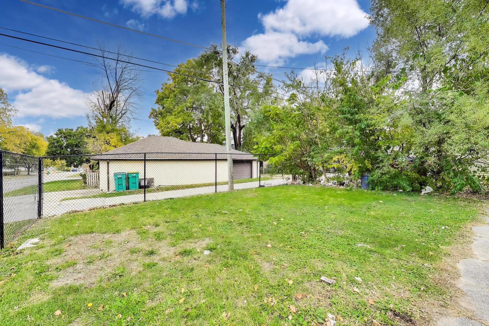 Two-story house situated on a corner lot with a fenced yard. The exterior features light-colored siding with a pitched roof and multiple windows on both levels. A concrete walkway leads to the main entrance, and an asphalt driveway provides parking. The property has a modest front lawn with mature trees and a visible side yard extending along the corner.