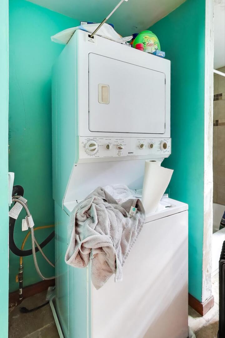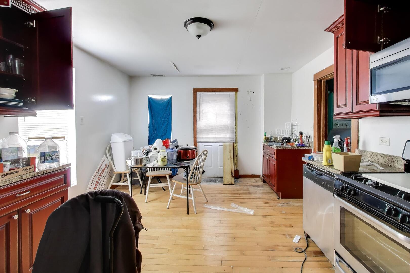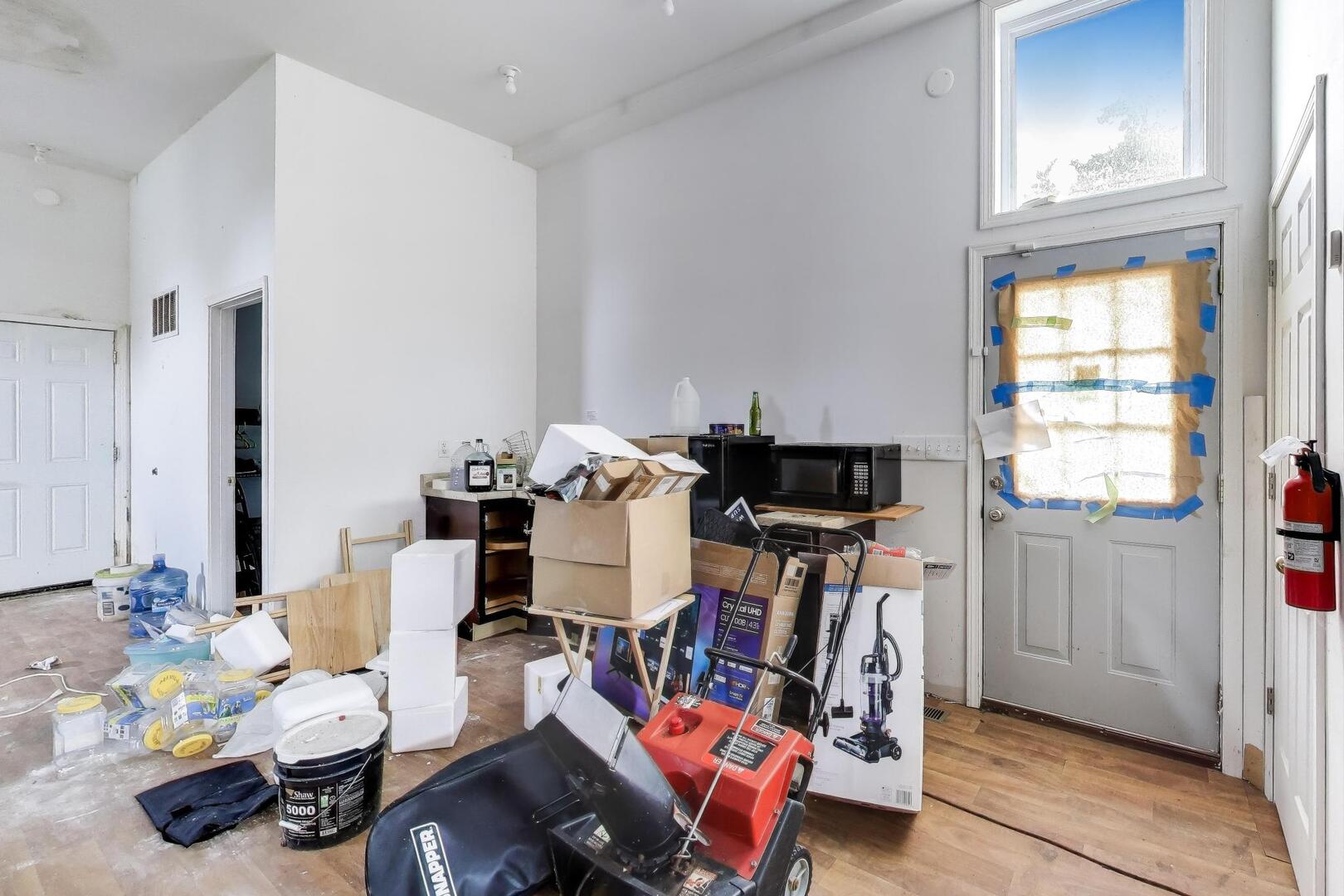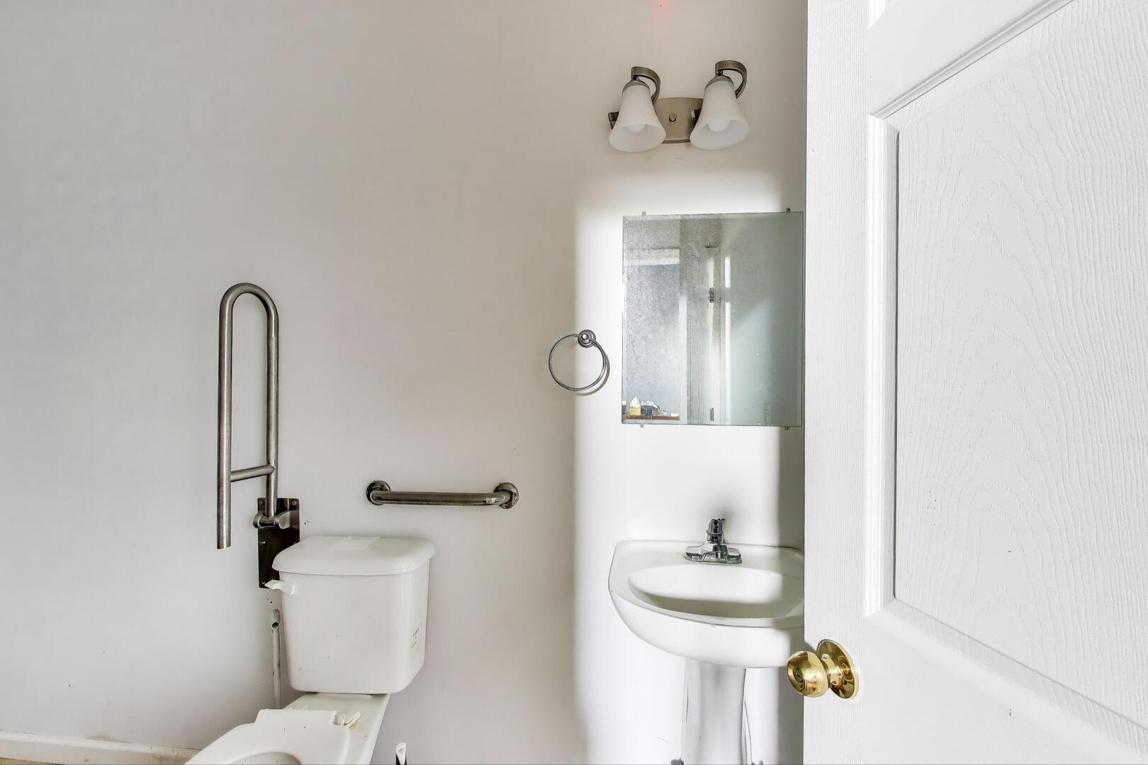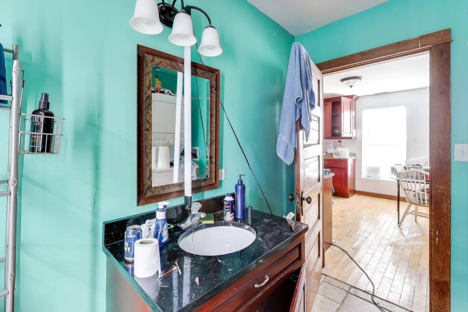 Two-story house situated on a corner lot with a fenced yard. The exterior features light-colored siding with a pitched roof and multiple windows on both levels. A concrete walkway leads to the main entrance, and an asphalt driveway provides parking. The property has a modest front lawn with mature trees and a visible side yard extending along the corner.