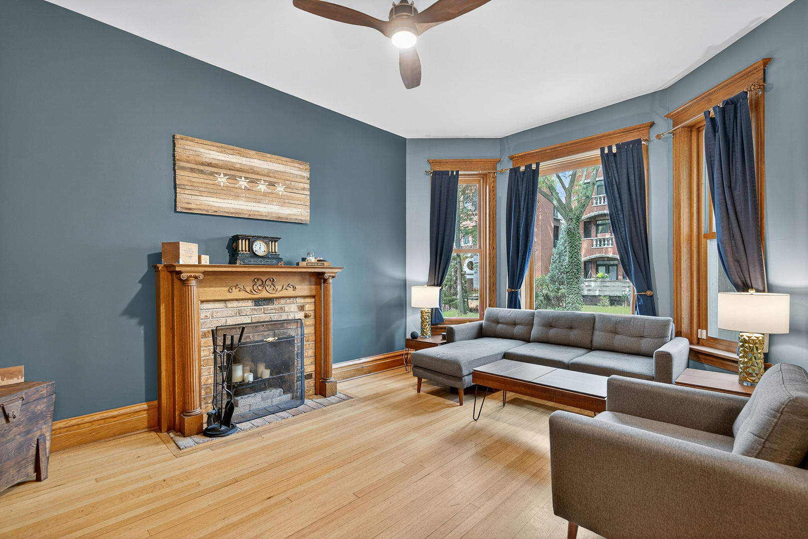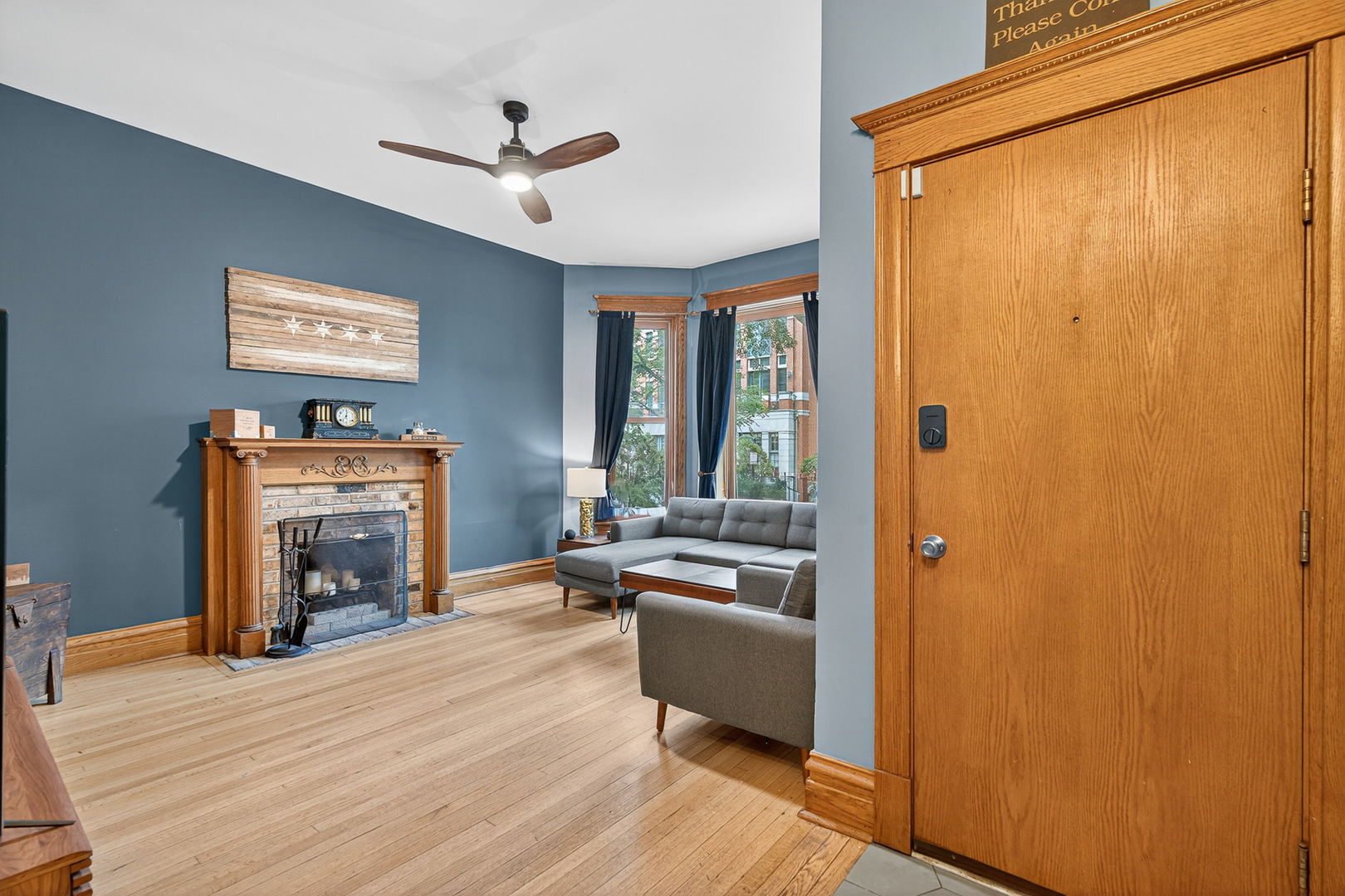 Discover the charm of this beautiful vintage building on Buckingham Place, ideally located just a stone’s throw from Wrigley Field and within walking distance of your favorite restaurants. Enjoy easy access to the lakefront and scenic bike trails, making this Chicago property a true gem. This spacious unit features two full bedrooms and two bathrooms, along with a versatile bonus room that can serve as an office or extra dining area for entertaining guests. As you step through the front door, you’ll be greeted by a large living space adorned with a decorative(gas) fireplace and expansive windows that fill the room with natural light. The woodwork throughout the home is breathtaking! The unit boasts a brand new in-unit washer and dryer(2020) for your convenience, along with a fully remodeled second bathroom with a custom walk-in shower. The kitchen has been beautifully remodeled, featuring a stylish backsplash, modern counters, and sleek hardware, complemented by stainless steel appliances and a convenient wine fridge. (2020) New light fixtures and ceiling fan throughout the home! Ecobee thermostat, Nest CO2/Smoke detectors added to home, and Furnace replaced in 2023. With a common area in the back to relax and unwind, this property truly offers a perfect blend of vintage charm and modern amenities. The basement common area offers extra laundry space and a huge assigned storage unit for the home. Don’t miss out on this must-see home in an unbeatable location!