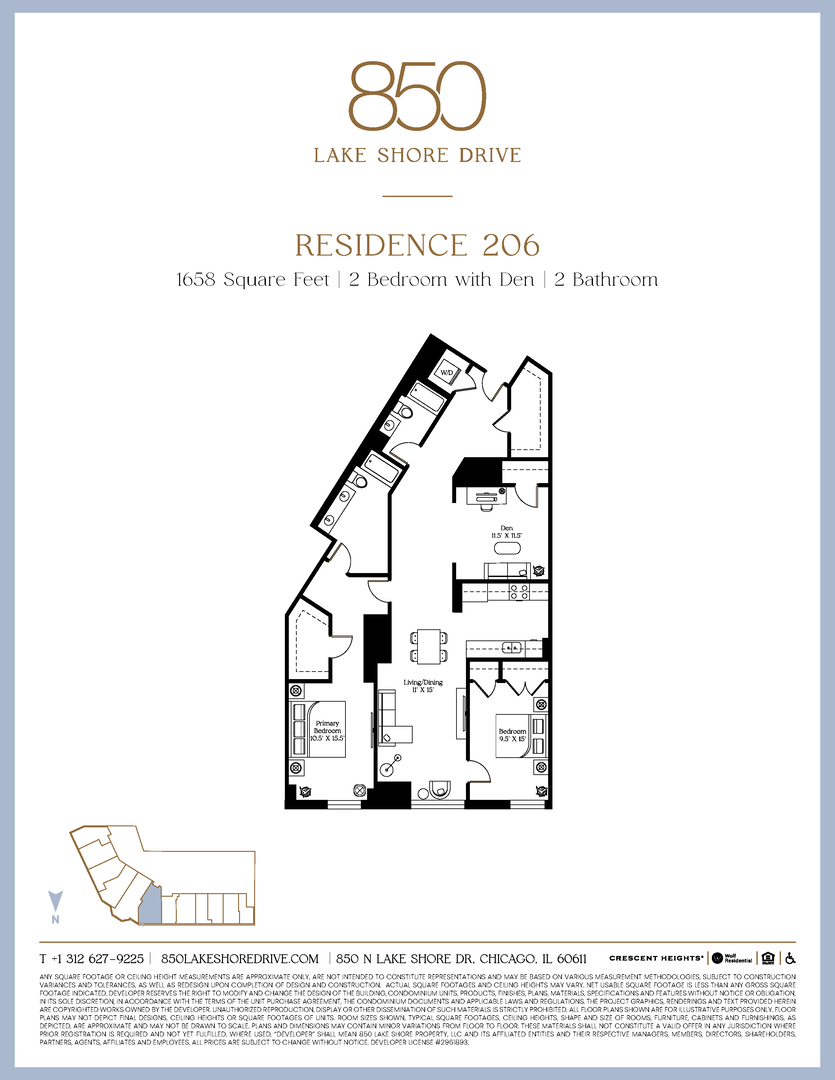 One, two, and three bedroom units available ranging from 1000-3700+ square feet. 206 is a 1658 sq ft two-bedroom with multi-purpose den, 9′ ceilings, loads of closets, galley kitchen with all new SS Bosch kitchen appliances and new, in-unit Whirlpool washer and dryer. This beautifully renovated historical building, nestled along Chicago’s picturesque lakefront, seamlessly combines timeless elegance with contemporary luxury. Step into the magnificent lobby, and you’ll instantly be transported to a modern take on a classic, surrounded by exquisite architectural details that showcase the craftsmanship of this iconic structure. From intricately carved moldings to soaring ceilings adorned with stunning chandeliers, every inch of this building exudes a sense of grandeur. 206 where old-world charm effortlessly merges with modern design, creating a harmonious balance between style and functionality. But it’s not just the interiors that set this building apart. It also offers a wide range of amenities designed to enhance your lifestyle. Take a dip in the heated indoor pool, work up a sweat in the state-of-the-art fitness center, or host unforgettable gatherings in the expansive 3,500-square-foot Grand Lounge, complete with soaring 20-foot ceilings and breathtaking views of the lake. The rooftop deck greets residents with mesmerizing vistas of Lake Michigan. Picture yourself savoring your morning coffee as the sun rises over the water or hosting memorable events against the backdrop of the city’s skyline and the serene lakefront. Beyond the building’s beauty, its location is unparalleled. Situated between Michigan Avenue and Lake Shore Drive, this residence offers access to the vibrant cultural scene, world-class dining options, and the finest shopping experiences that the city has to offer. Whether you’re leisurely strolling along the scenic lakefront trail, exploring nearby museums, or enjoying a day at the beach, everything you desire is at your front door. **Photos and renderings are of model residences, virtually staged amenities and lobby. These are representative of inventory available or optional finish upgrades and may not exactly represent this listing unit. The design choices represented in the renderings are proposed options reflecting general design inspiration and considerations. All design intent is subject to change. A variety of floorplans and finish packages are available.**
