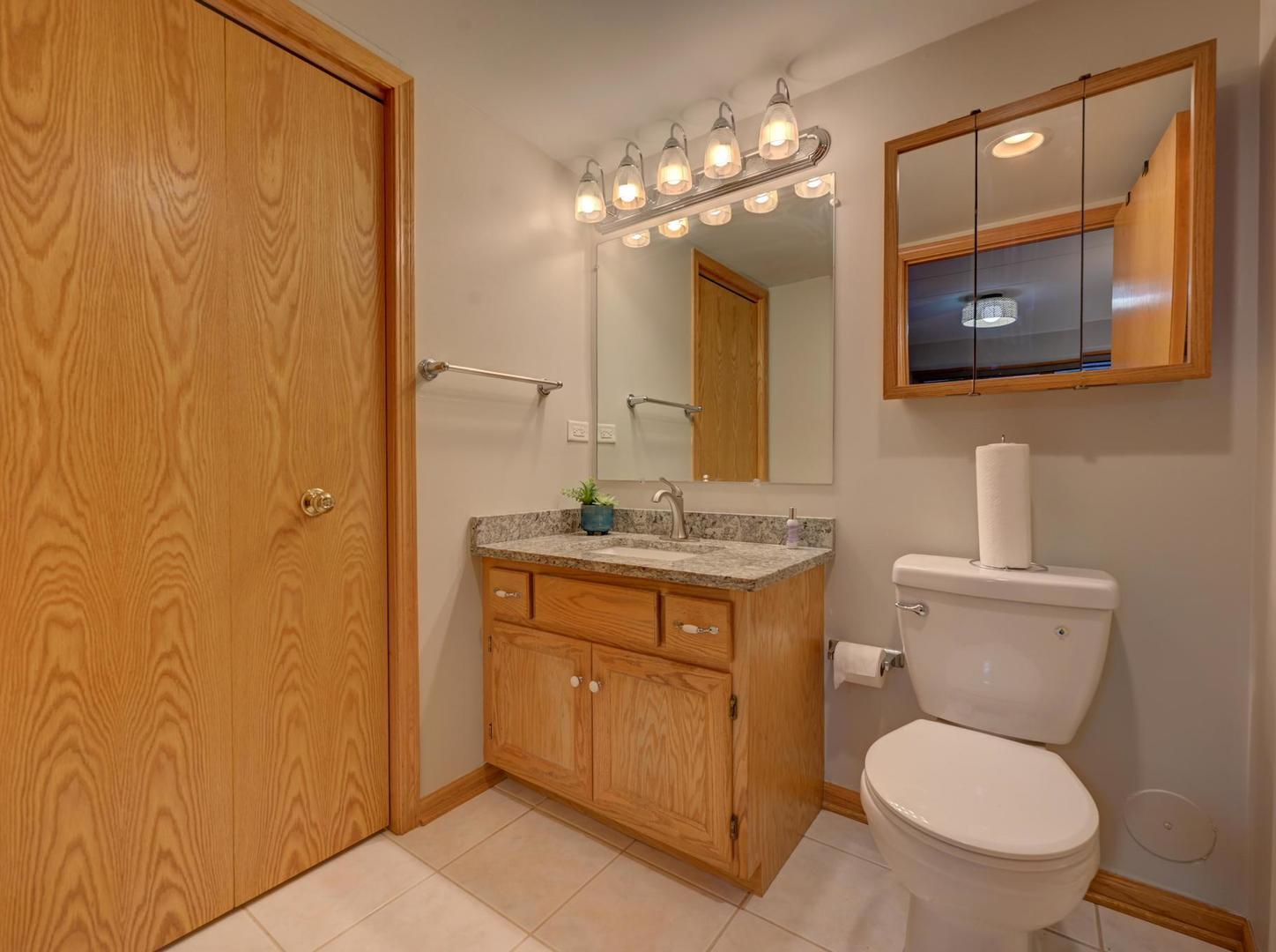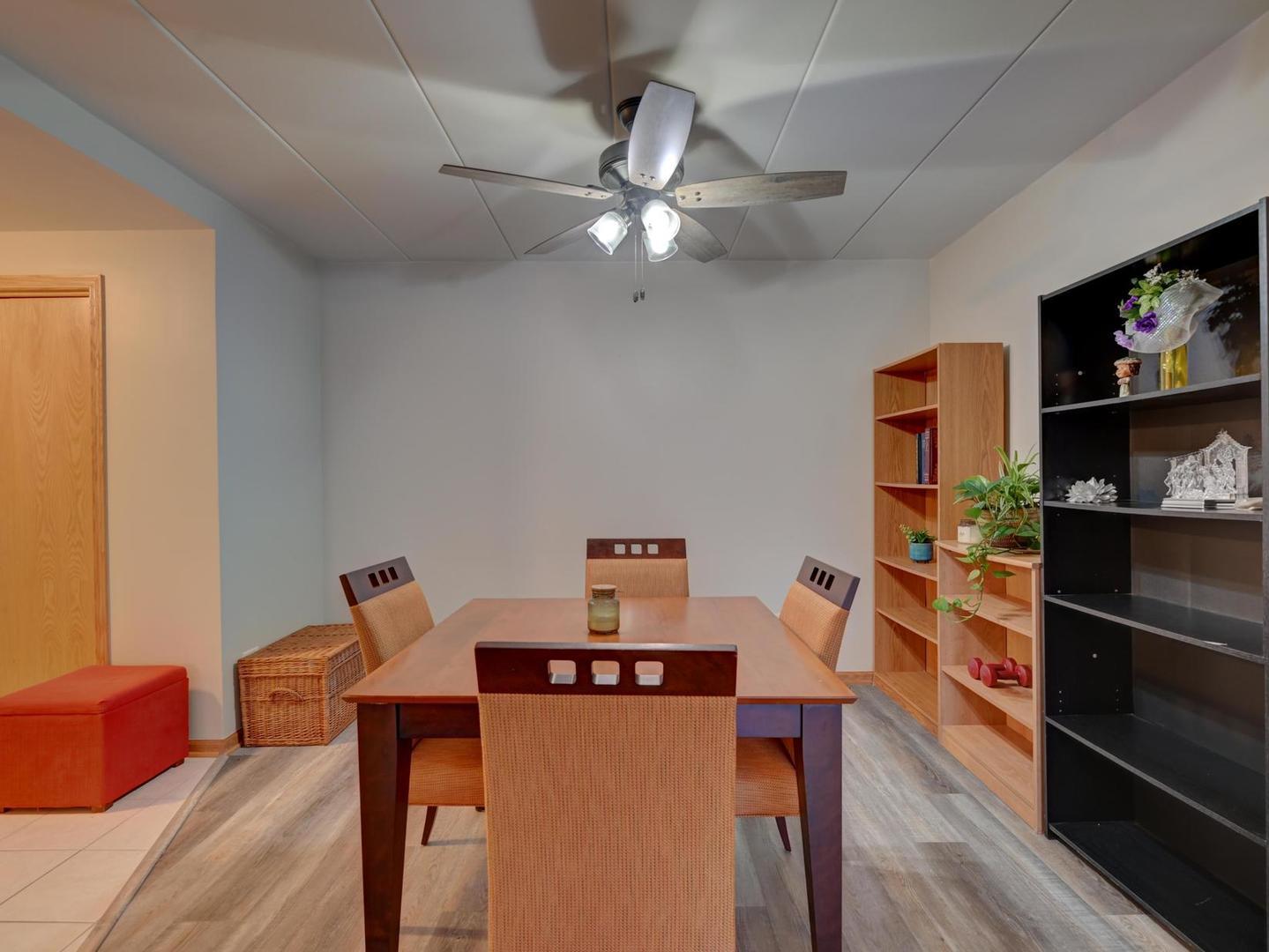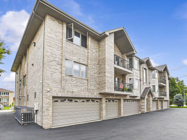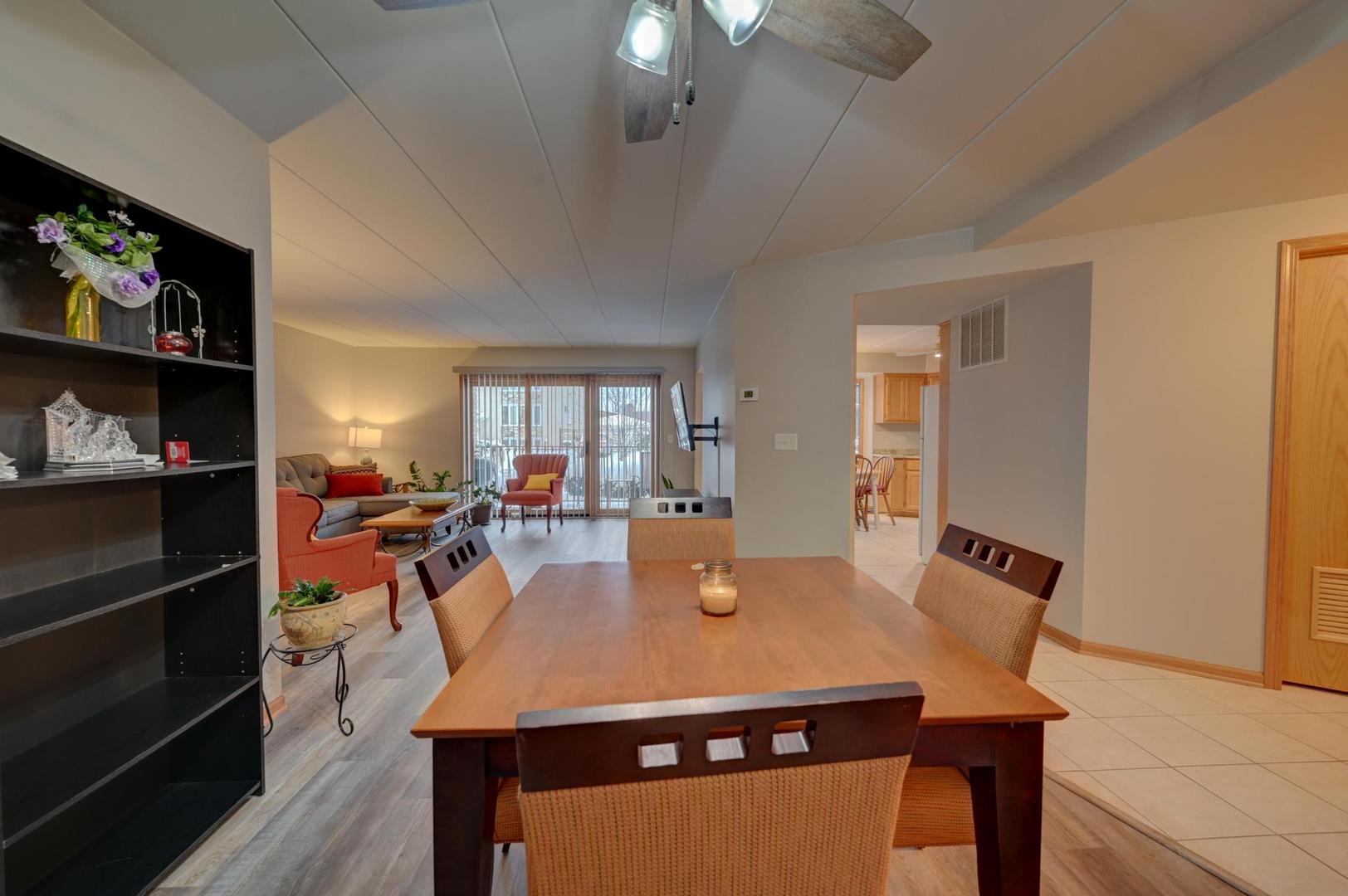 Beautiful and spacious 2-bedroom, 2-bath condo in a quiet, impeccably maintained elevator building. This bright and inviting home features a large open-concept living and dining room with new luxury vinyl plank flooring. Enjoy an eat-in kitchen with ceramic tile flooring, granite countertops, custom oak cabinets, and oak trim throughout. The primary suite includes its own private bath and a large walk-in closet. Additional features include in-unit laundry, beautiful ceiling fans, custom blinds in the living room and bedrooms, and carpeted bedrooms for comfort. Relax on your private balcony with its own storage closet. This home also includes a heated indoor garage space, an additional outdoor parking space, and a separate storage room. Updates include a new dishwasher (2025) and recent hot water heater, A/C, refrigerator, washer, and dryer. The building offers clean, well-maintained hallways and is camera-monitored for added peace of mind. Excellent location close to shopping, public transportation, schools, restaurants, and a movie theater. Nothing to do but move in and enjoy this beautiful home!