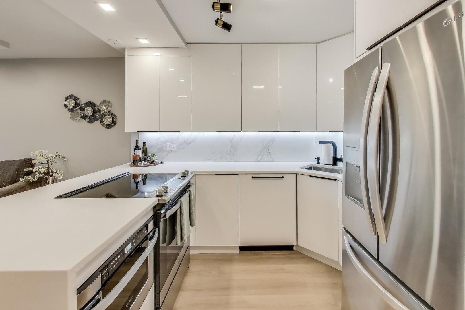 Step into luxury living with this brand-new, fully rebuilt one-bedroom home at Lowell House, perfectly positioned between Old Town and the Gold Coast. Every detail has been thoughtfully curated – from the chef’s kitchen with custom gloss cabinetry, quartz waterfall peninsula, LED lighting, and Bosch/Sharp appliances, to the spa-quality bathroom with a walk-in glass shower, Hansgrohe & Kohler fixtures, and striking black-gold accents.The bedroom is a true retreat with a custom-organized closet and automated lighting, while wide-plank floors, recessed lighting, UV-coated windows, and air-purifying paint create a bright, healthy, and stylish atmosphere throughout. Lowell House is a boutique building within Sandburg Village, offering the best of city living with updated amenities (new windows, laundry, lobby, and facade), strong reserves, and services including door staff, on-site maintenance, storage, bike room, and garage parking ($170/mo). Low assessments also include heat, cable, and internet. Enjoy exclusive access to Sandburg Village’s pools, tennis & pickleball courts, landscaped courtyards, playground, party rooms, and rooftop deck with city views. All of this in a prime location, steps to CTA trains, buses, Lake Shore Drive, the lakefront trails, Jewel, restaurants, shopping, parks, and the best of Chicago nightlife. Investor friendly: No rental cap and only a 1-month lease minimum