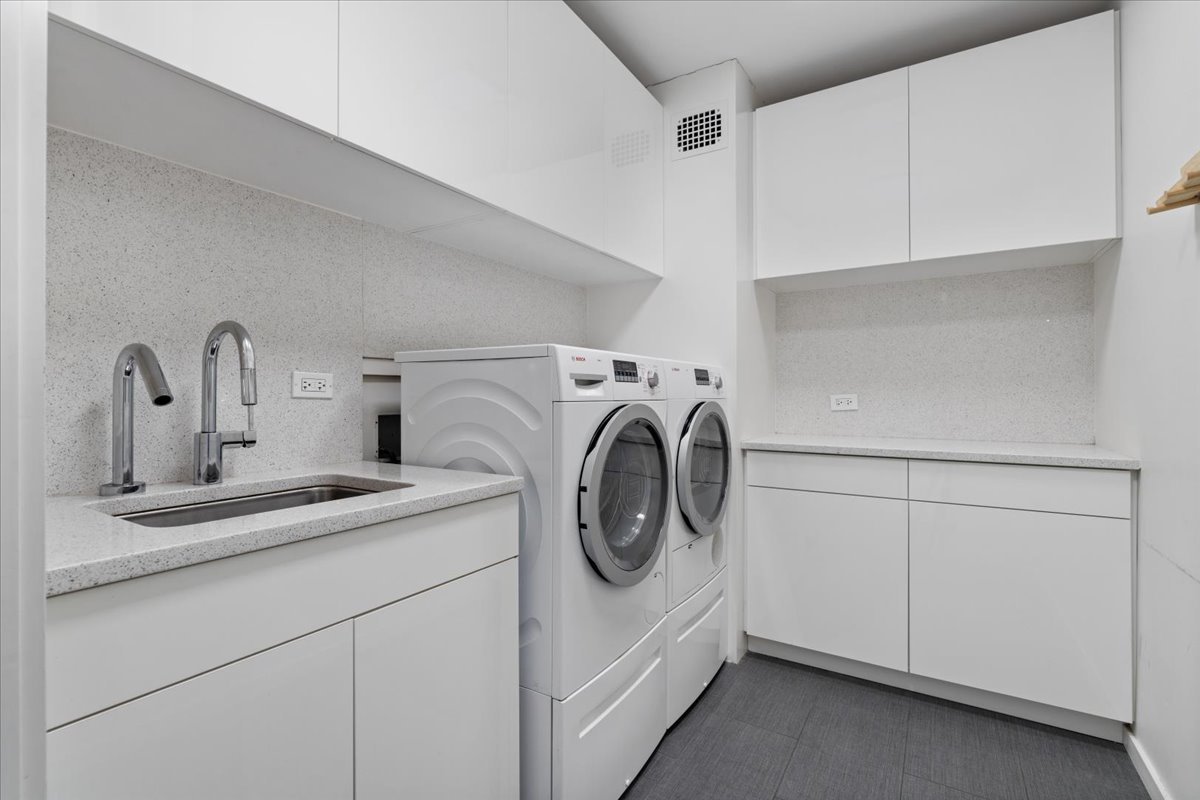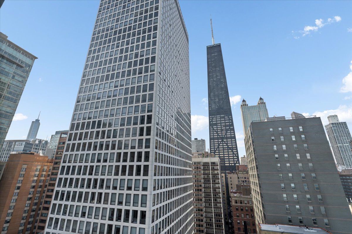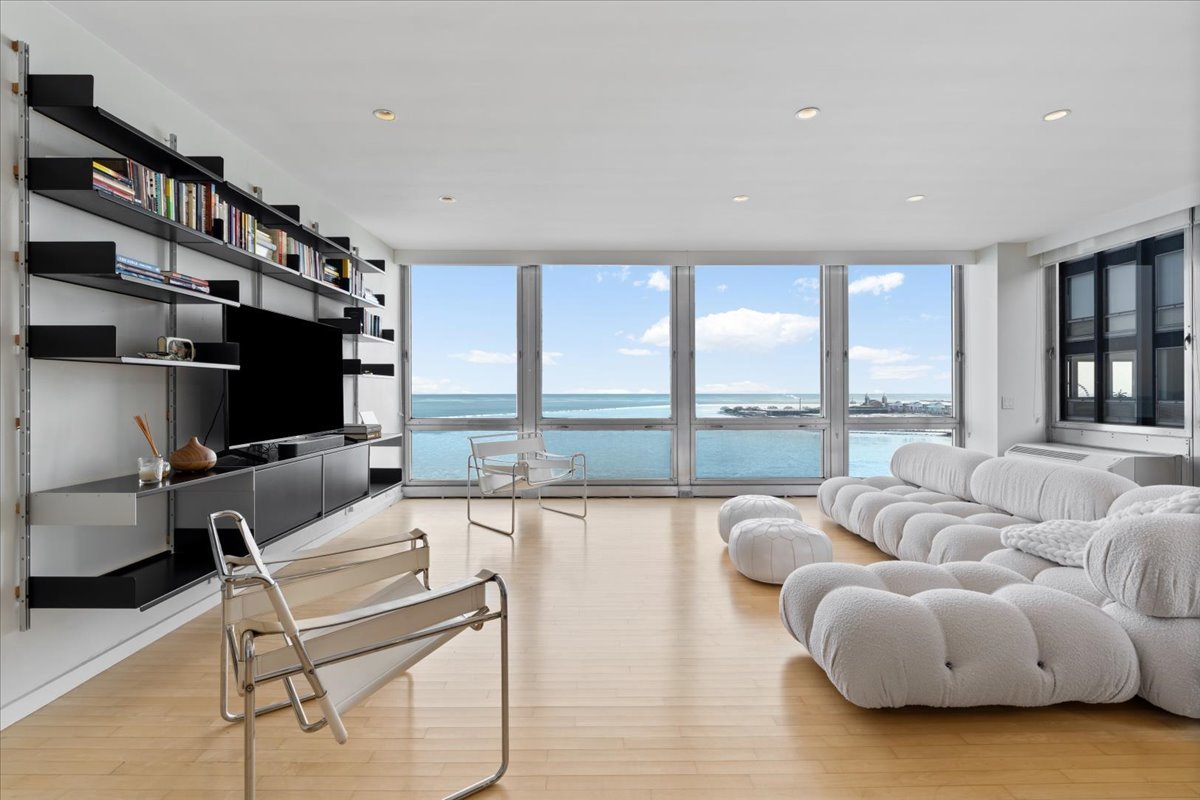 Experience sweeping Lake Michigan views including spectacular front row seats to the Navy Pier fireworks, Air and Water show, the Playpen and much more from the living room! This exceptional home was created by combining two south-facing residences in an iconic Mies van der Rohe building, resulting in a light-filled two-bedrooms each with an en suite bath enhanced by floor-to-ceiling windows throughout. Thoughtfully curated interiors feature maple flooring, recessed lighting, upgraded tile, and abundant custom storage throughout. The open kitchen is outfitted with a Sub-Zero refrigerator, Miele appliances, and sleek Vitsoe shelving in the living space; while the laundry room includes a Bosch washer and dryer with Corian counters and backsplash. The primary bedroom is a serene retreat with the city skyline and Hancock Building as the backdrop. It features exquisite custom drapery, electric blinds, a walk-in closet with two chandeliers, a dedicated work-from-home area, and a spa-like bath appointed with upgraded tile, concrete surfaces, illuminated mirrors, and a generous linen closet. The co-op dues include ALL utilities as well as property taxes! 2 oversized storage units are included!